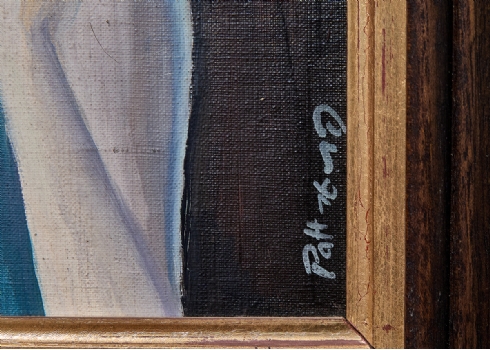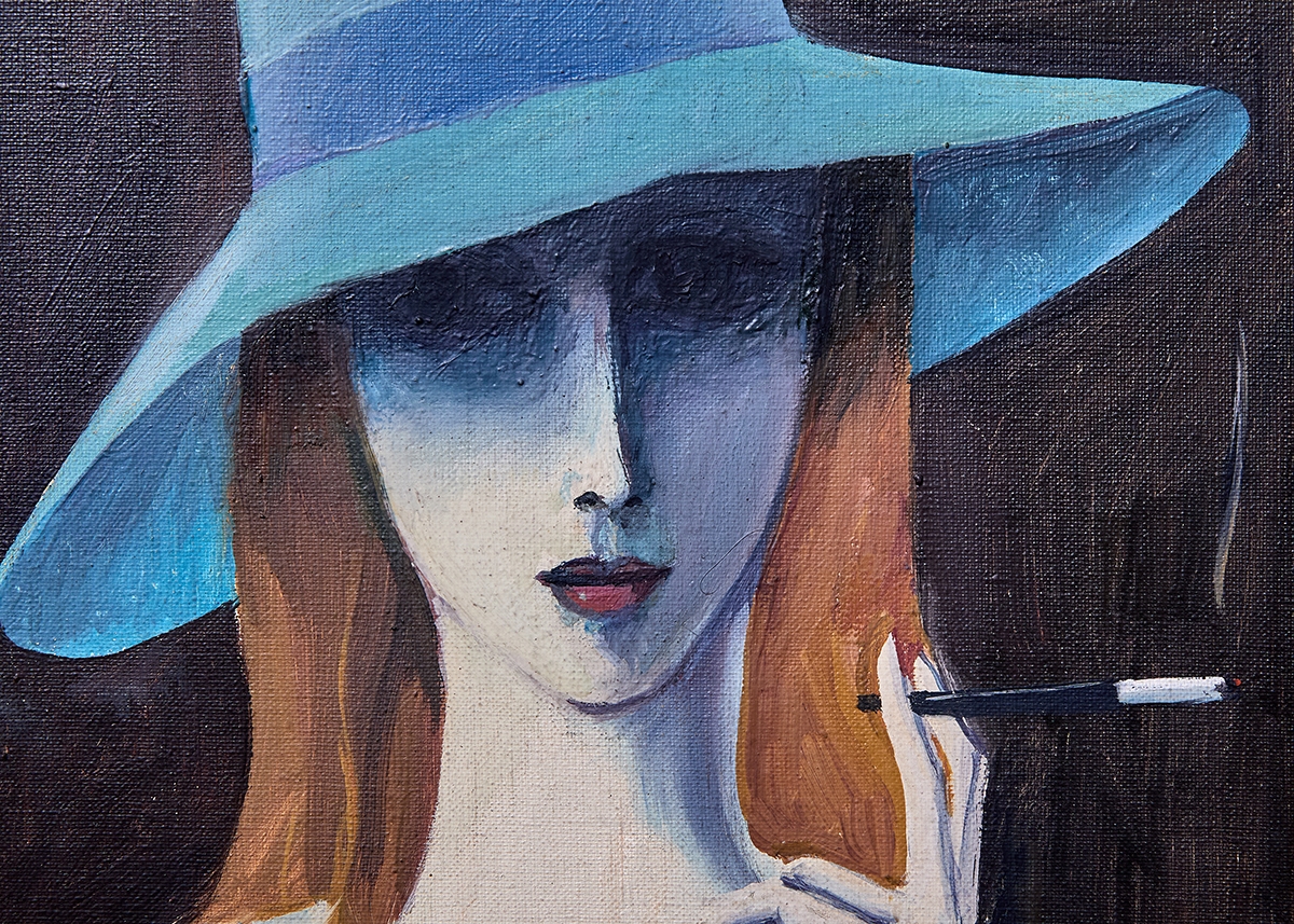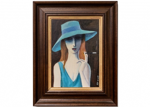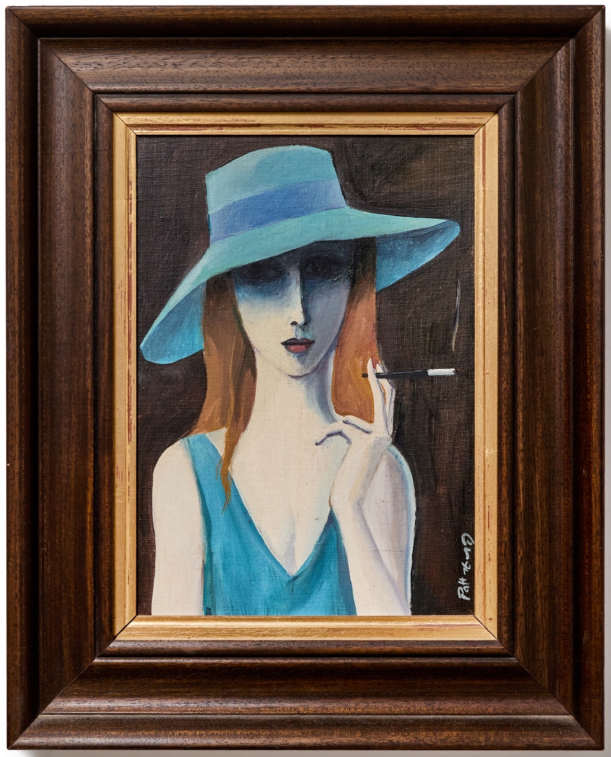 אברהם פת - 'אישה מעשנת עם כובע כחול' שמן על בד צרפתי, חתום ומתוארך 1976