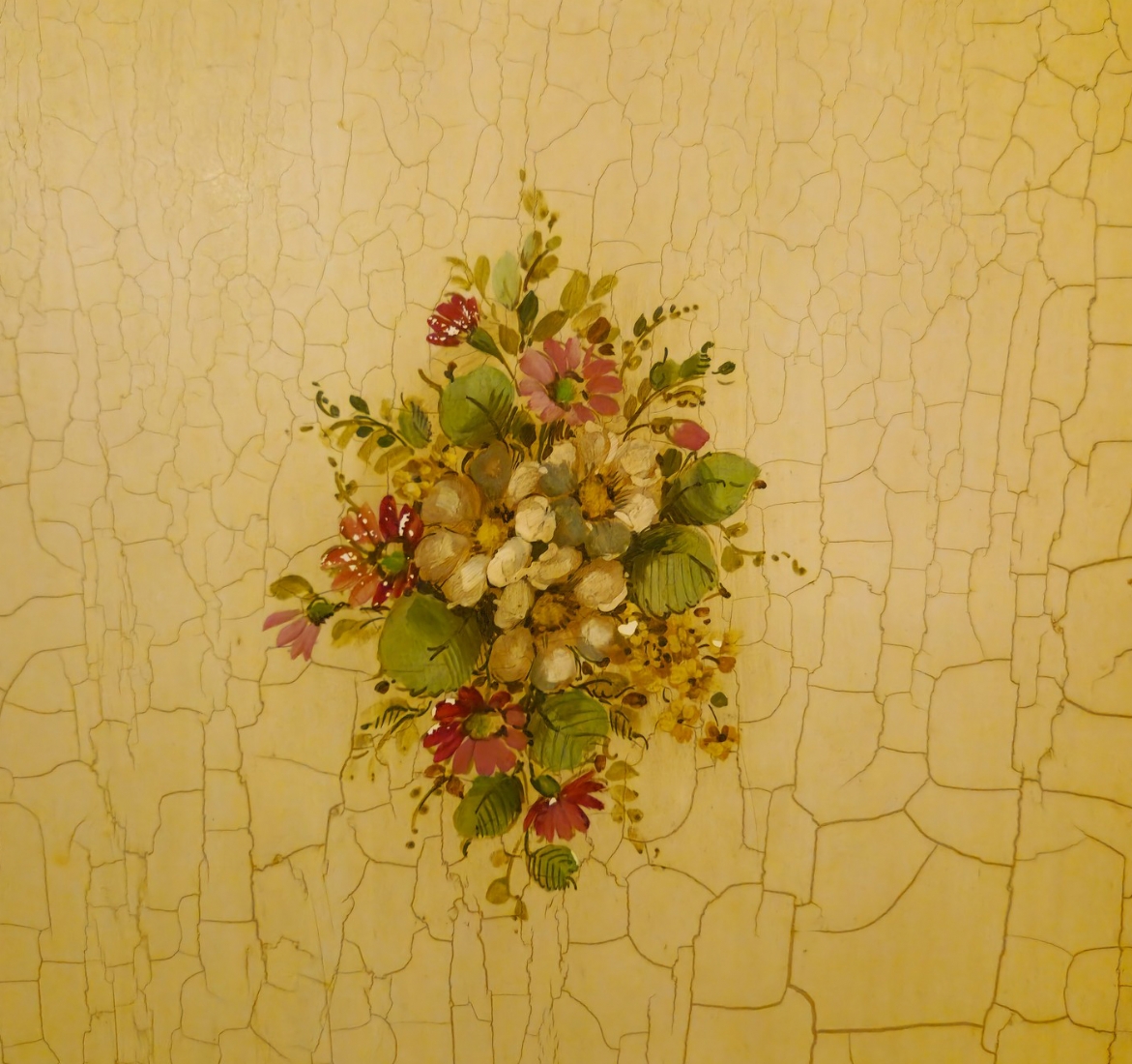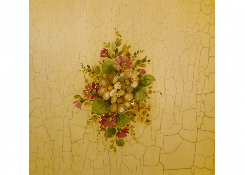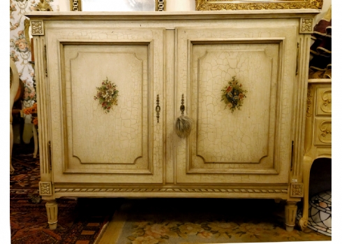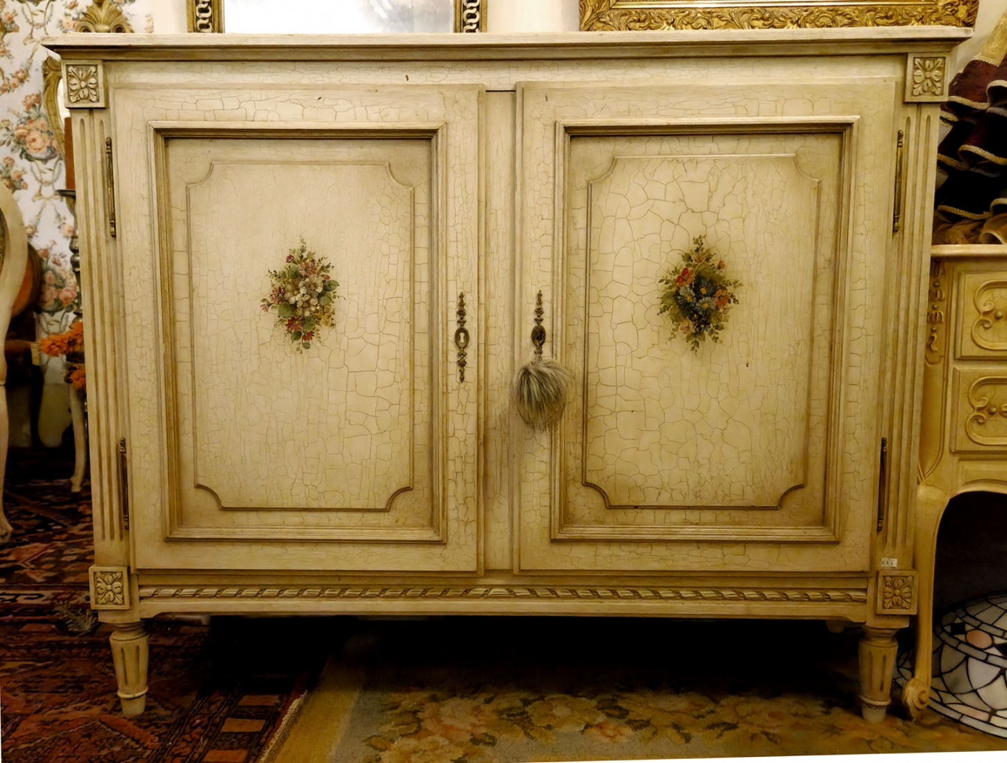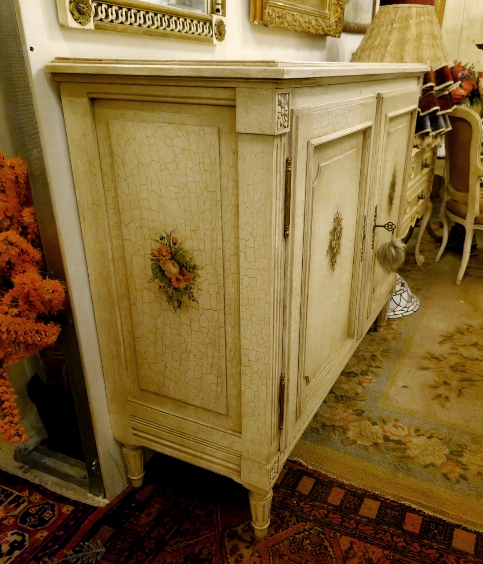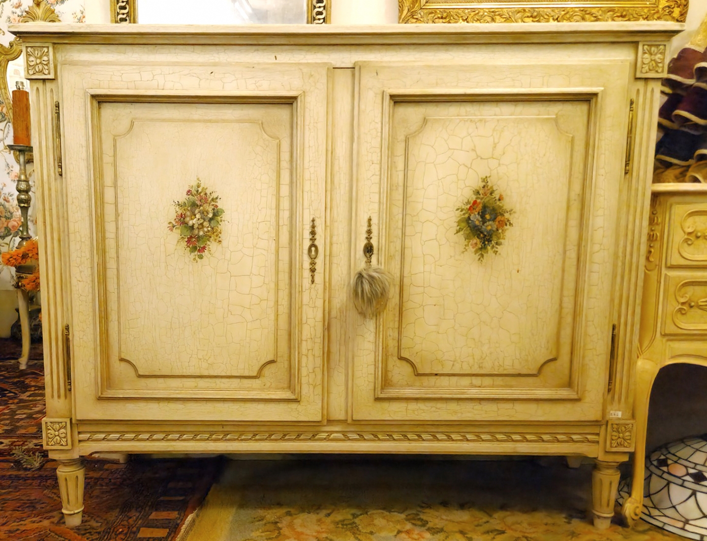 מזנון בסגנון עתיק עשוי עץ צבוע בגוון שמנת מעוטר בציורי יד בצבעי שמן של זרי פרחים