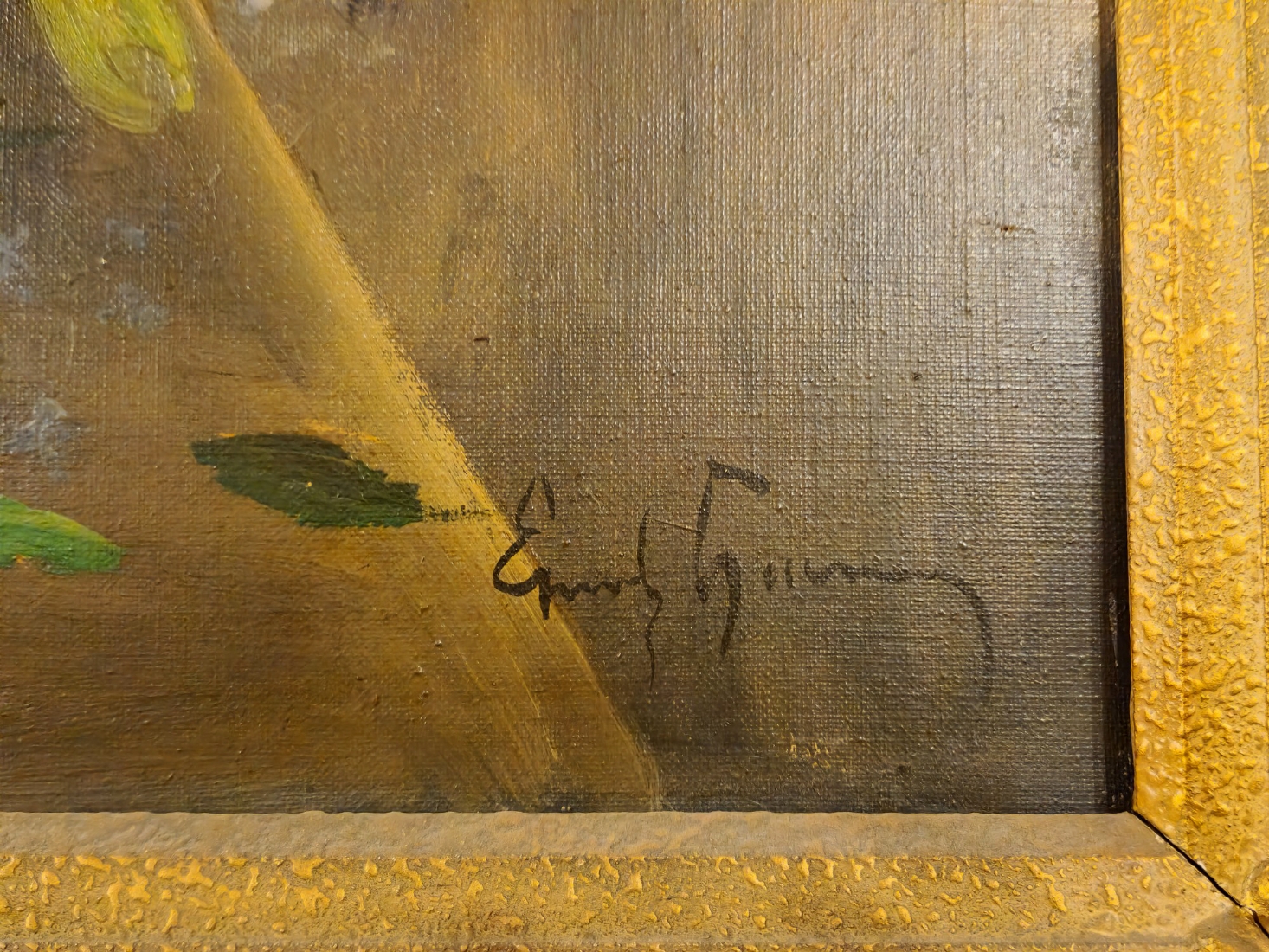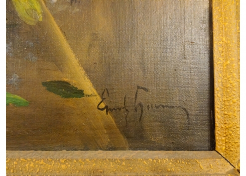 פרחים בכלי על שולחן - ציור שמן על בד חתום, נתון במסגרת נאה