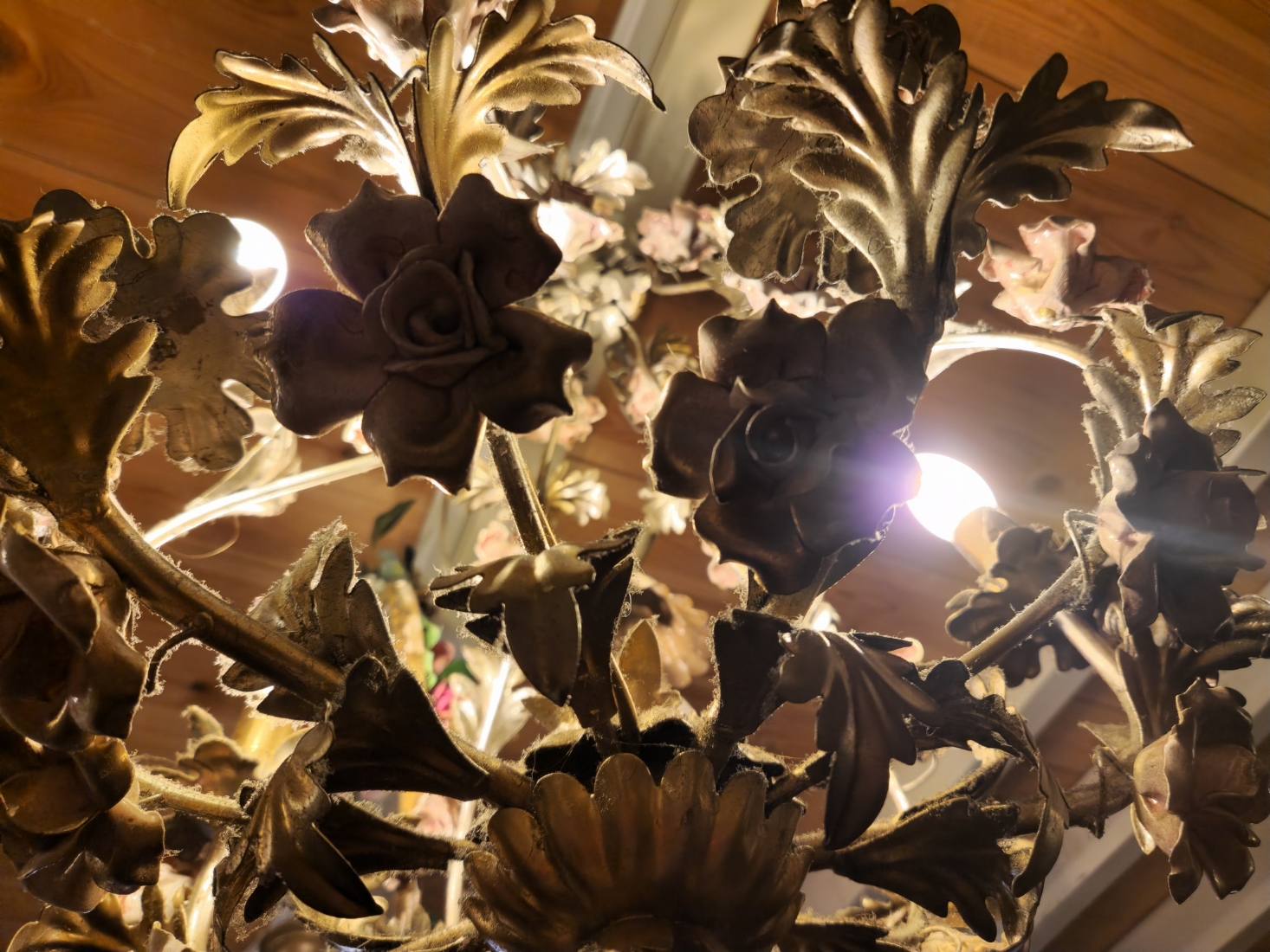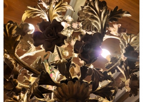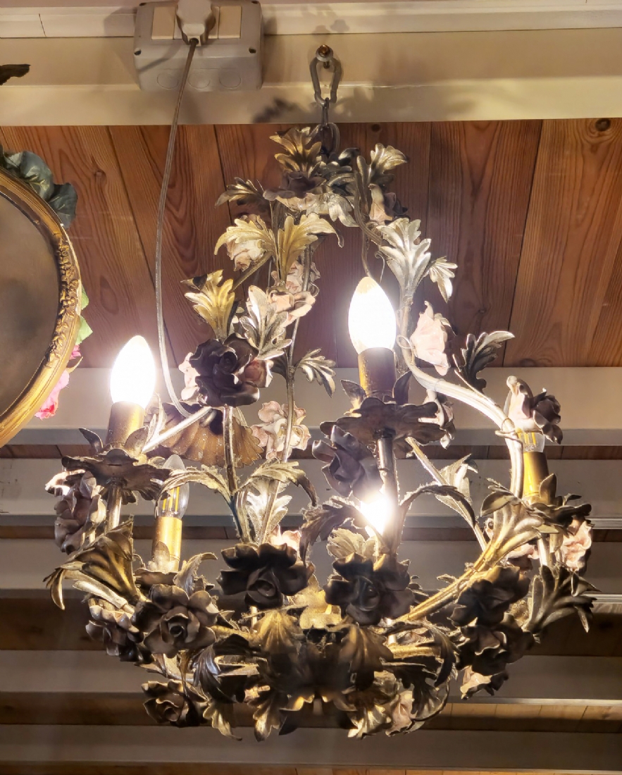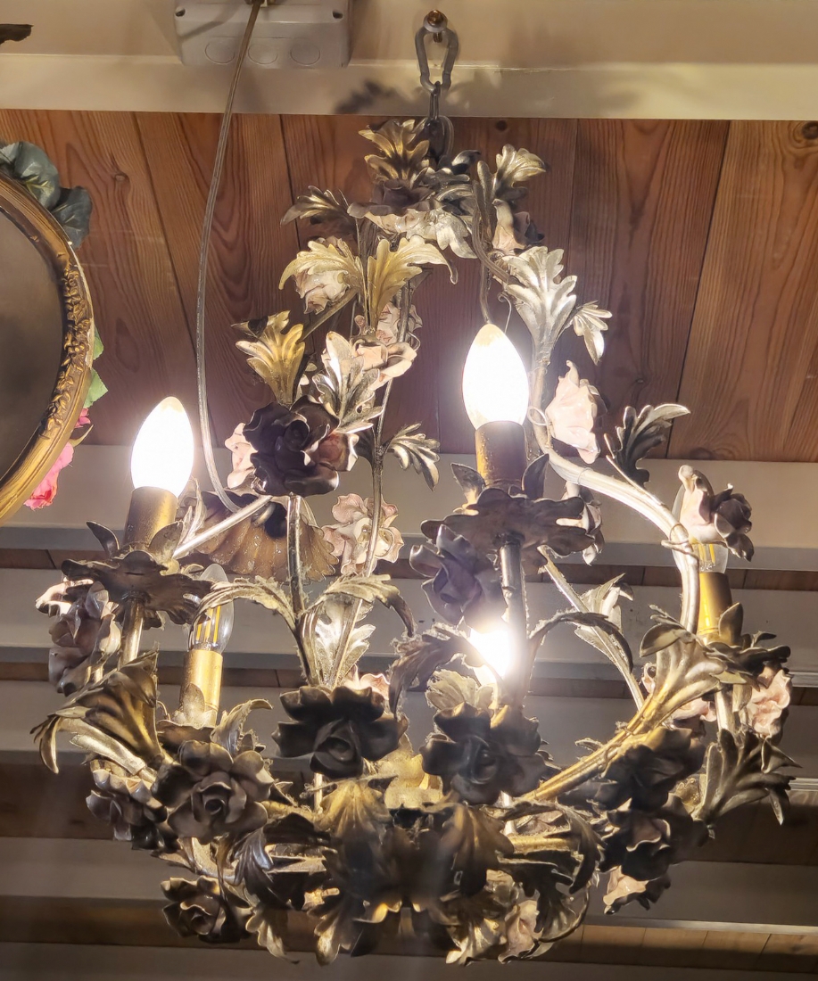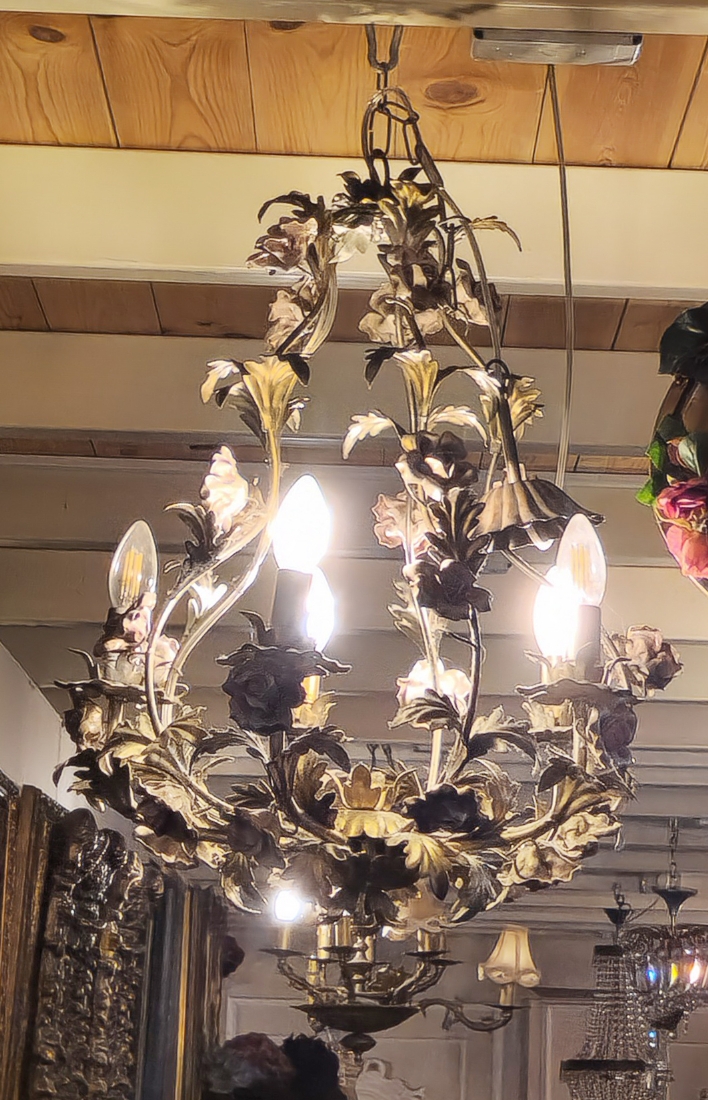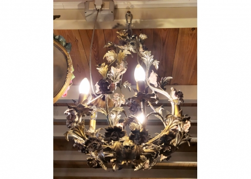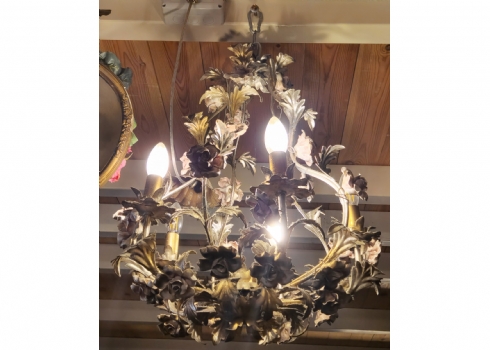 מנורת תקרה בסגנון צרפתי עתיק עשוייה מתכת ופרחים צבועיים באמייל