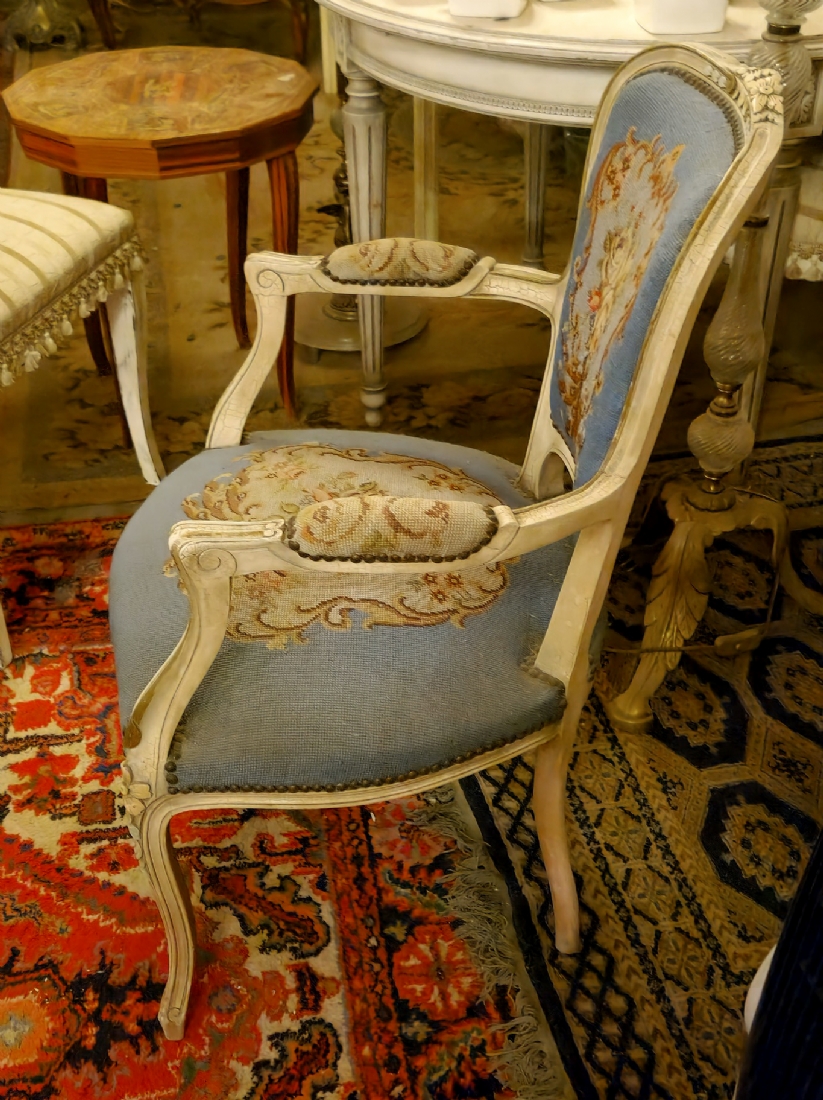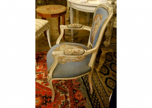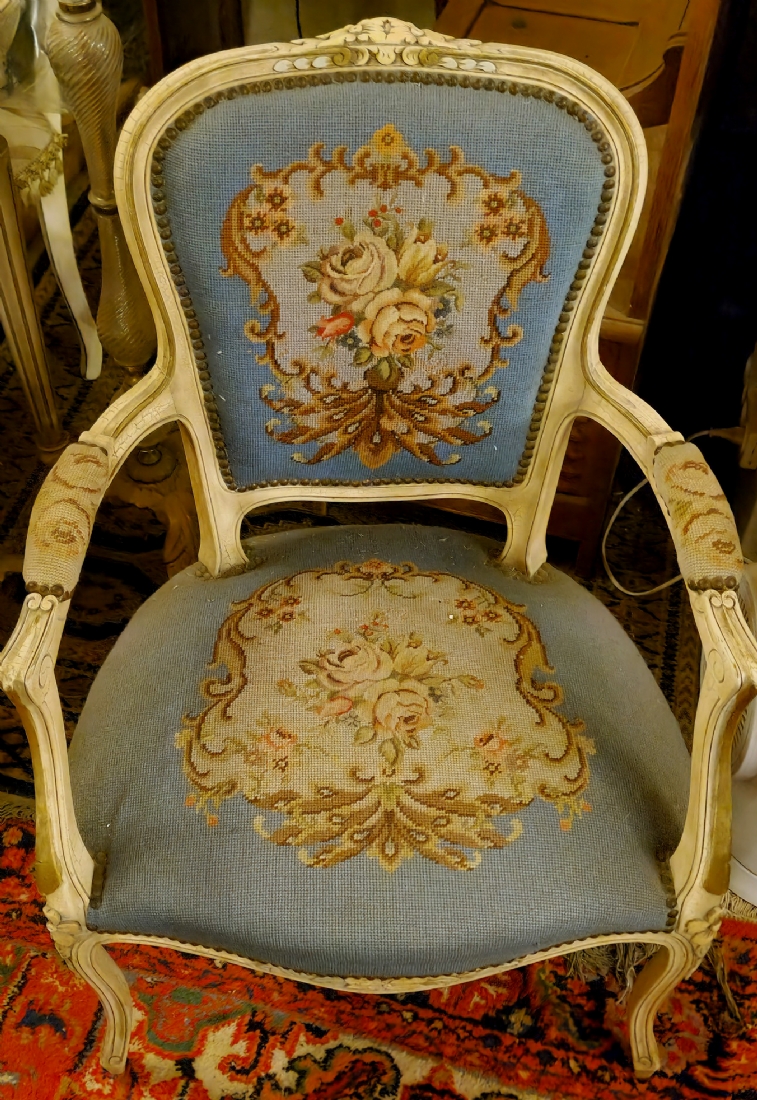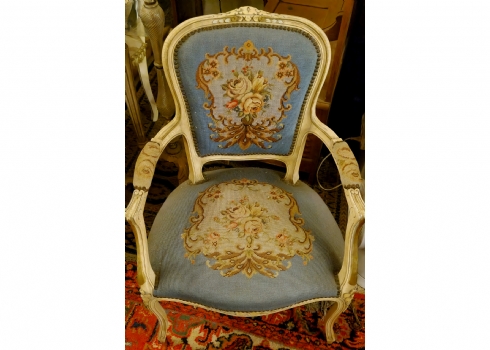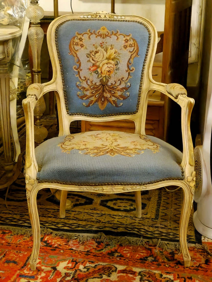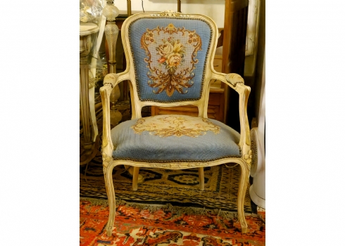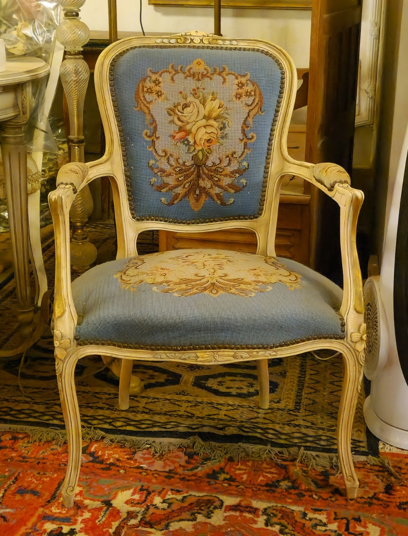 כורסא בסגנון צרפתי עתיק עשוייה עץ מגולף צבוע בגוון שמנת וריפוד גובלן