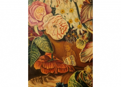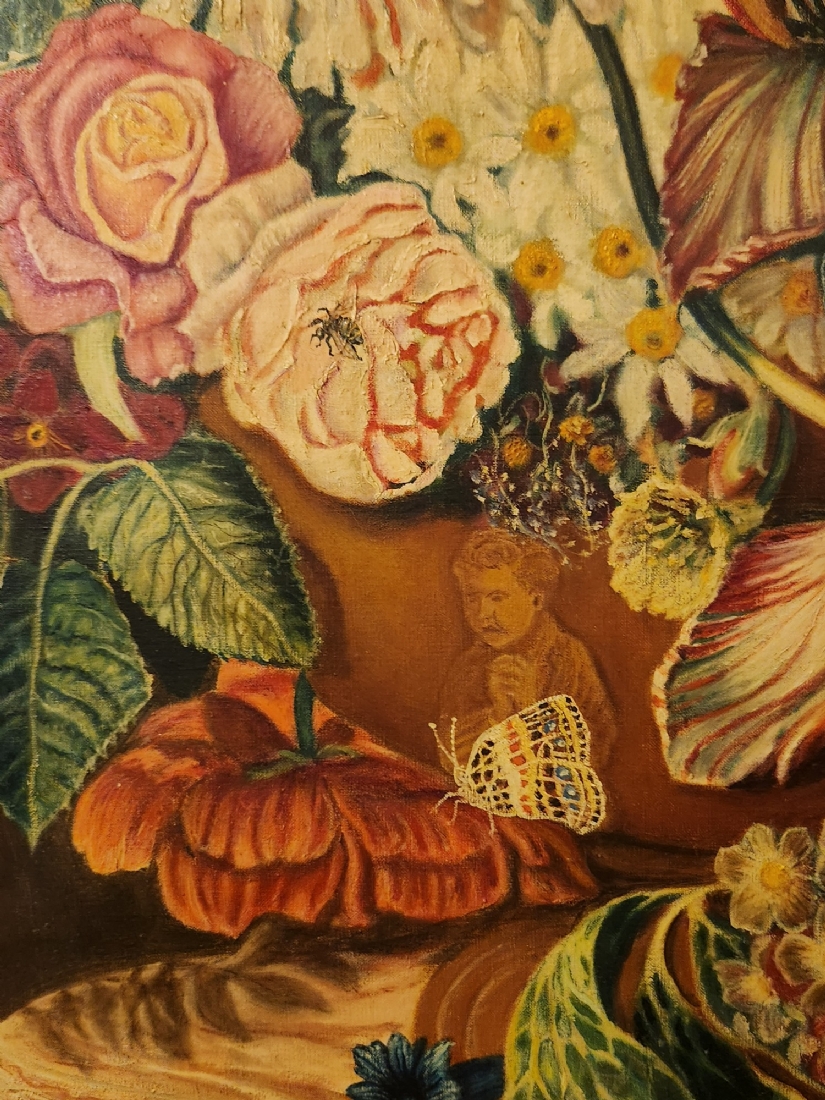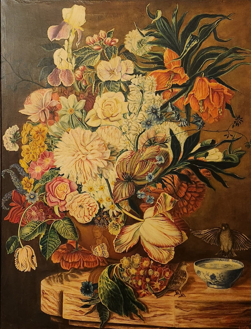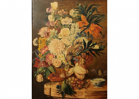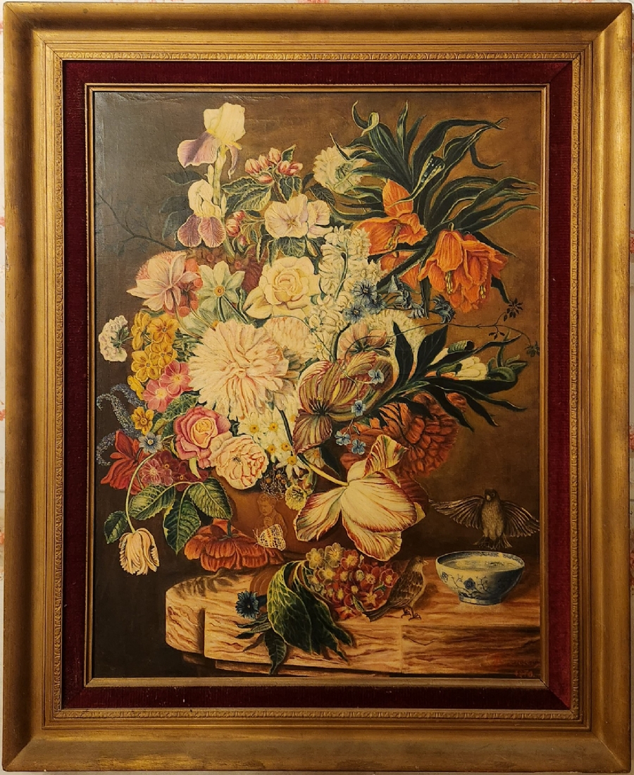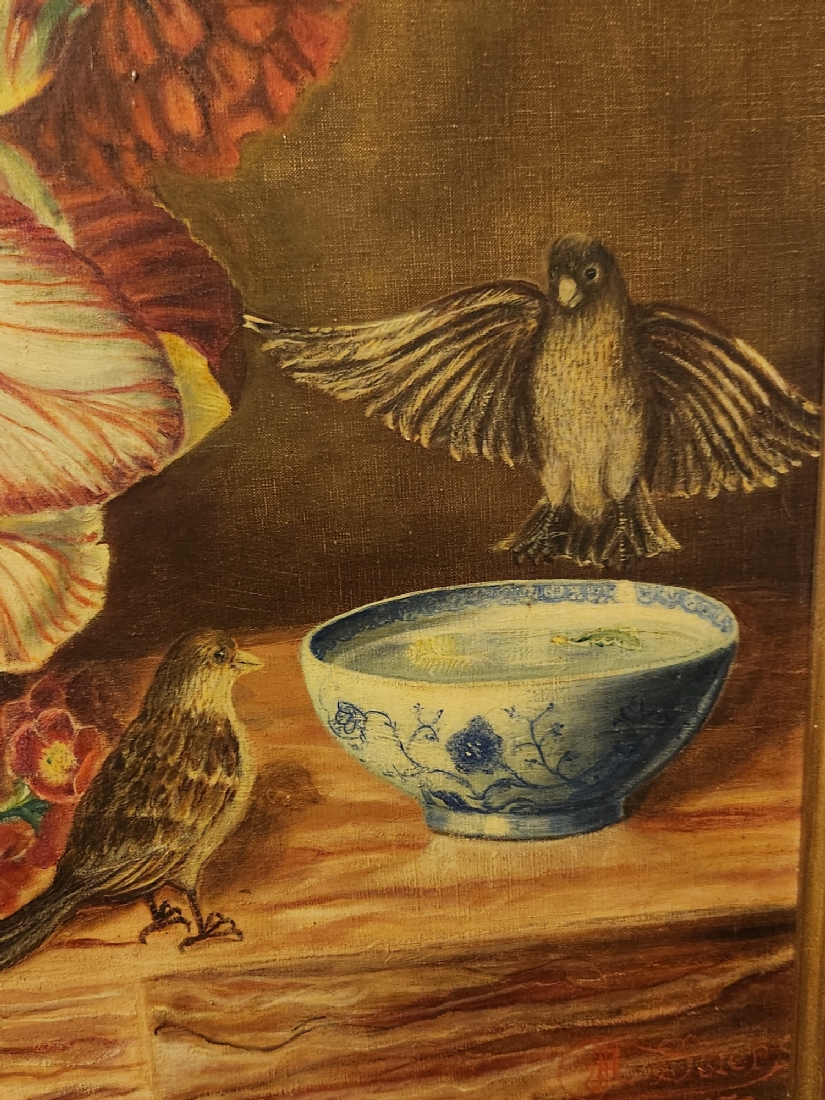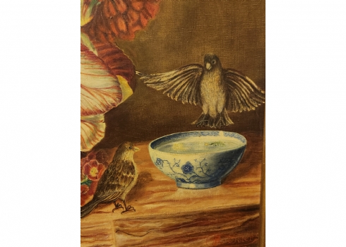 טבע דומם עם ציפור וקערת פורצלן - ציור שמן על בד חתום ומתוארך 1970