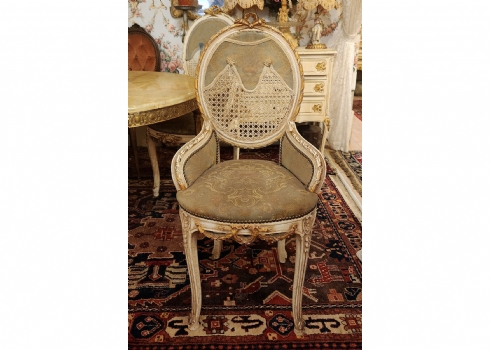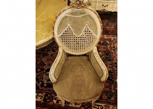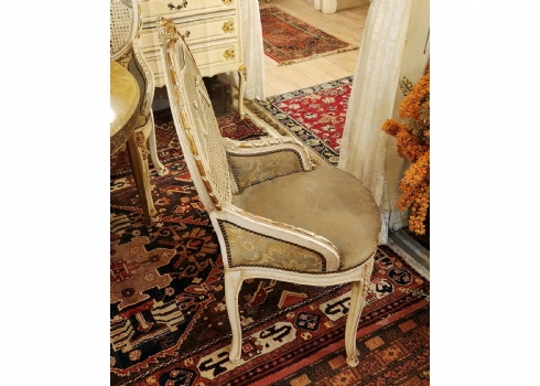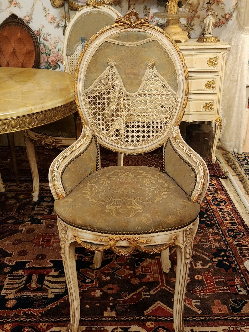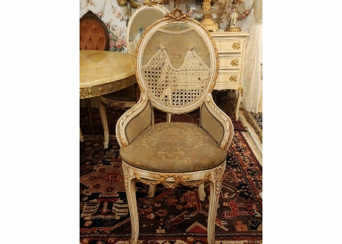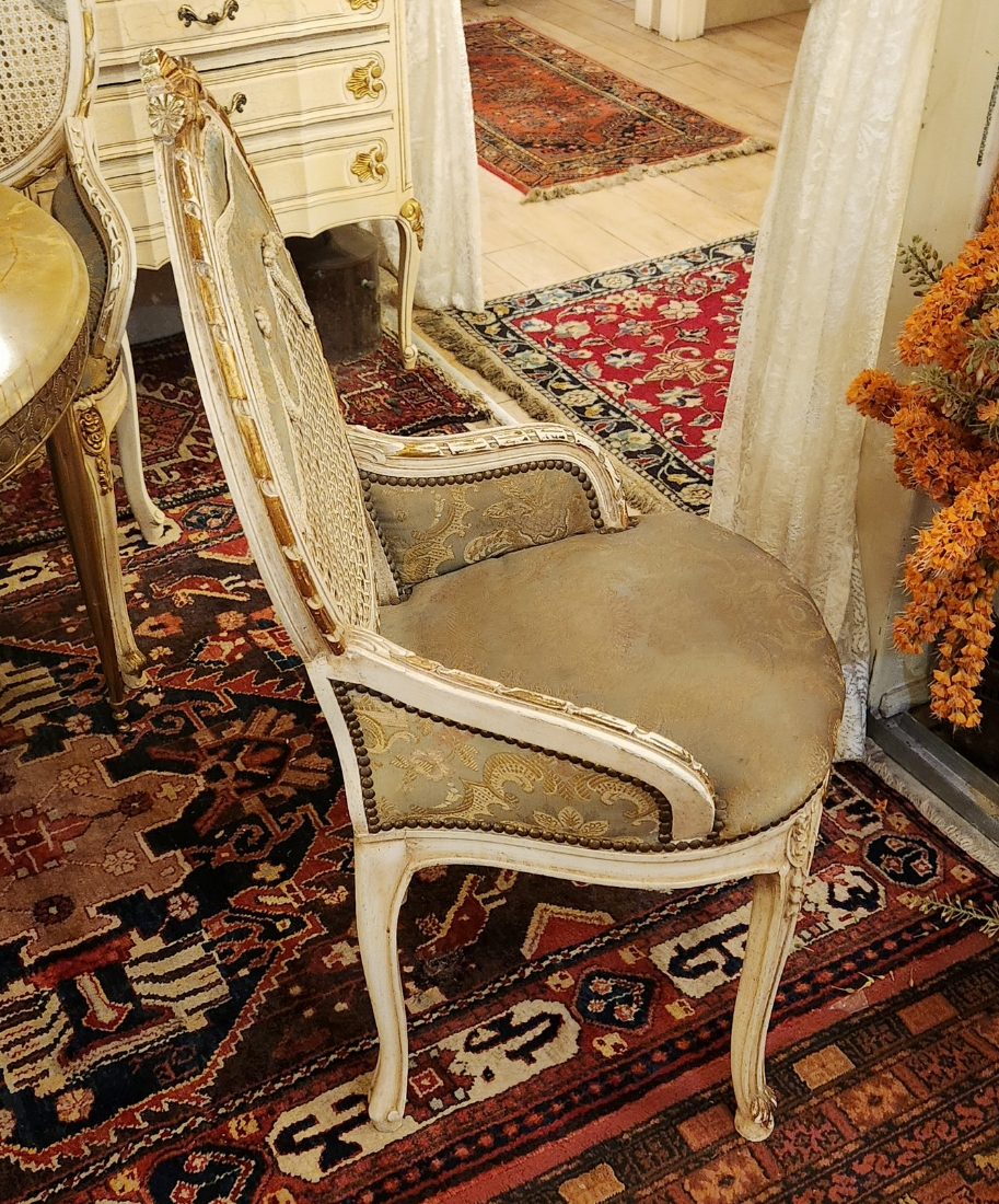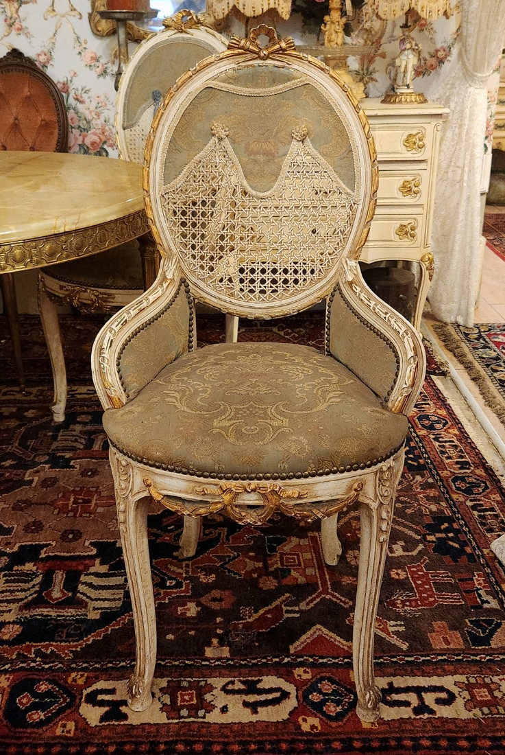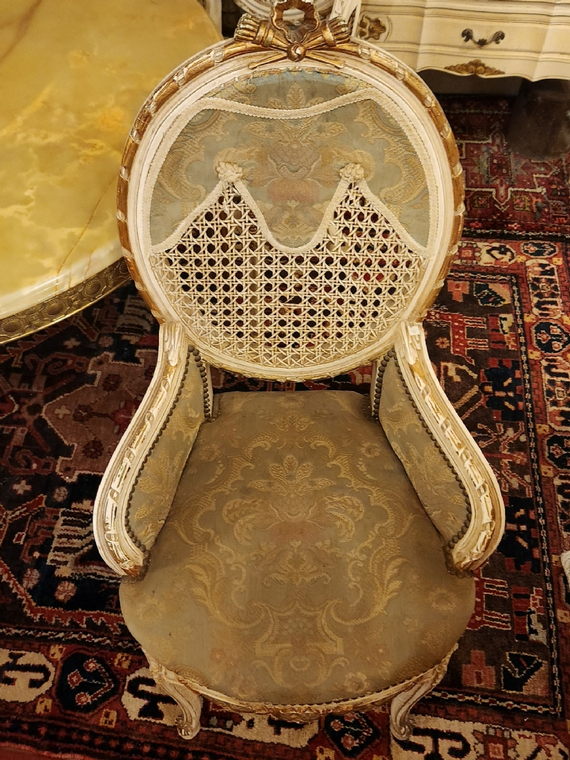 4 הכסאות עשויים עץ וריפוד בד בקליעת קש וינאית לבנה