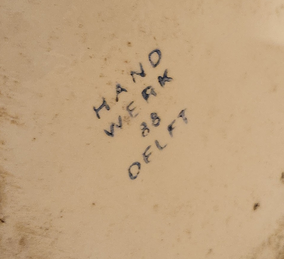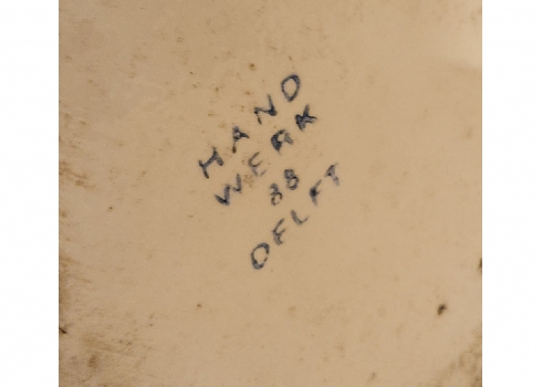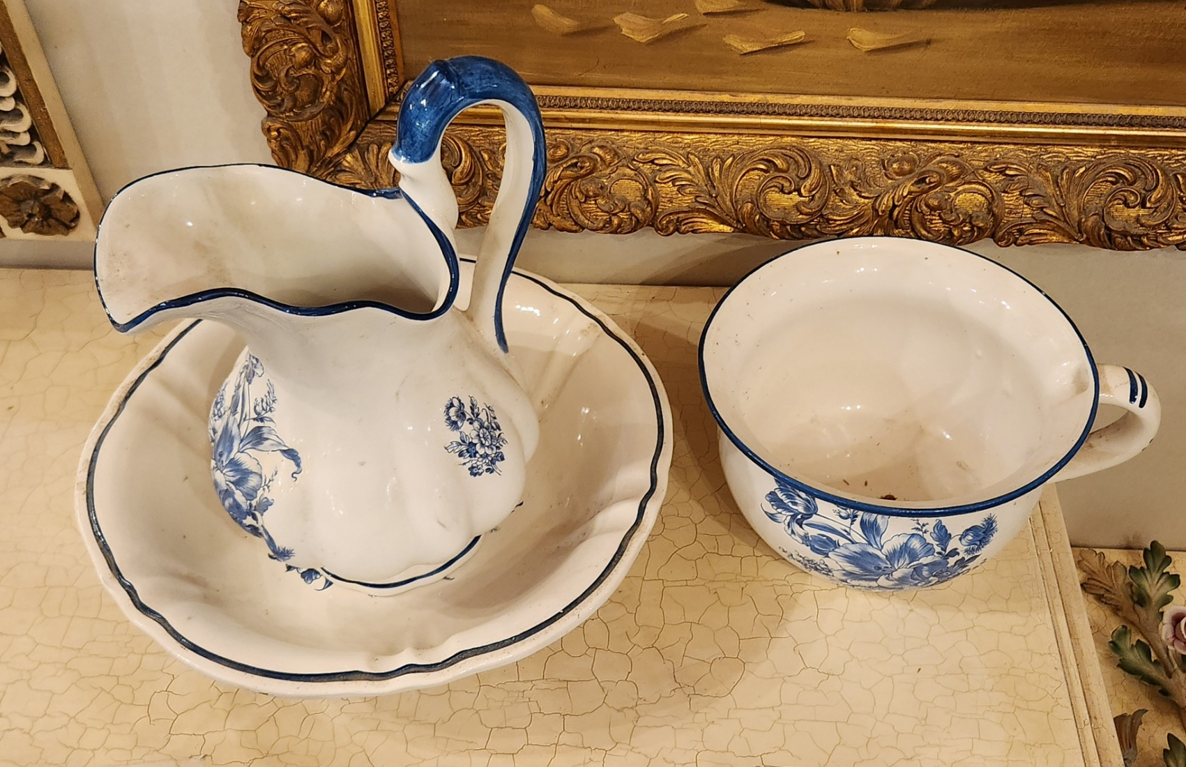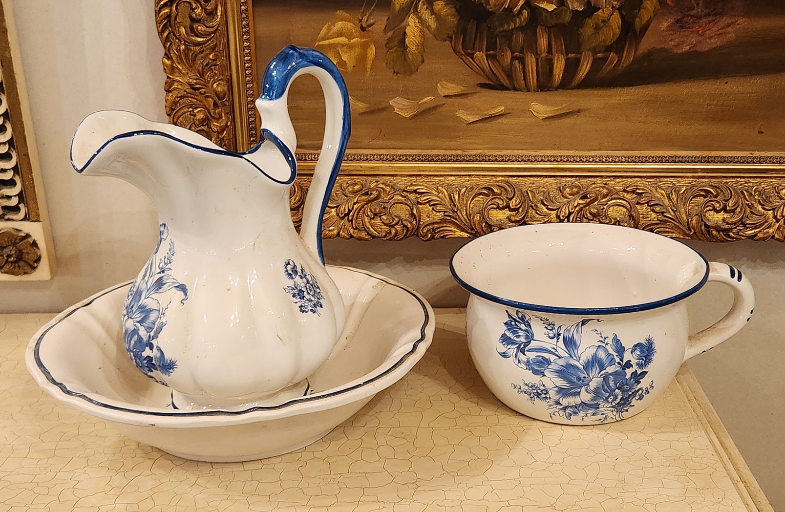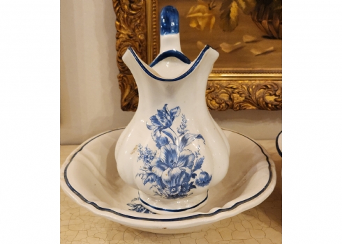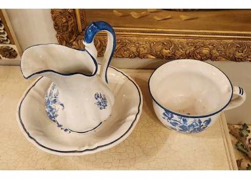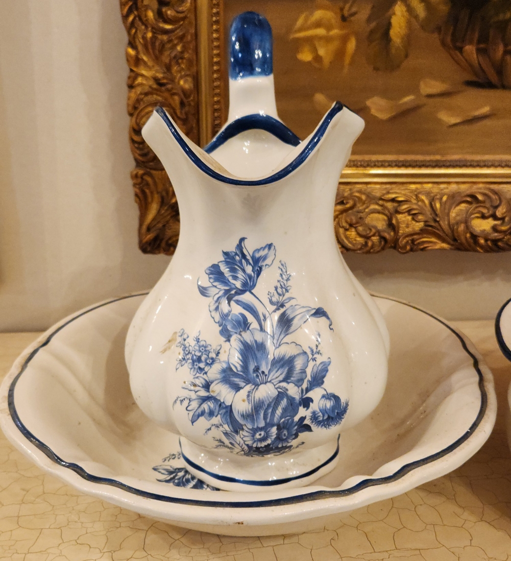 סט כלי חרסינה בסגנון דלפט חתומים, כוללים כד וקערה לרחצה וסיר לילה תואם