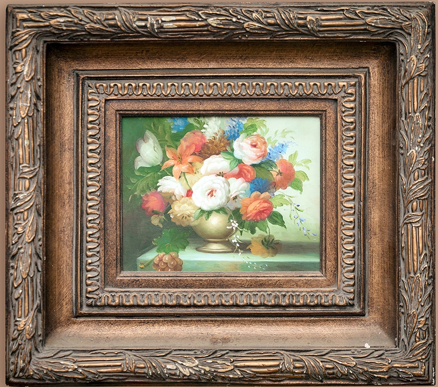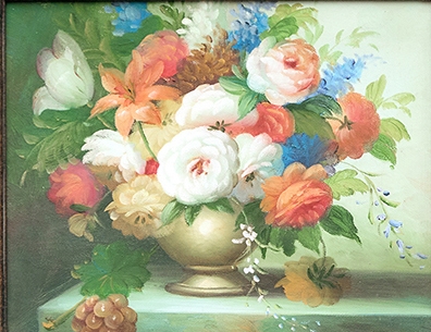 פרחים בכד עם אשכול ענבים - ציור שמן על בד, נתון במסגרת נאה ומרשימה