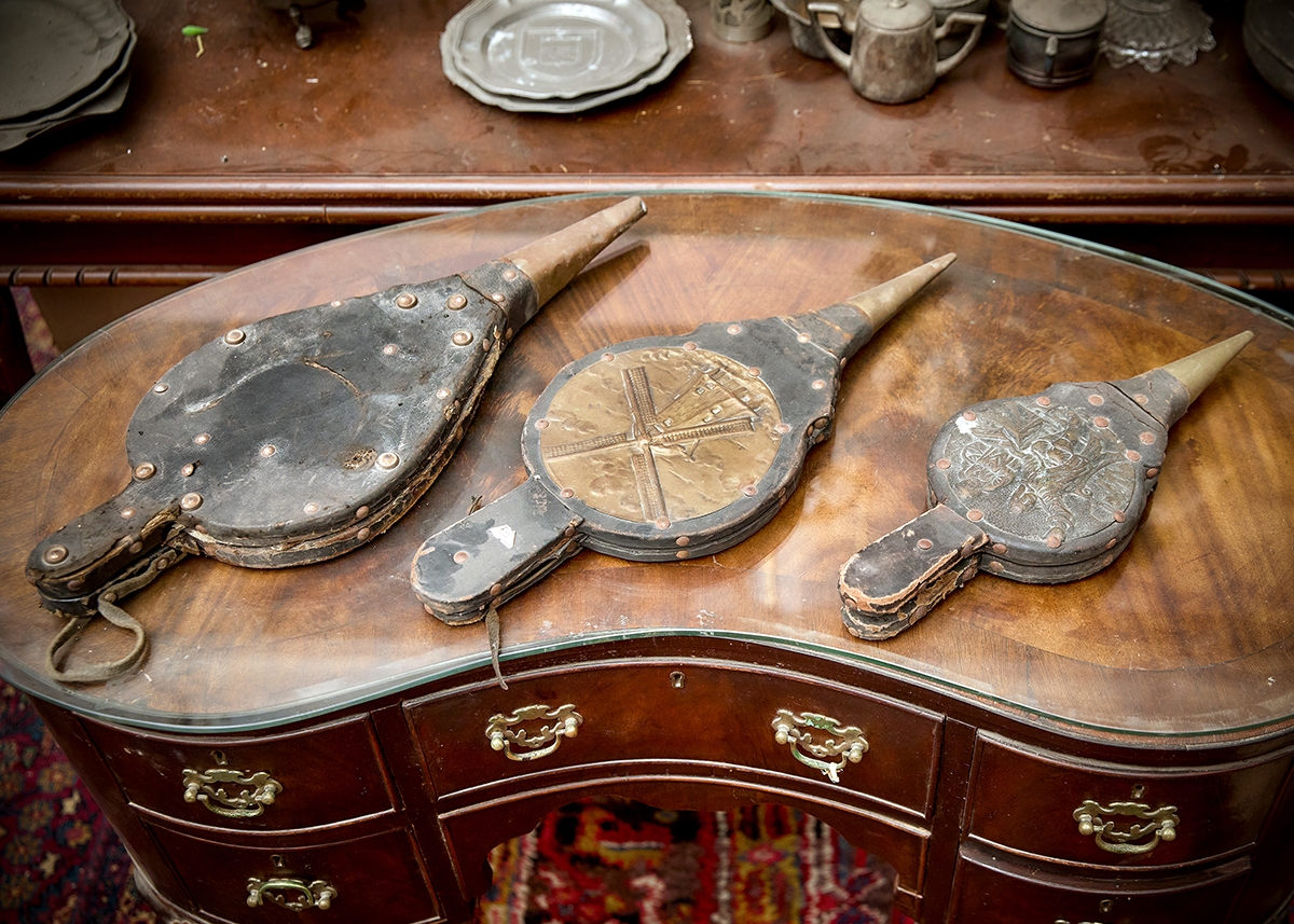3 מפוחים עתיקים עשויים עץ, עור ומתכת