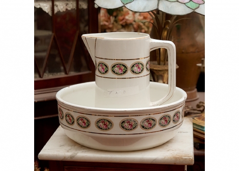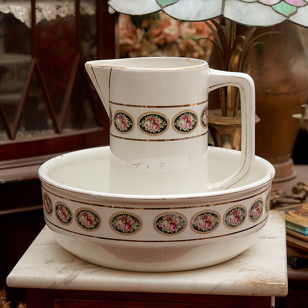 סט רחצה בלגי עתיק הכולל כד וקערה לטואלט מעוטרים וחתומים