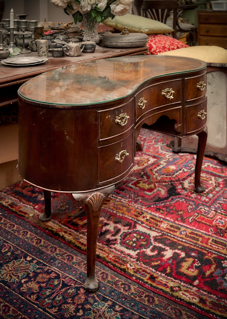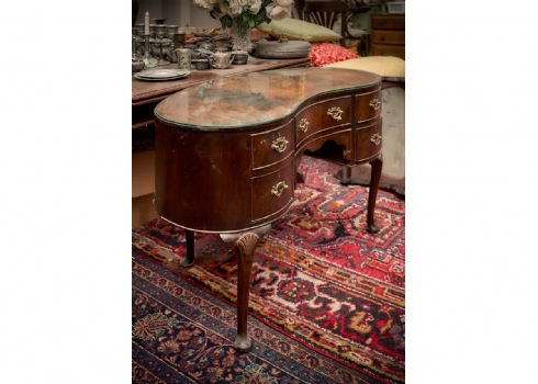 שולחן טואלט מעוצב בצורת כילייה עשוי עץ, ידיות מתכת, ומשטח עליון זכוכית