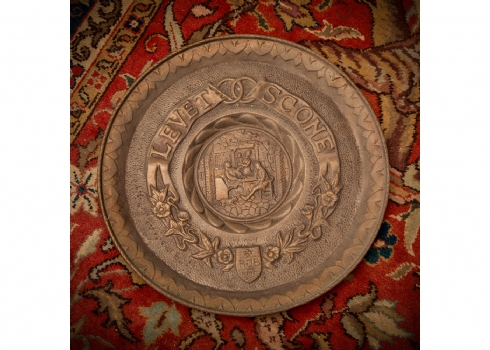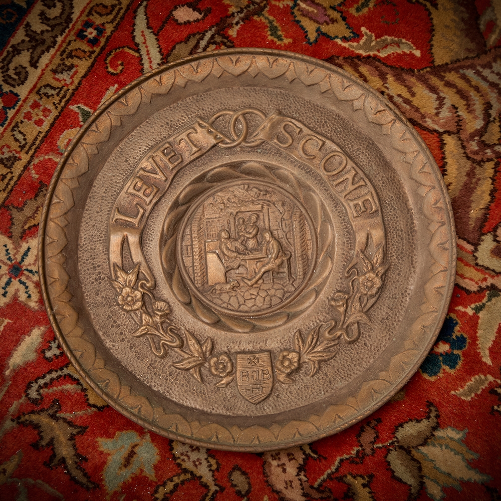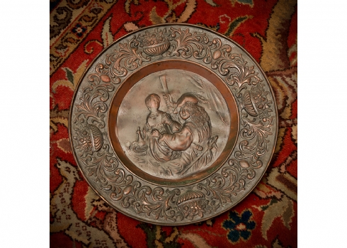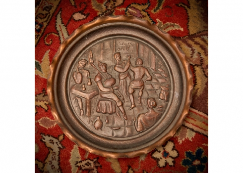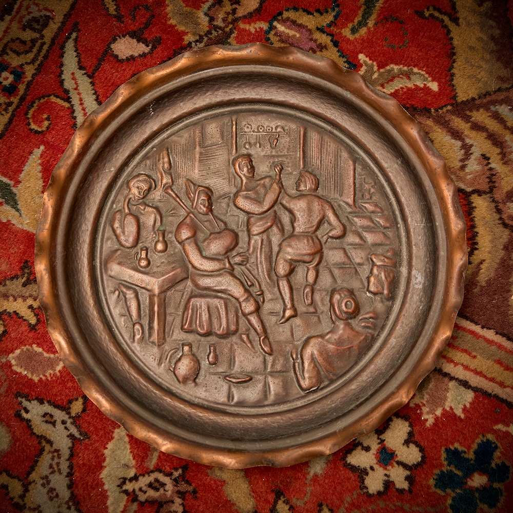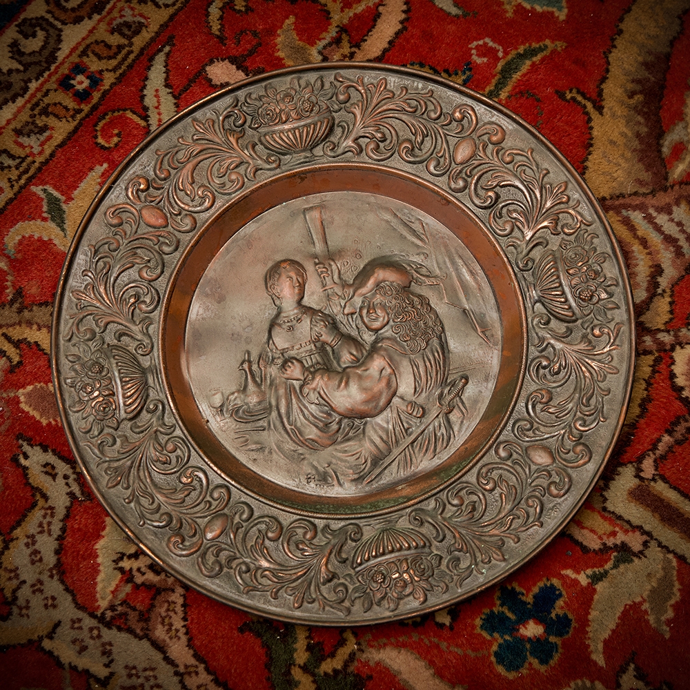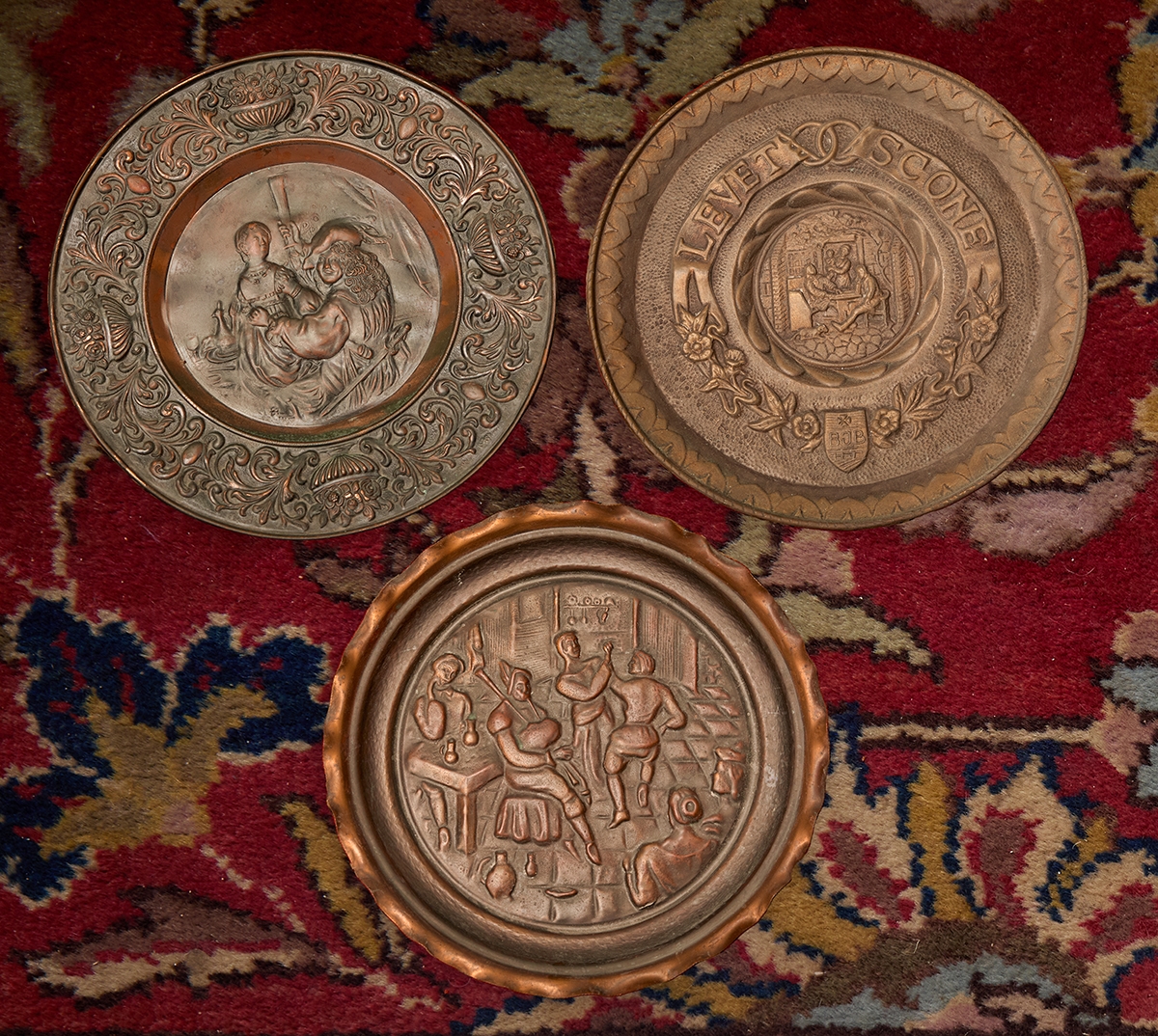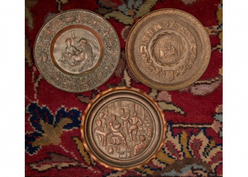 3 צלחות נוי לתלייה על הקיר עשויות נחושת דגמים שונים, מעוטרות בתבליטים