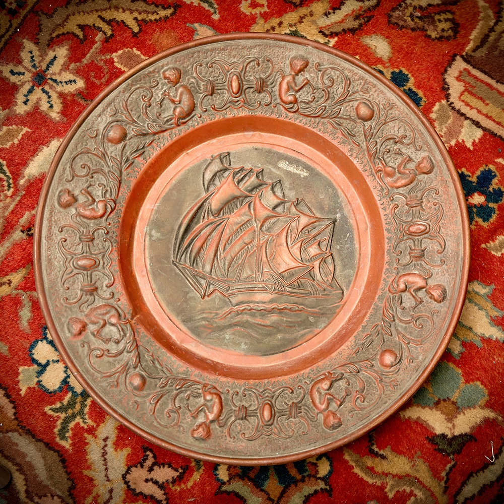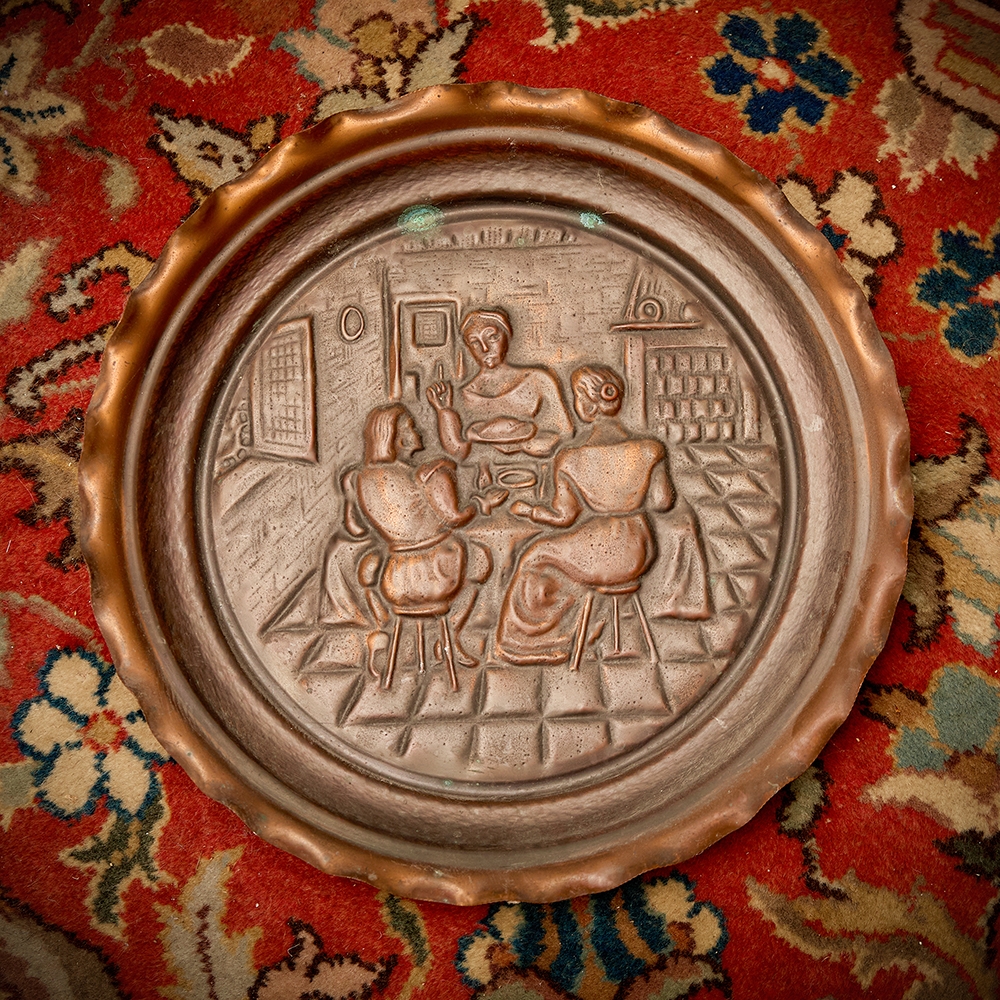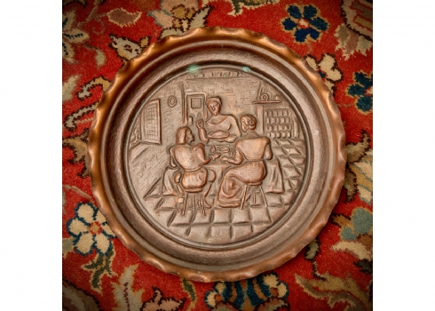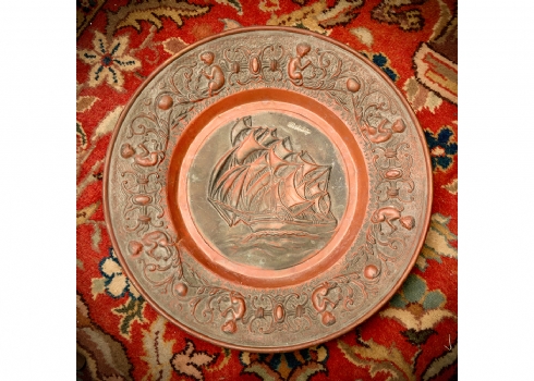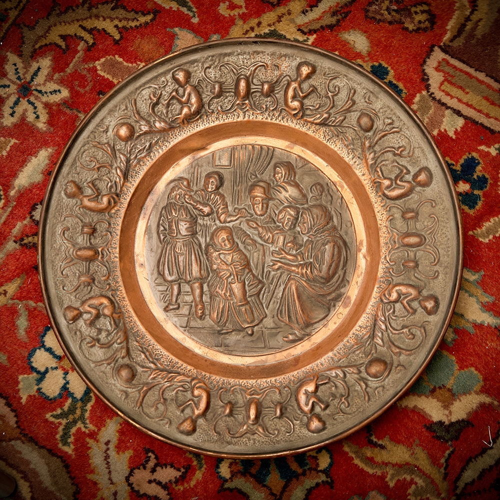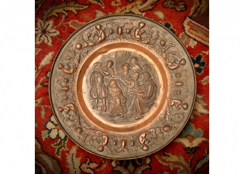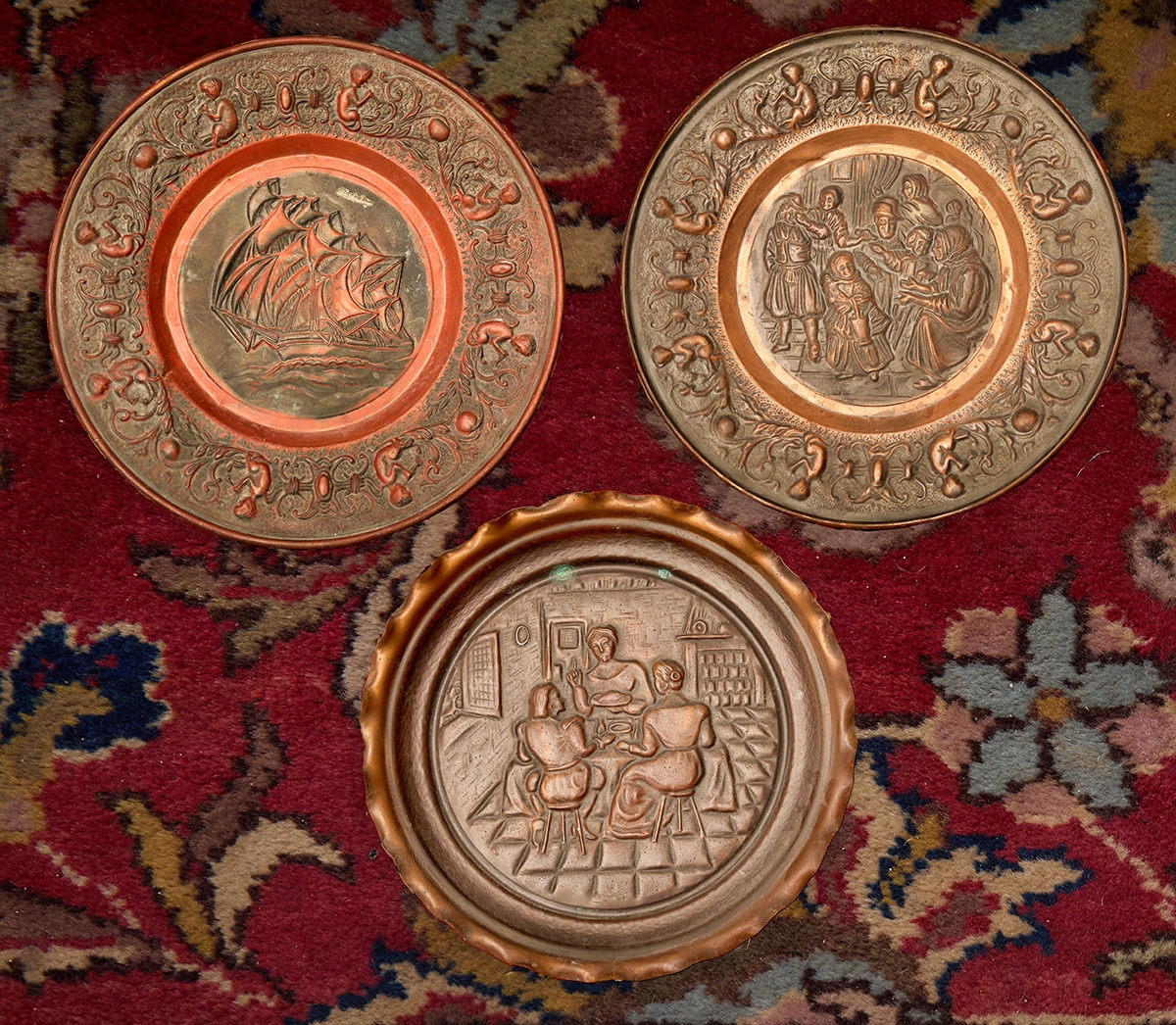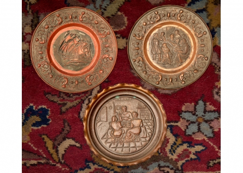 3 צלחות נוי לתלייה על הקיר עשויות נחושת דגמים שונים, מעוטרות בתבליטים
