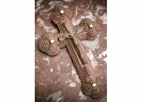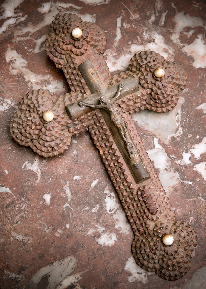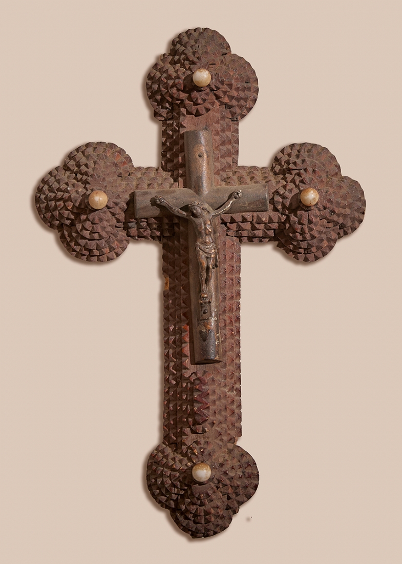 צלב עתיק מהמאה ה19 ויקטוריאני עשוי עבודה טרמפ Tramp art