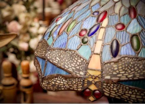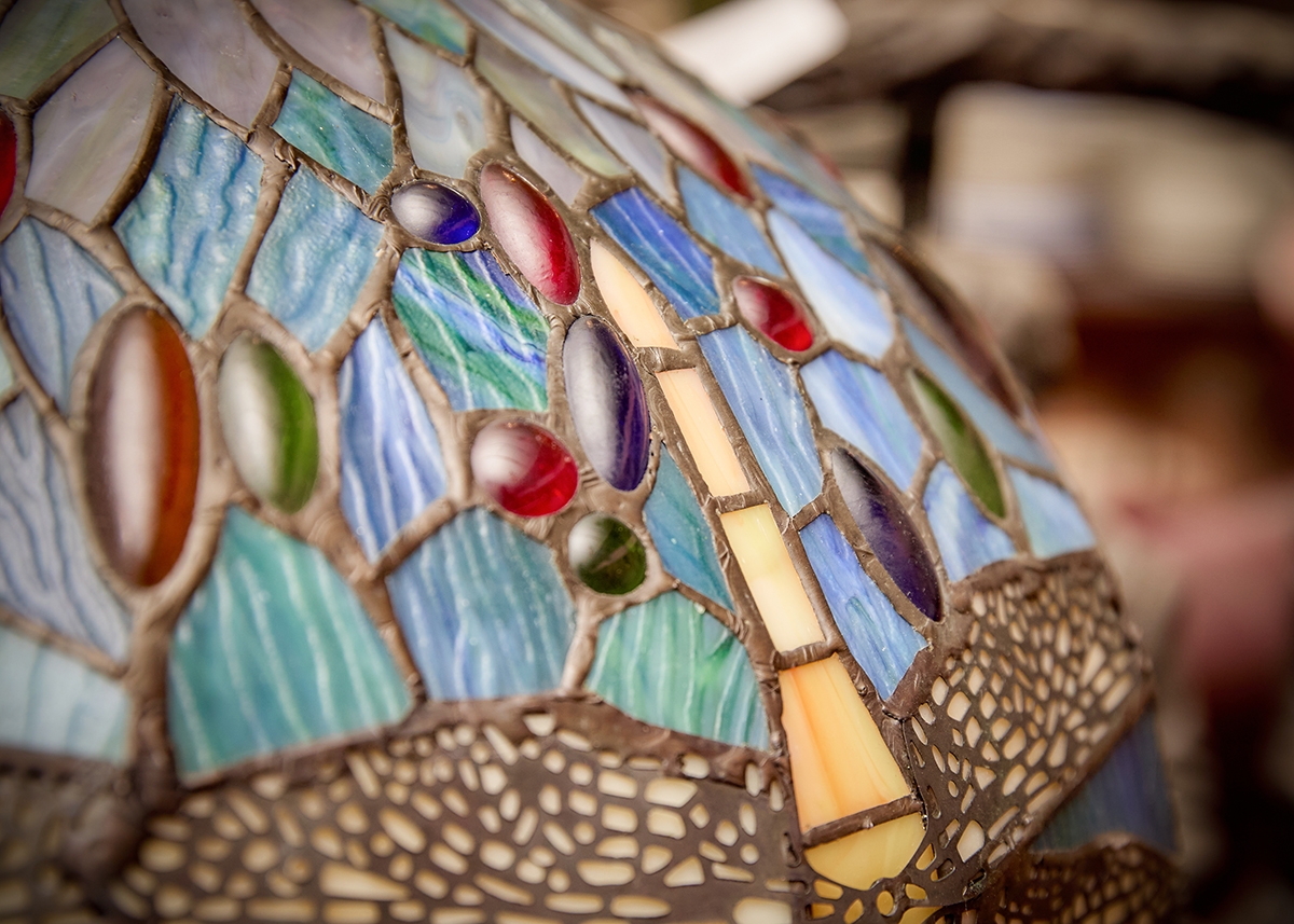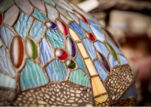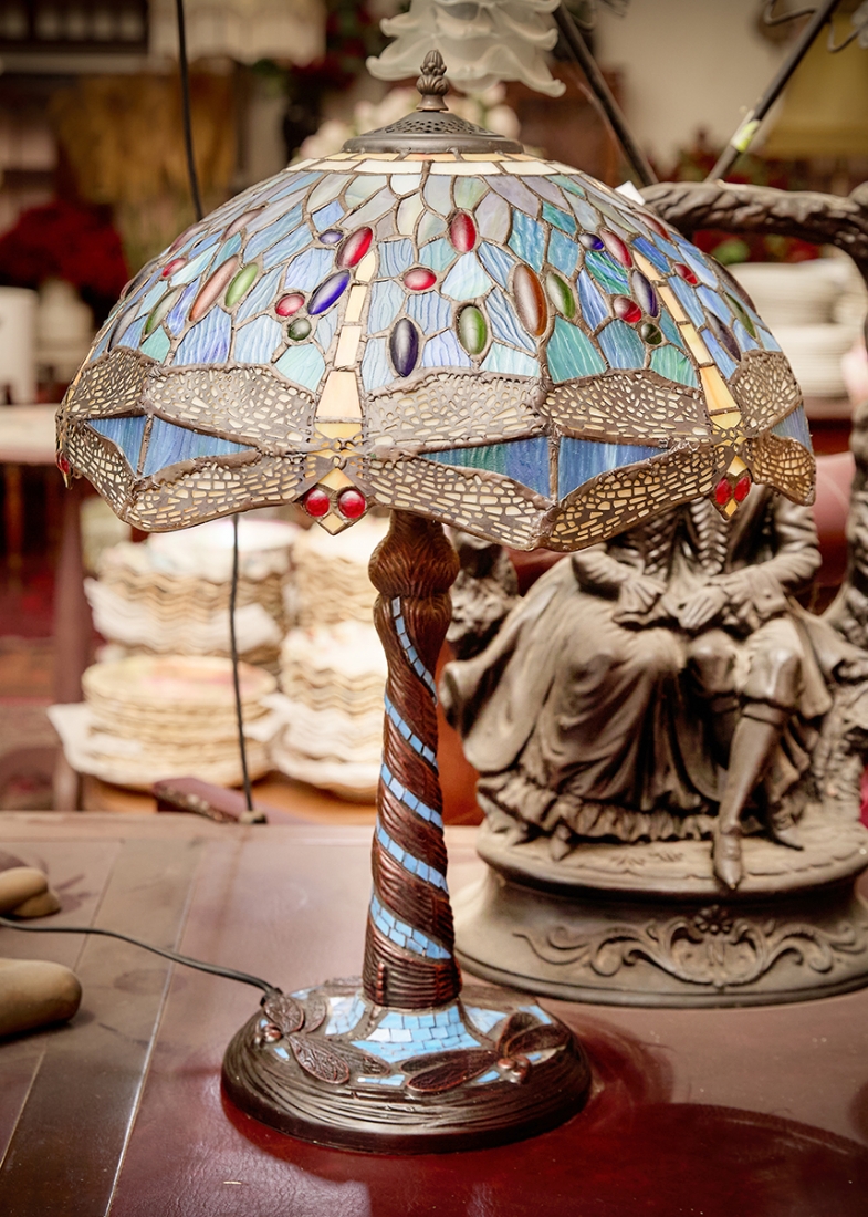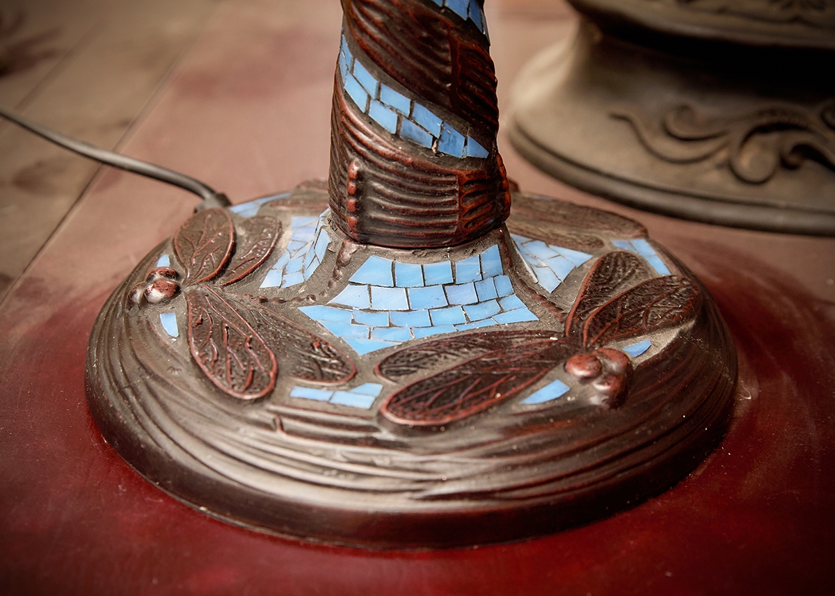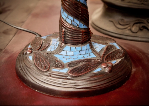 מנורה שולחנית בסגנון טיפני, הבסיס עשוי חומר יצוק, אהיל ויטראז עשוי זכוכית