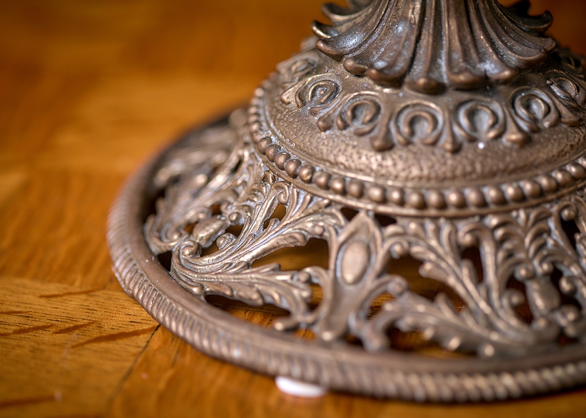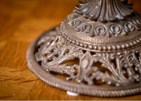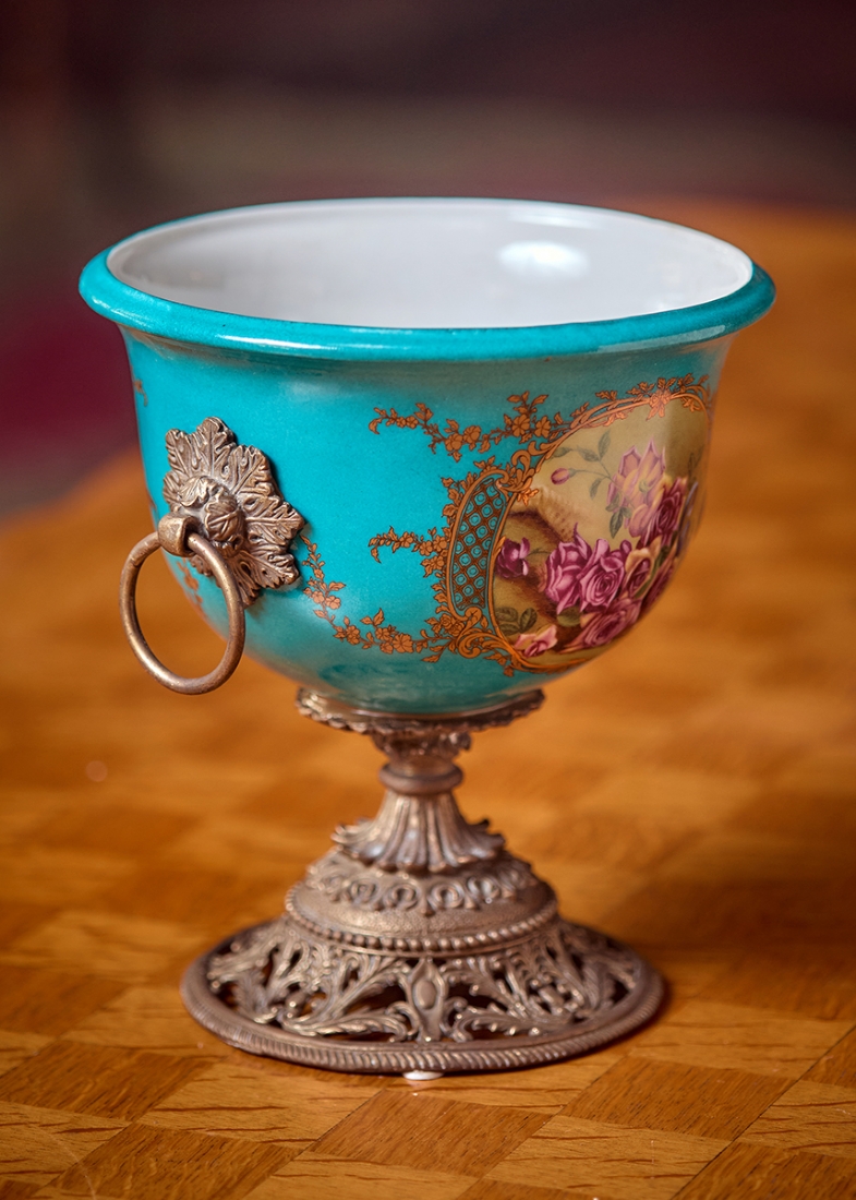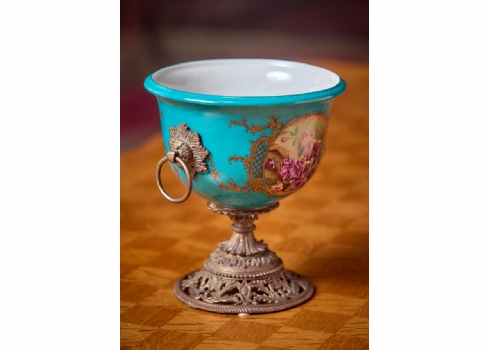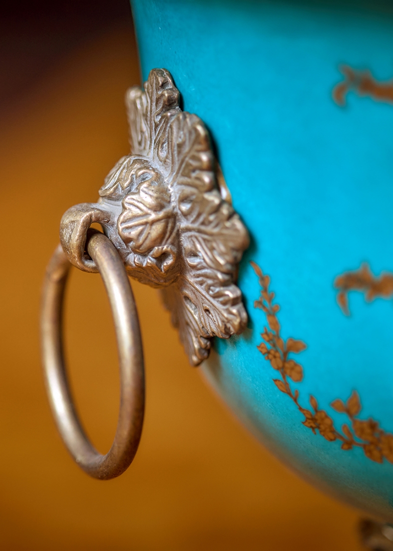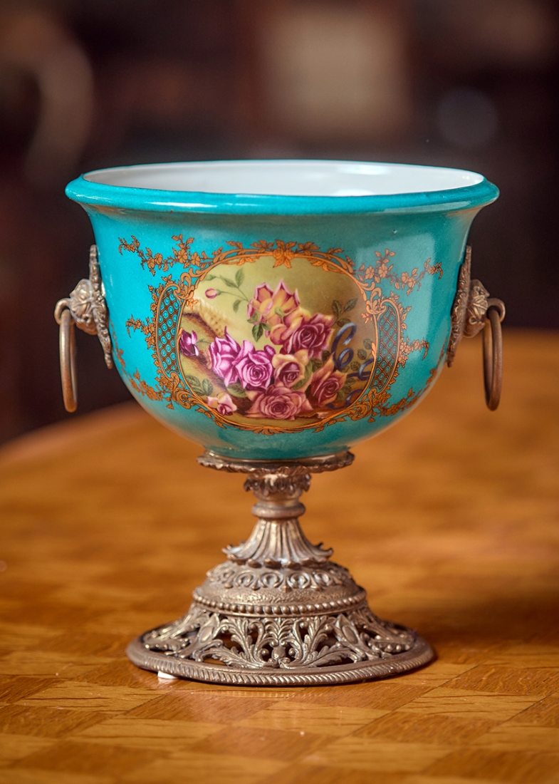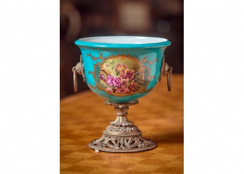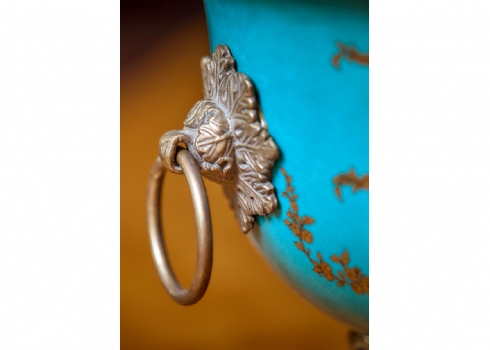 כלי נוי בסגנון עתיק עשוי חרסינה מעוטרת בהדפס שושנים על רקע בגוון טורקיז