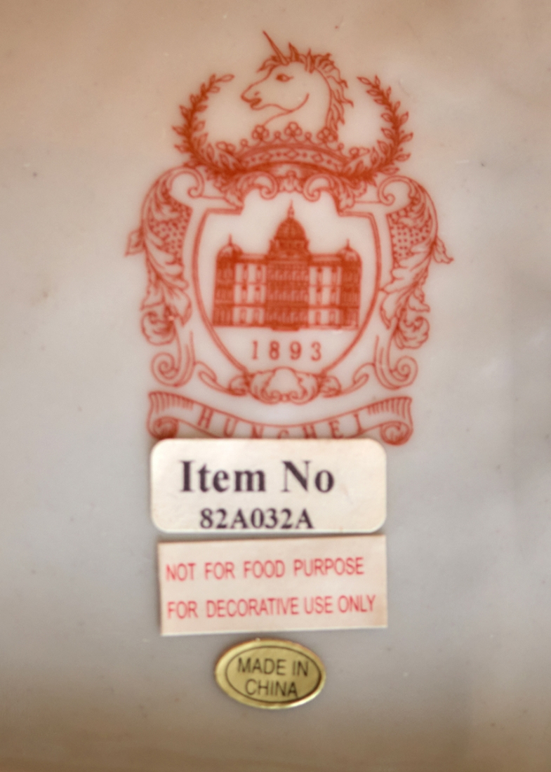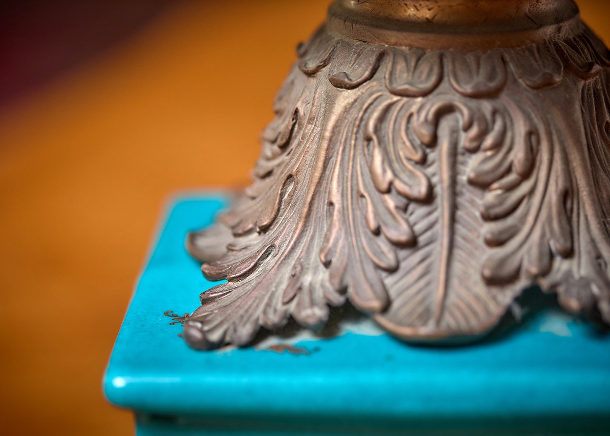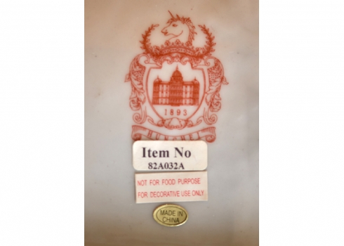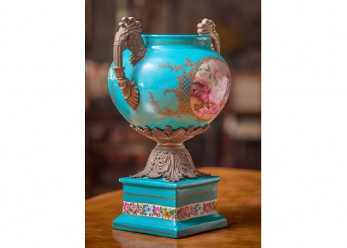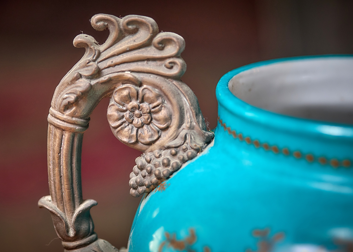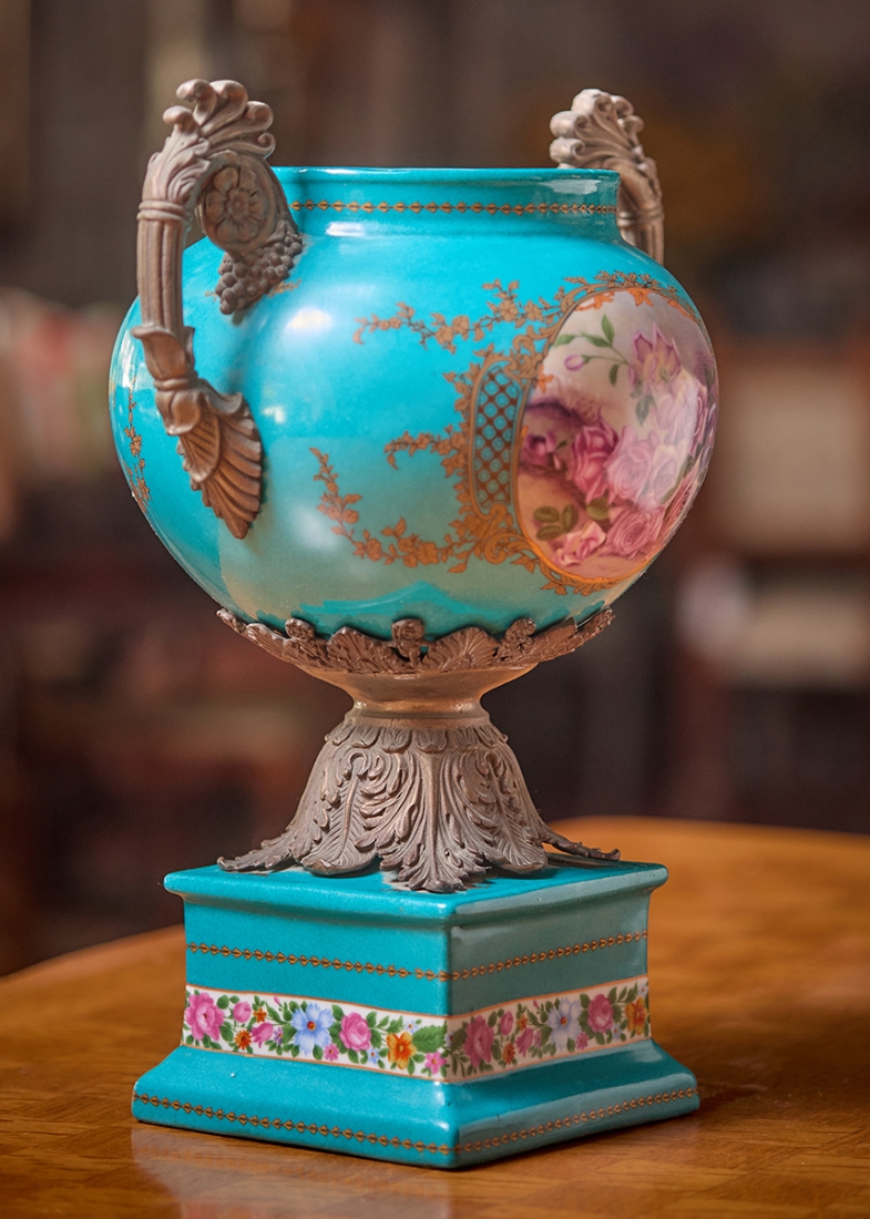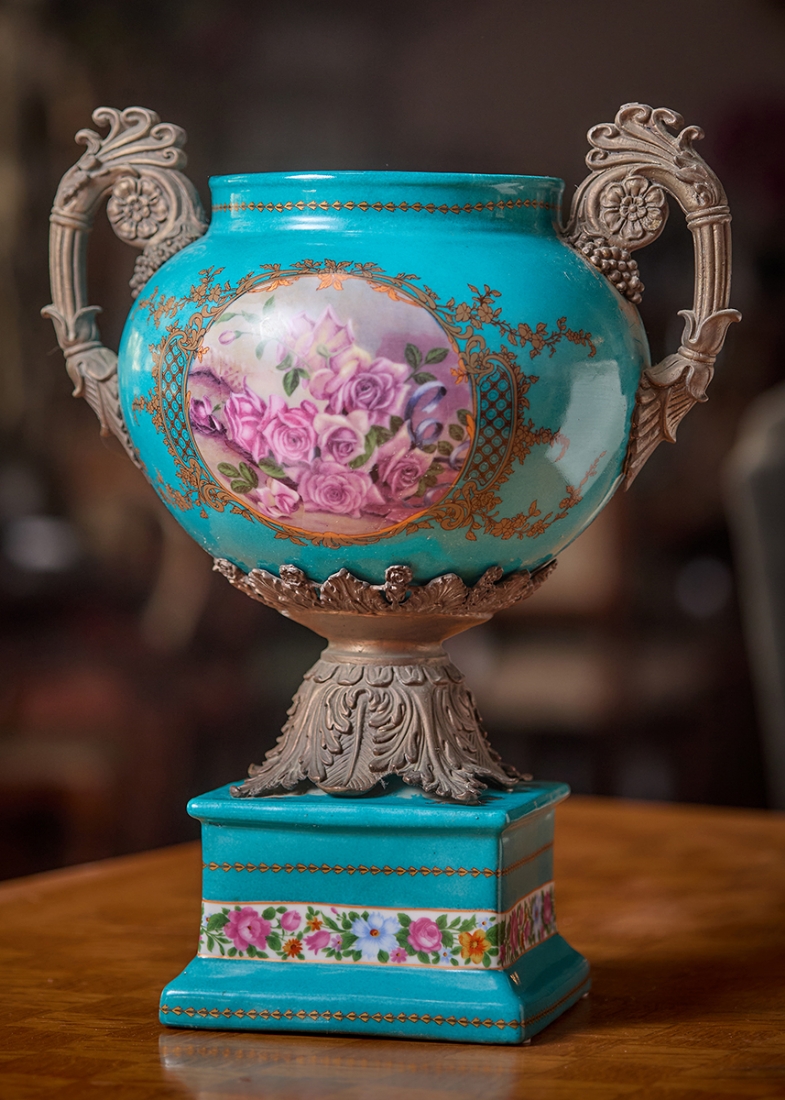 כלי נוי בסגנון עתיק עשוי חרסינה מעוטרת בהדפס שושנים על רקע בגוון טורקיז