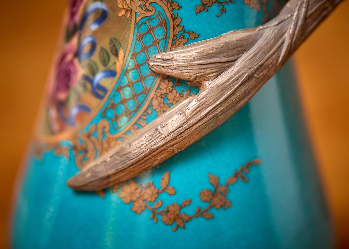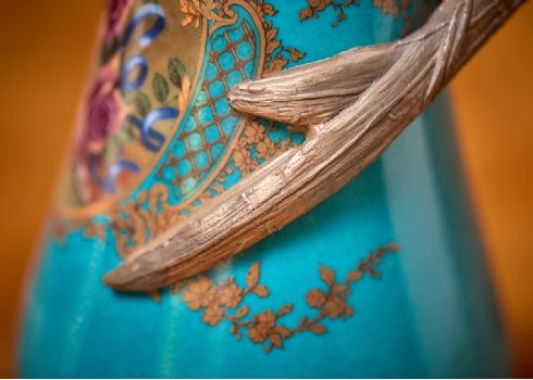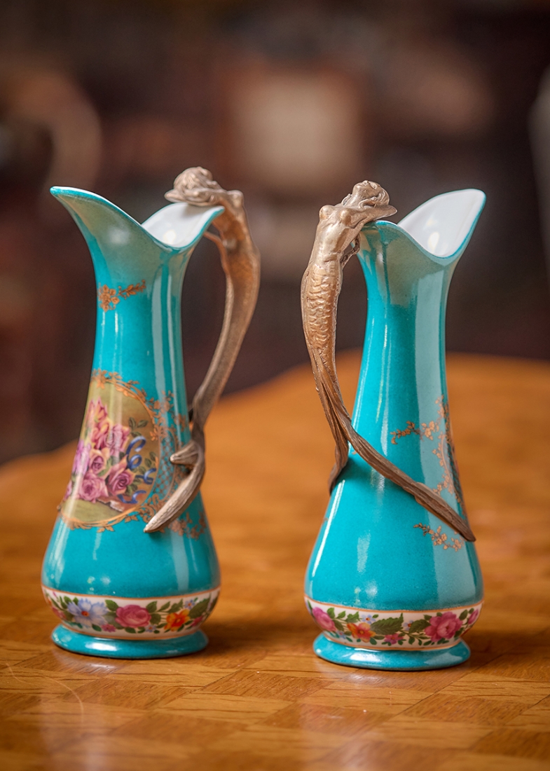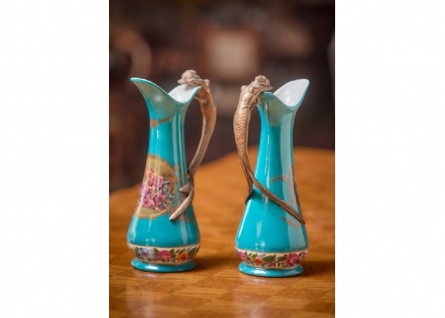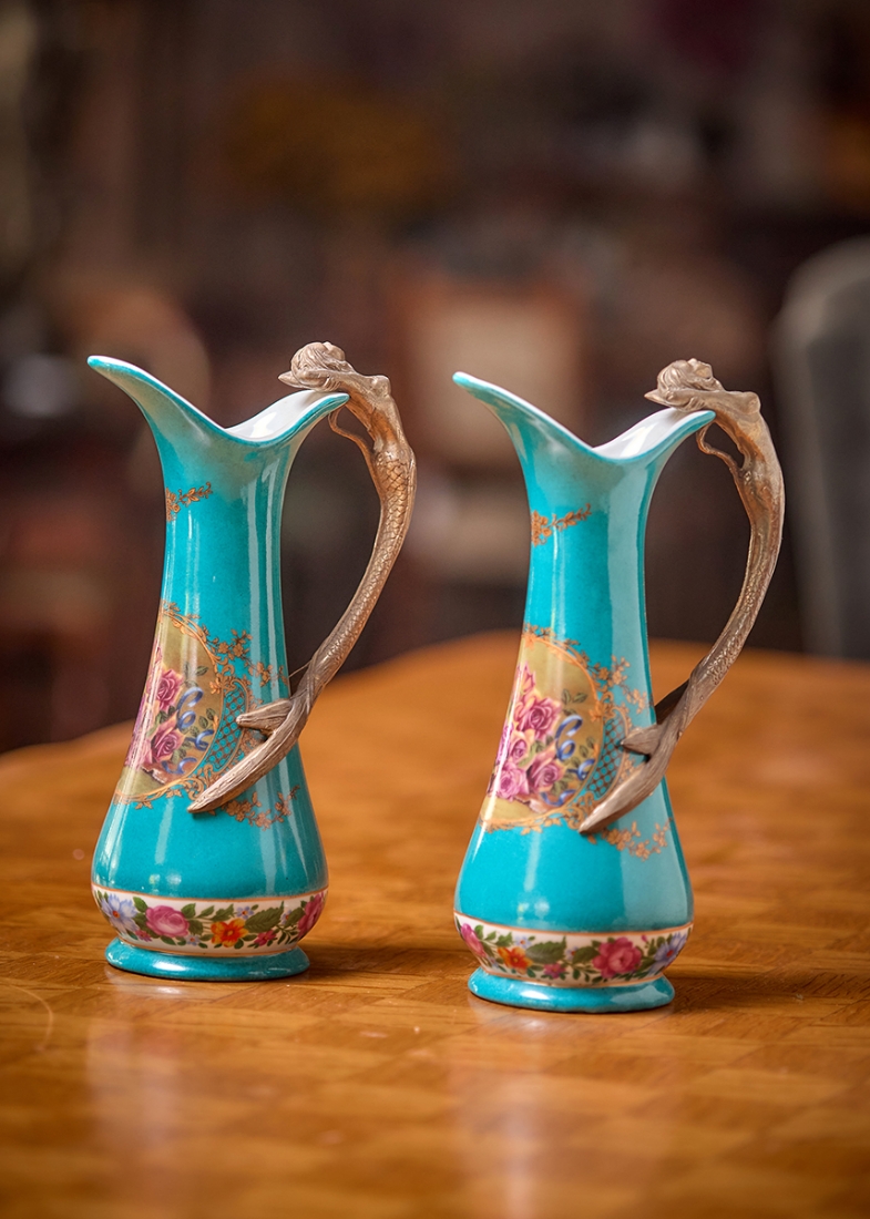 זוג כלי נוי בסגנון עתיק עשויים חרסינה מעוטרת בהדפס שושנים על רקע בגוון טורקיז