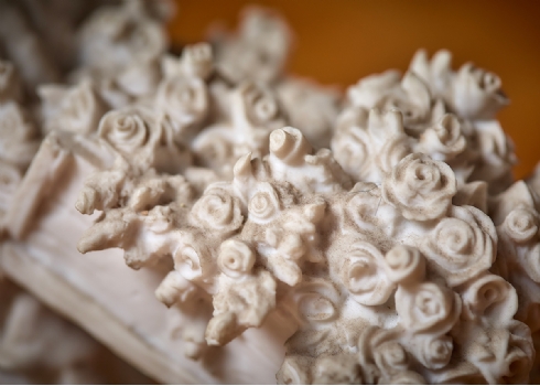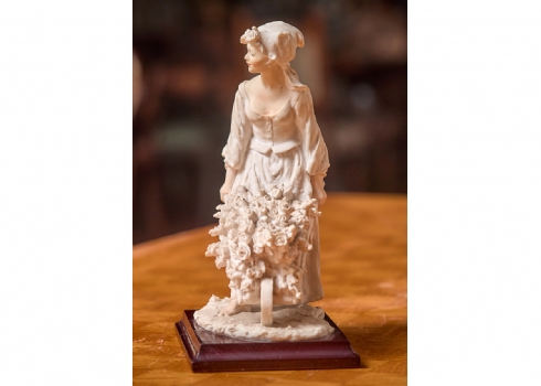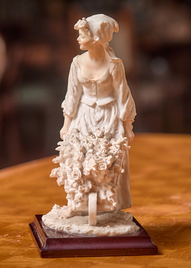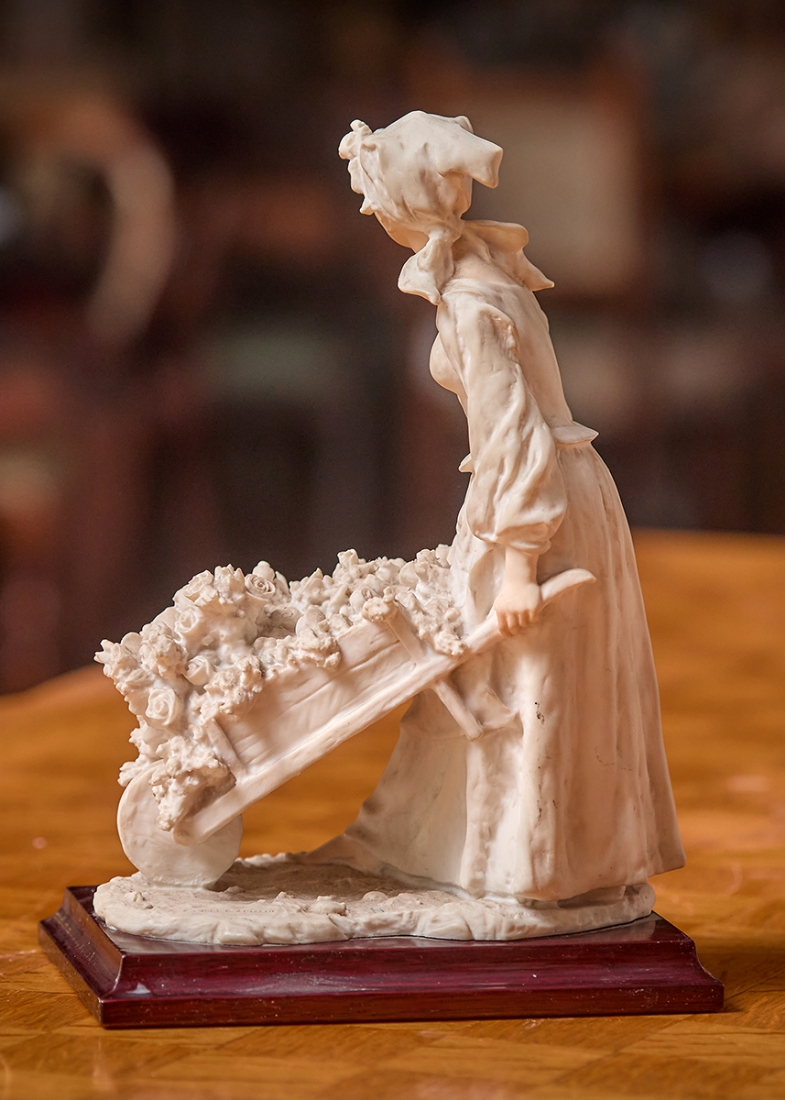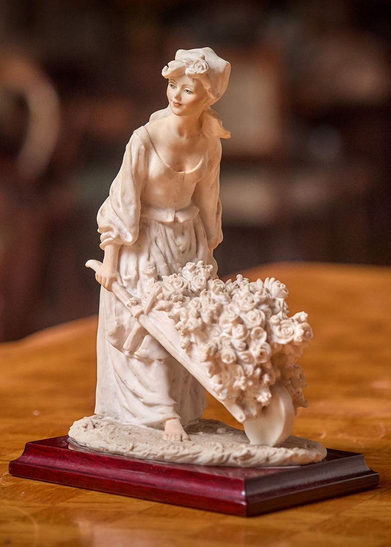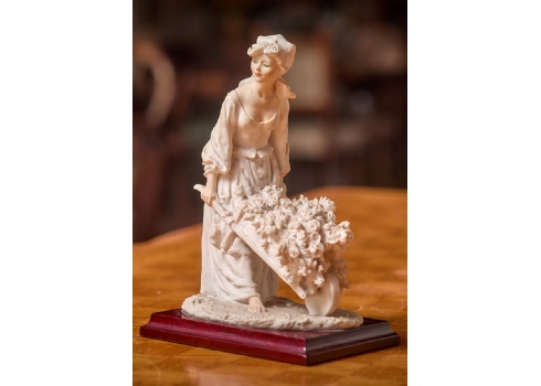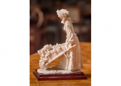פסל שולחני עשוי חומר יצוק בדמות נערה ומריצה עמוסה פרחים צבוע ביד וחתום