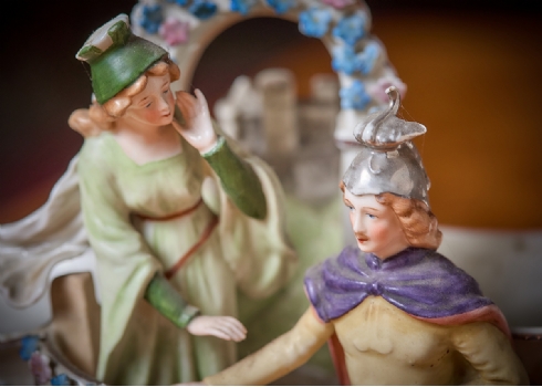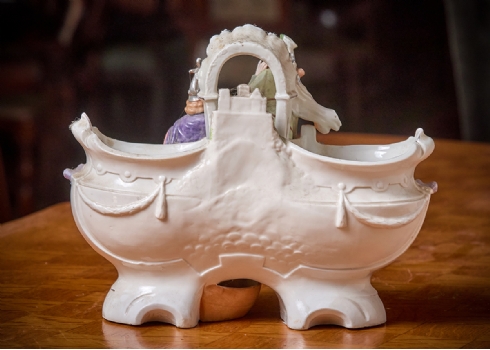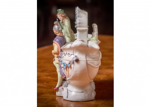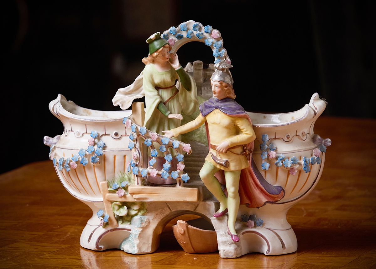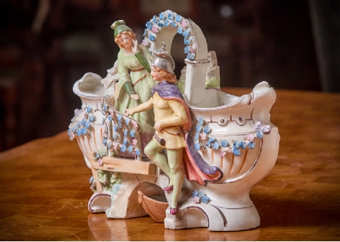 סנטרפיס עתיק עשוי פורצלן מעוטר בדמות זוג אצילים על מרפסת - רומאי ויוליה?