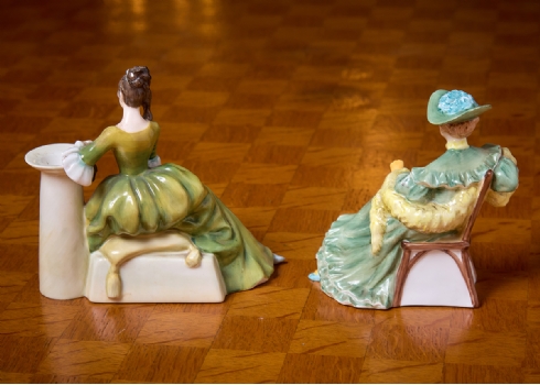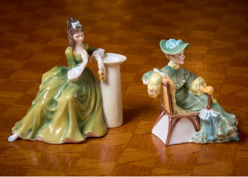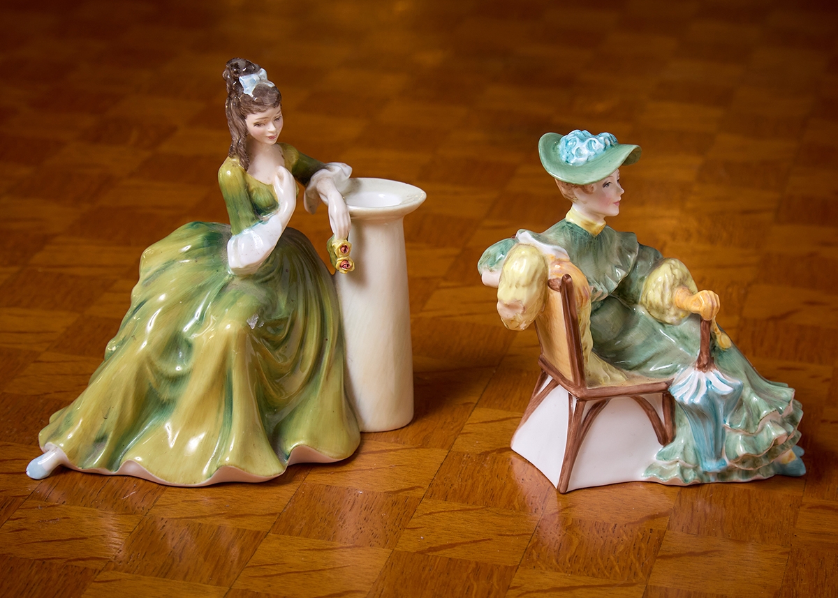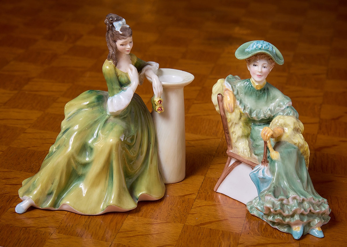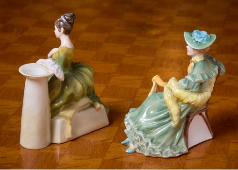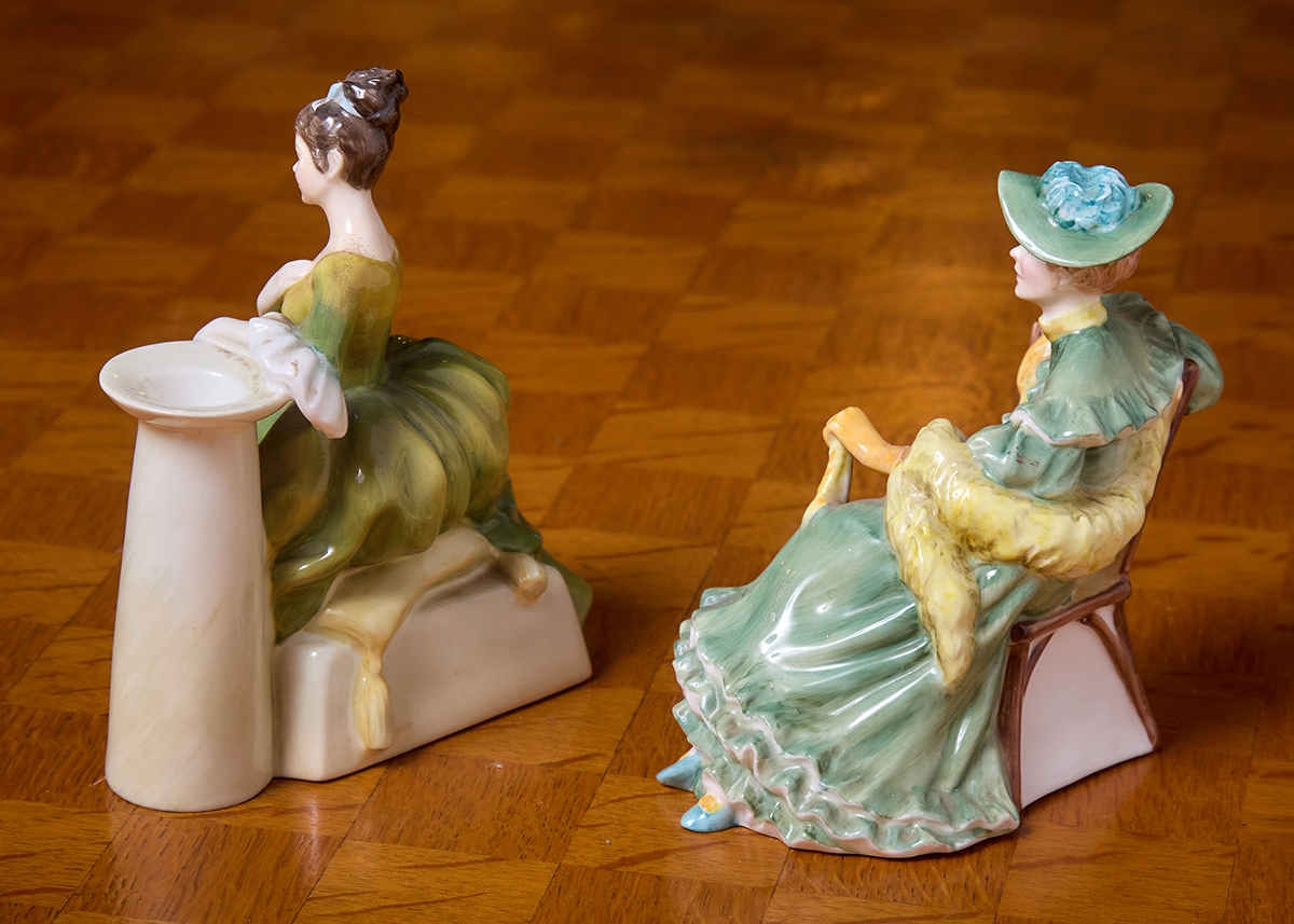 דמויות נשים בשמלות ירוקות, מעוטרים בצביעת יד וחתומיםרוחב: 15-19 ס"מגובה: 16-18 ס"מ
