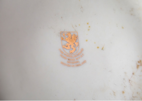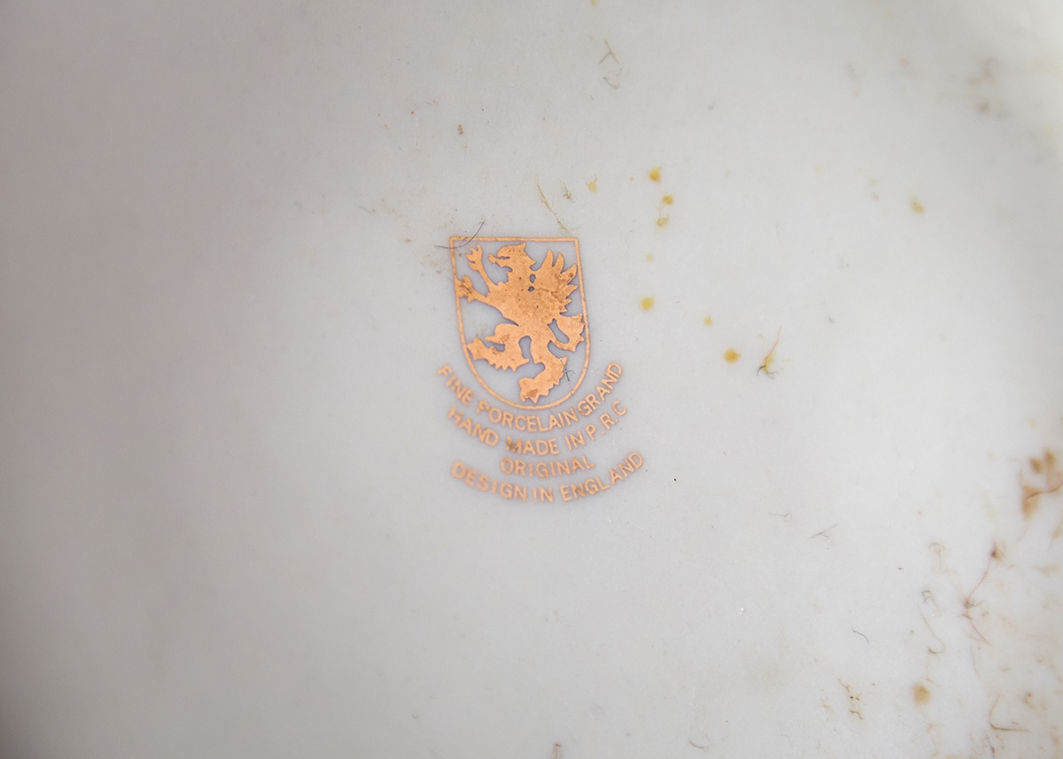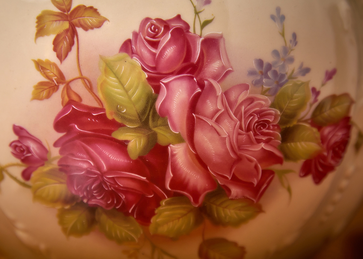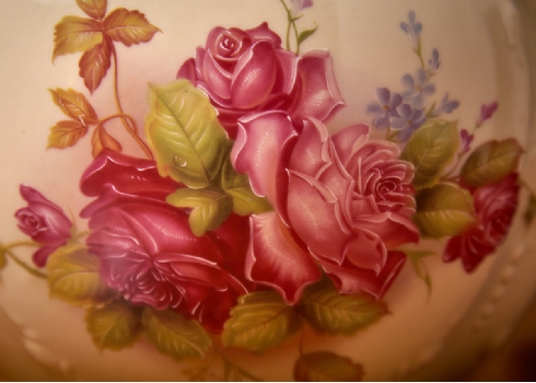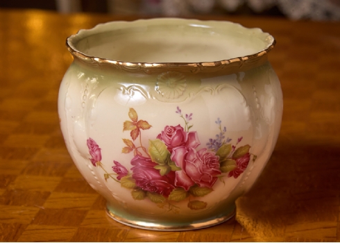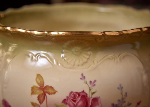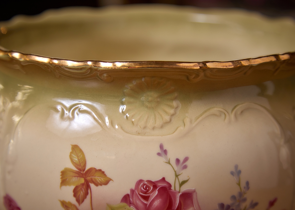 עציץ חרס בסגנון עתיק מעוטר בשושנים פורחות על רקע ירוק, חתום