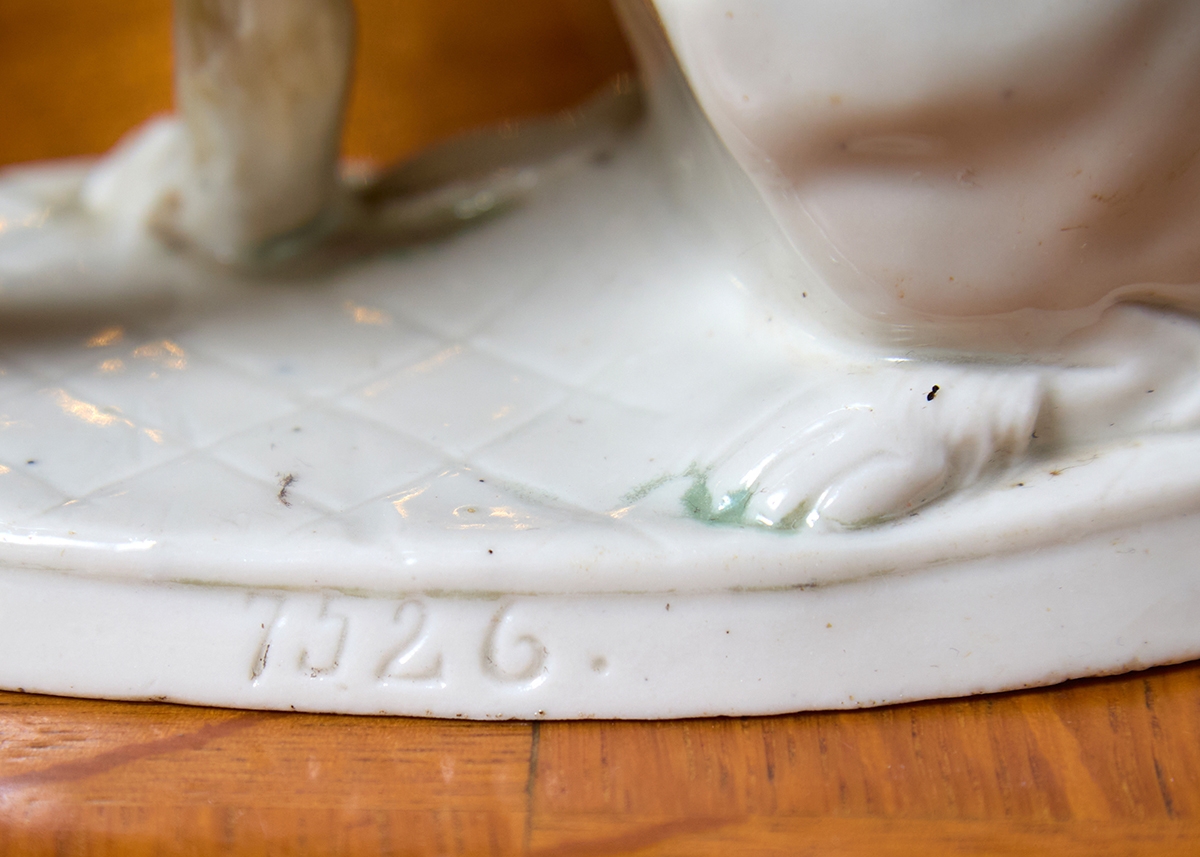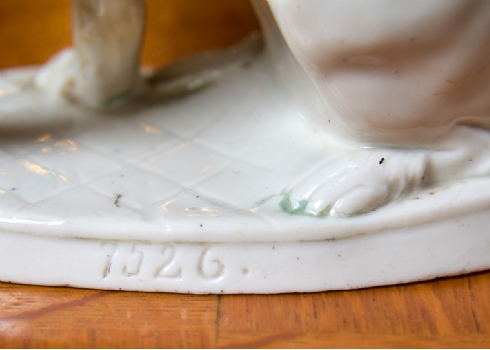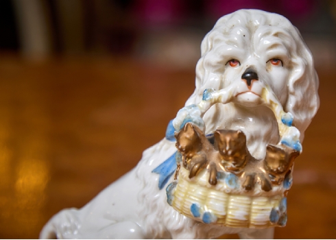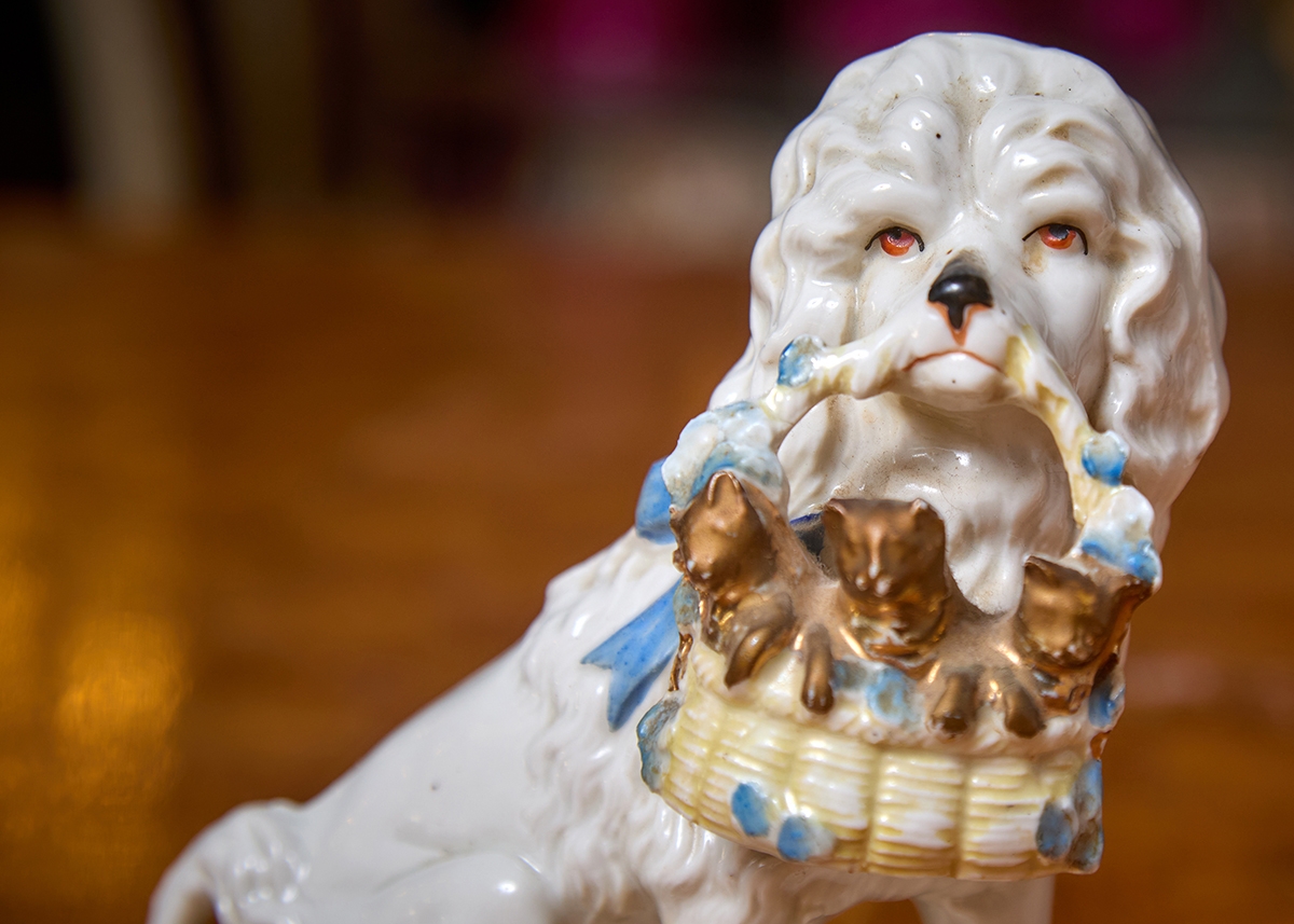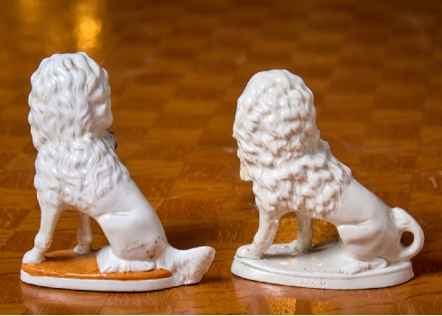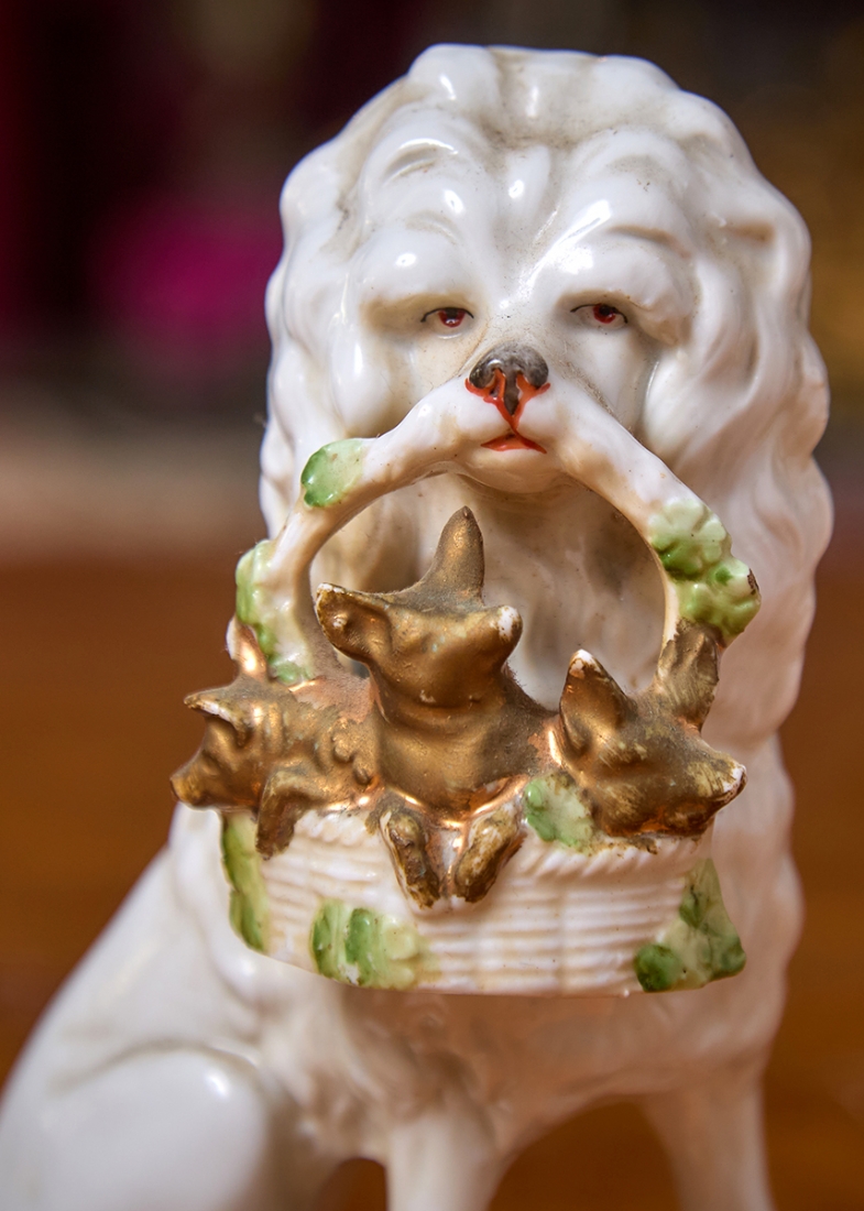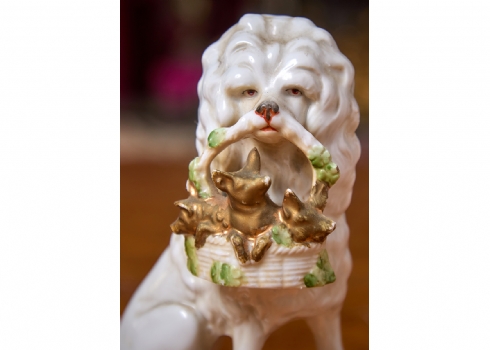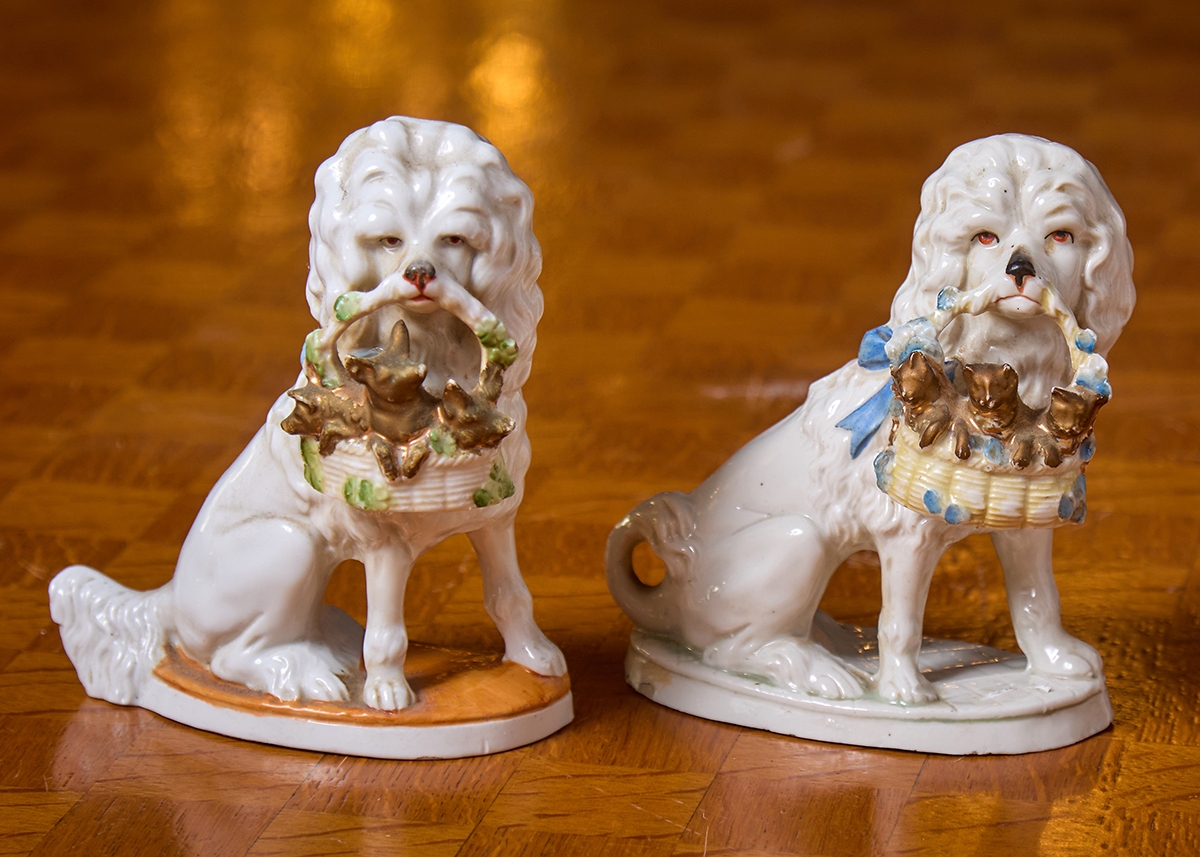שני פסלוני פורצלן בדמות כלבים עם גורים מעוטרים בצביעת יד