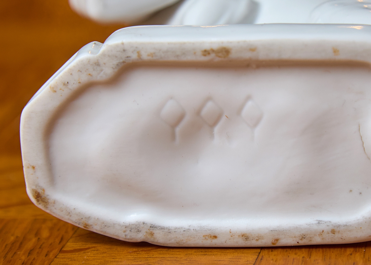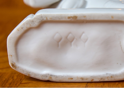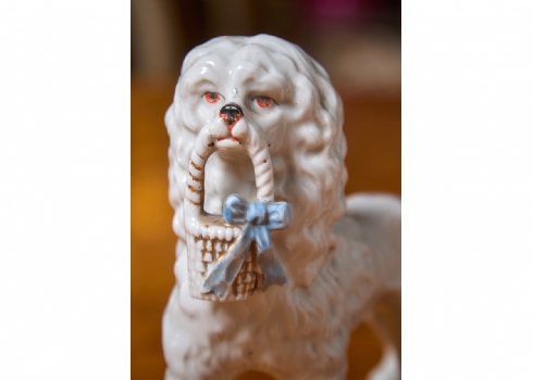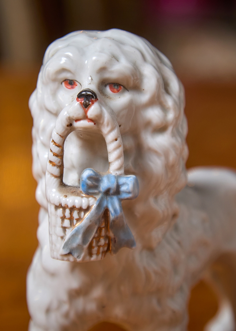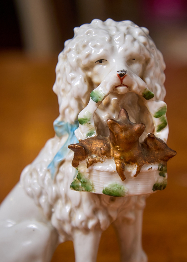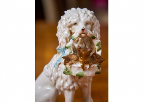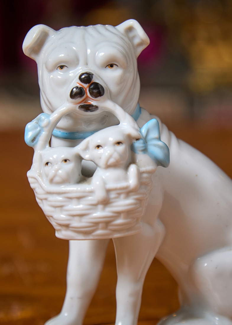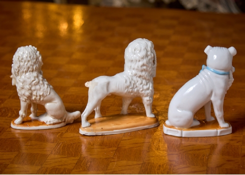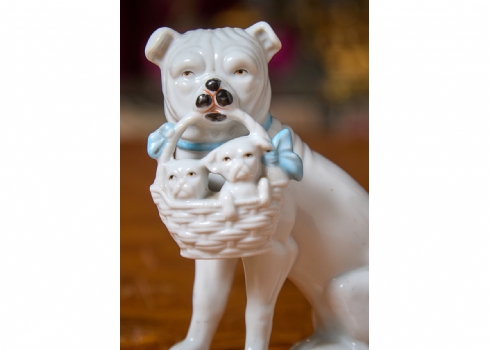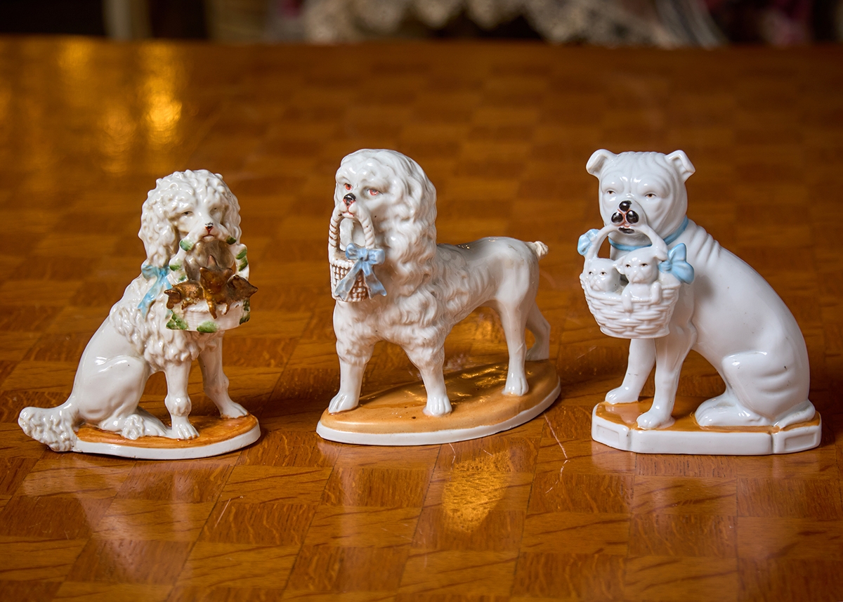 שלושה פסלוני פורצלן בדמות כלבים עם גורים מעוטרים בצביעת יד