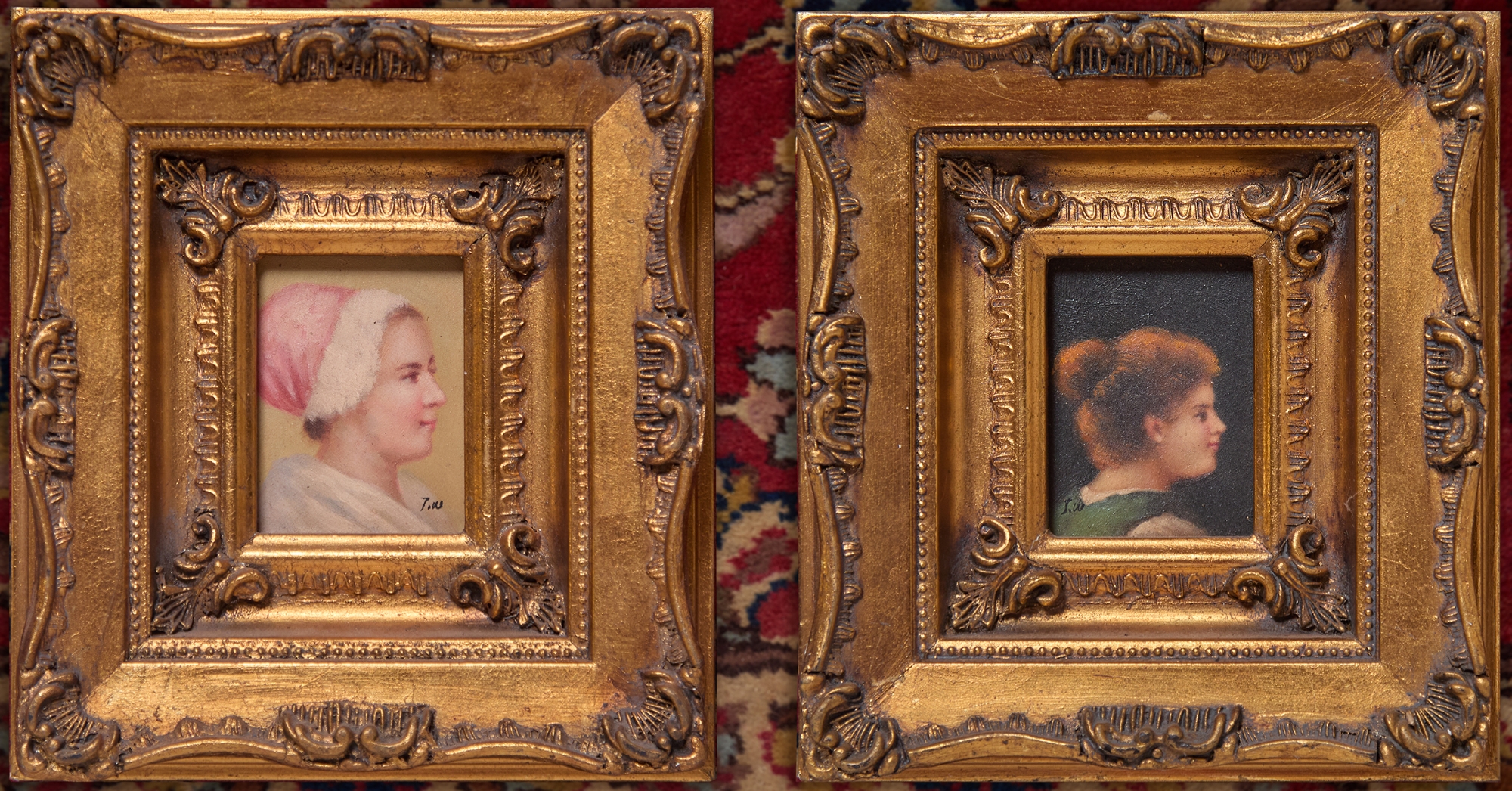 זוג ציורים בסגנון עתיק, שמן על לוח, נתונים במסגרות נאות
