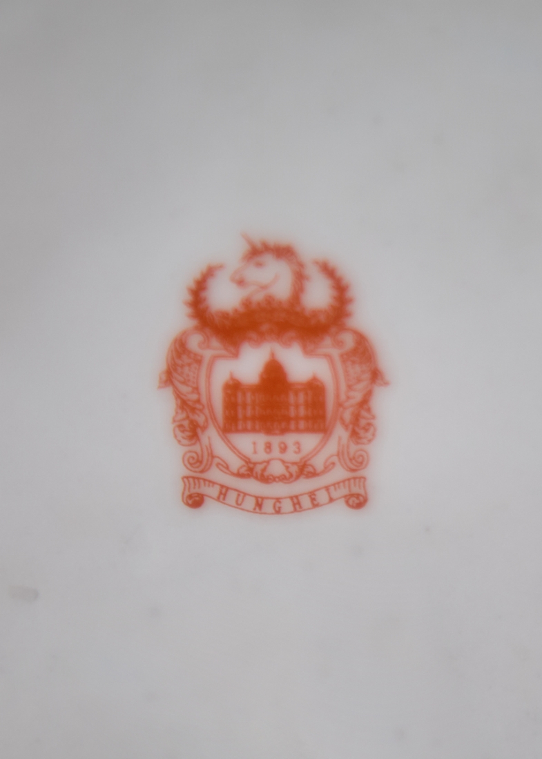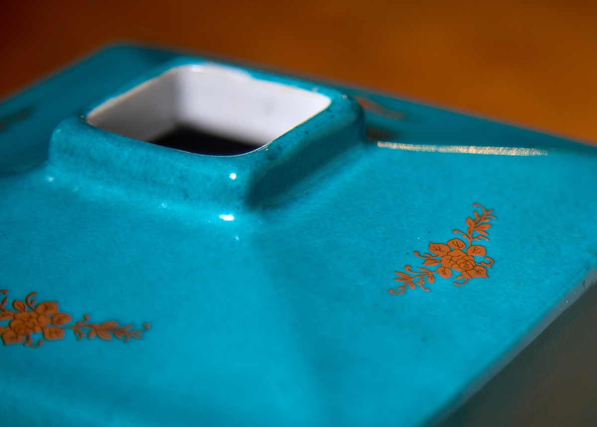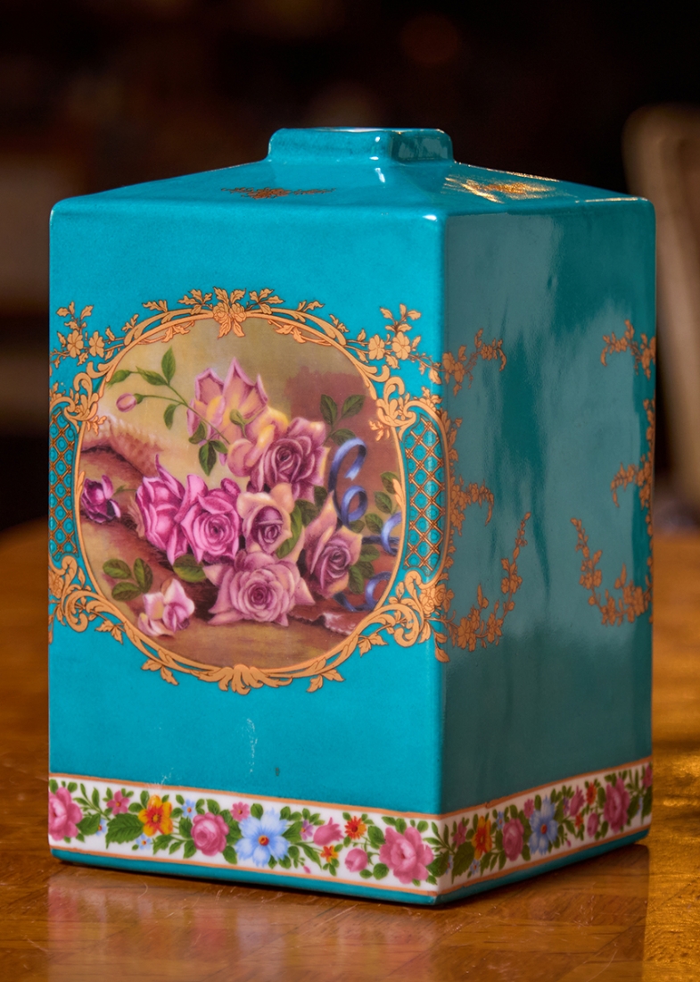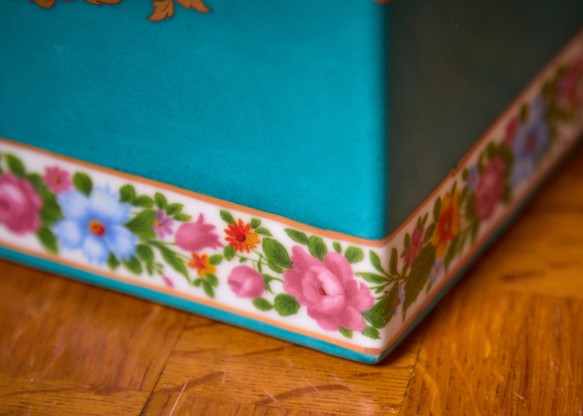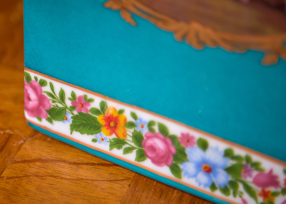 מיכל חרסינה מעוטר בהדפס שושנים על רקע בגוון טורקיז, חתום