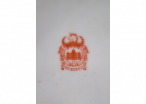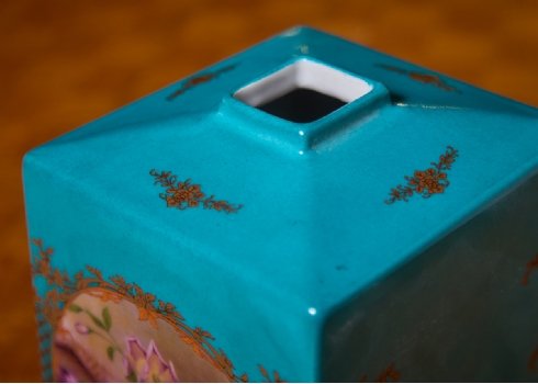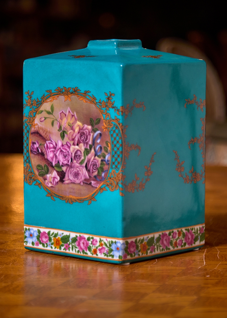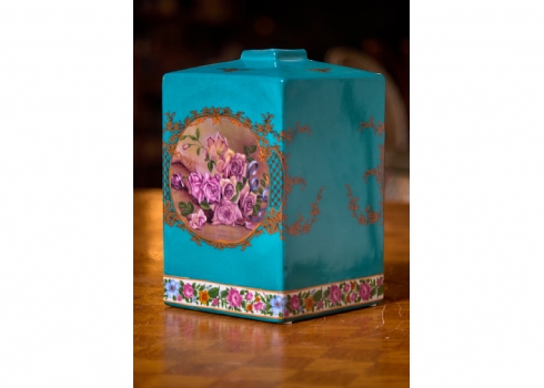 מיכל חרסינה מעוטר בהדפס שושנים על רקע בגוון טורקיז, חתום