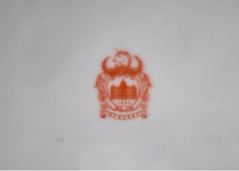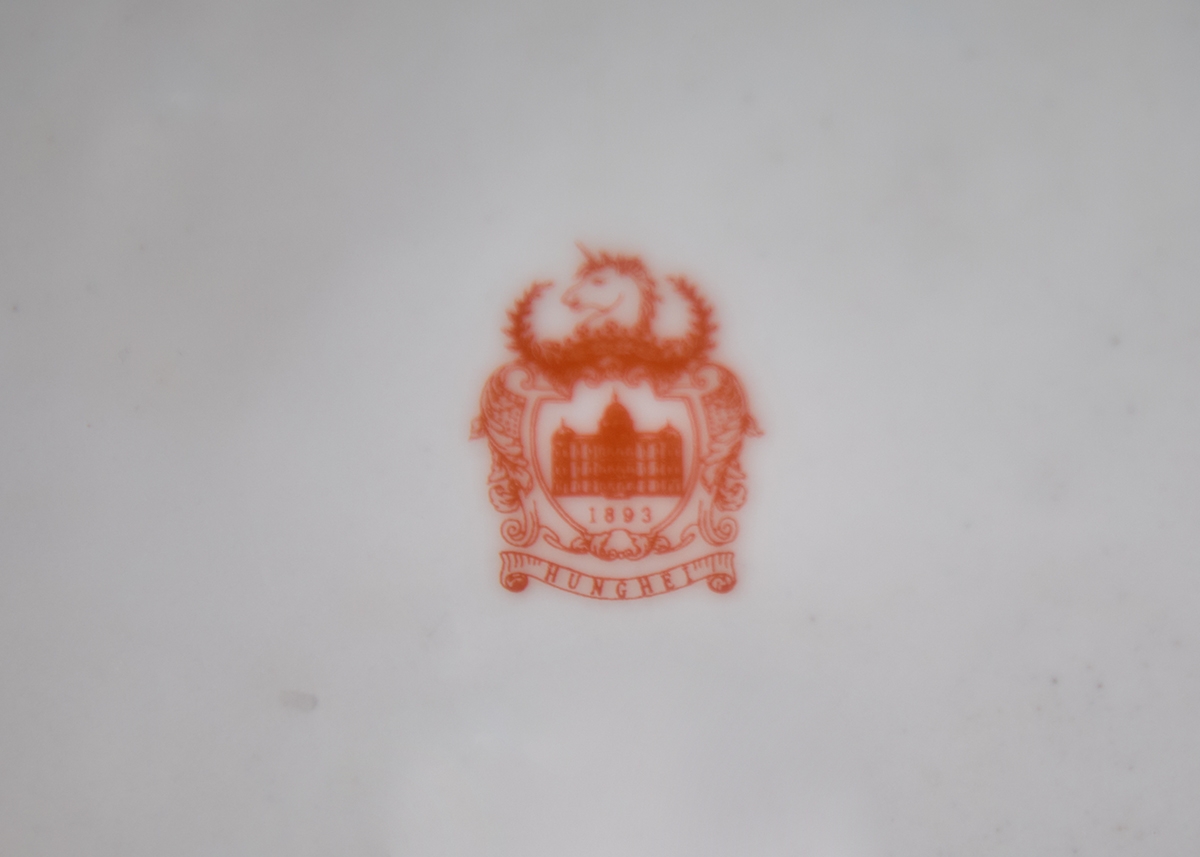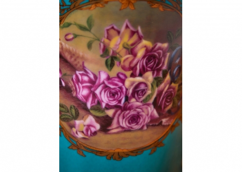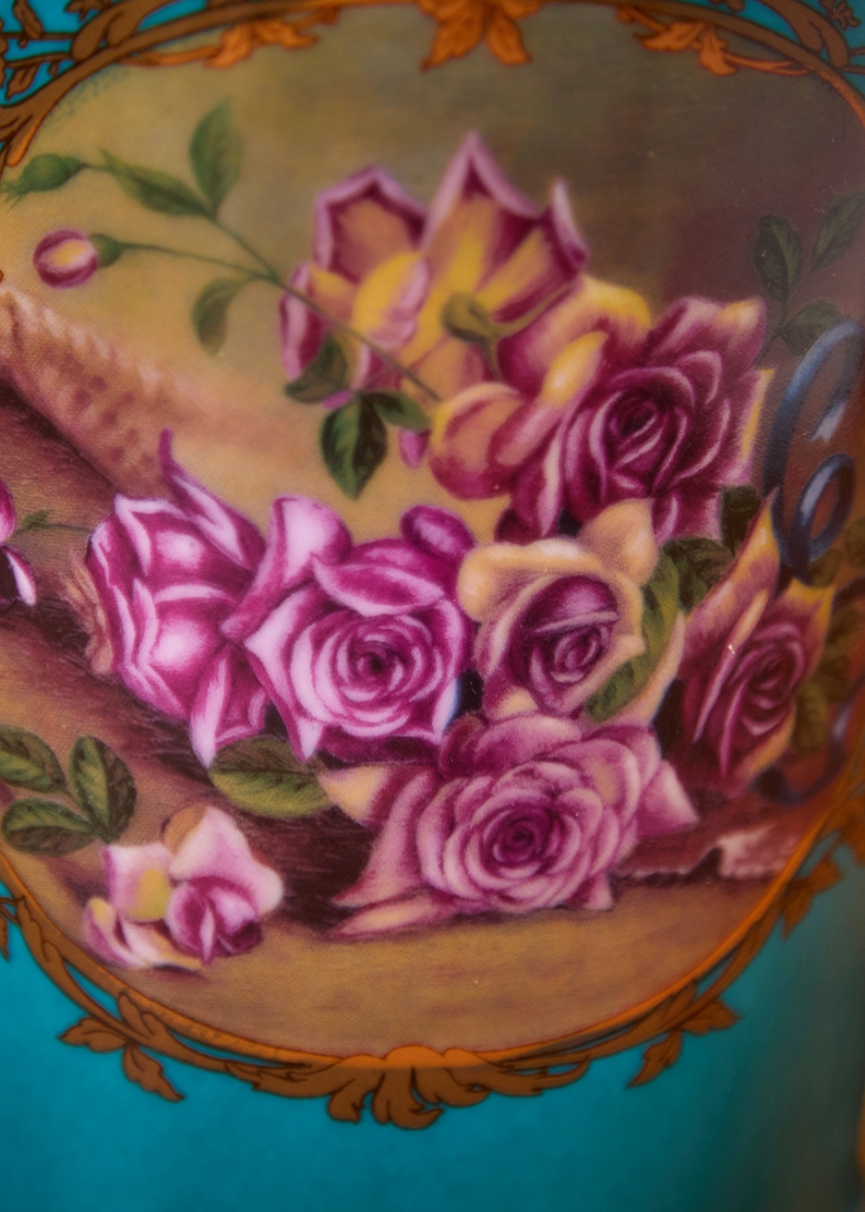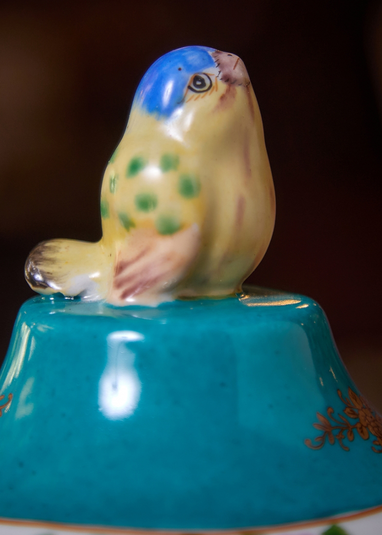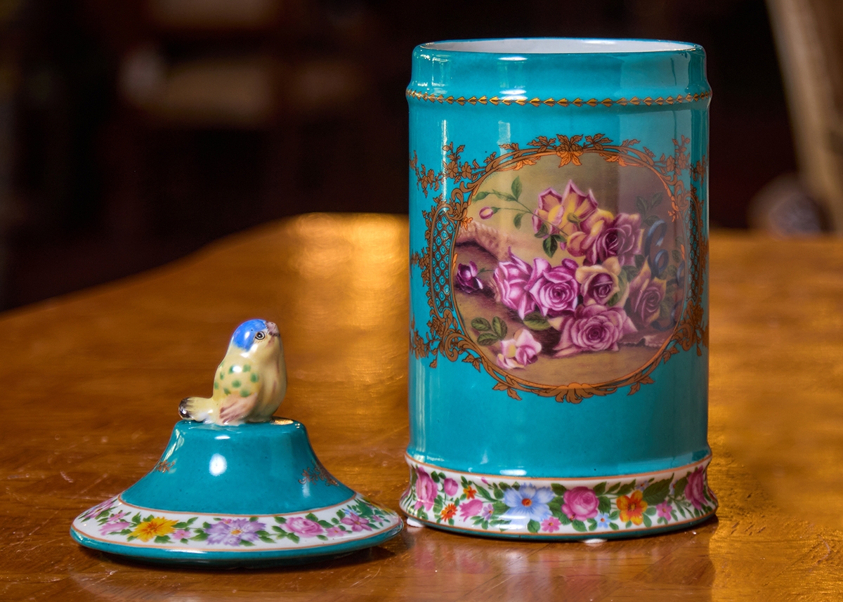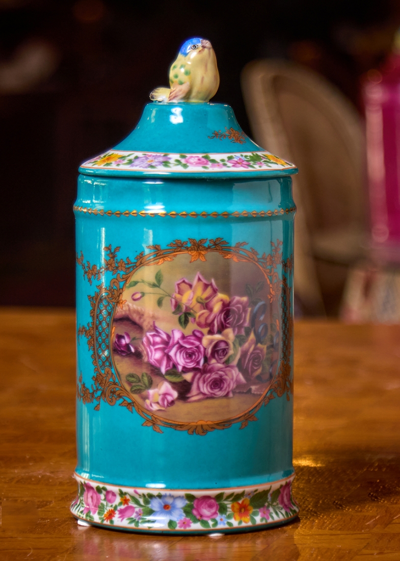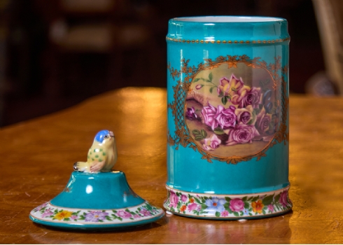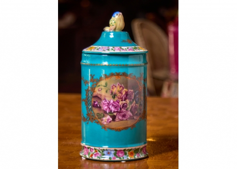 מיכל חרסינה מעוטר שושנים ורקע טורקיז, ומכסה תואם, חתום