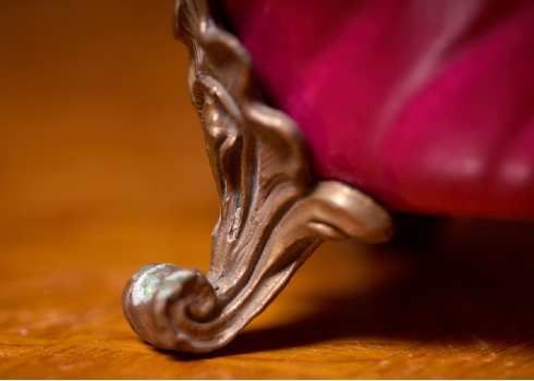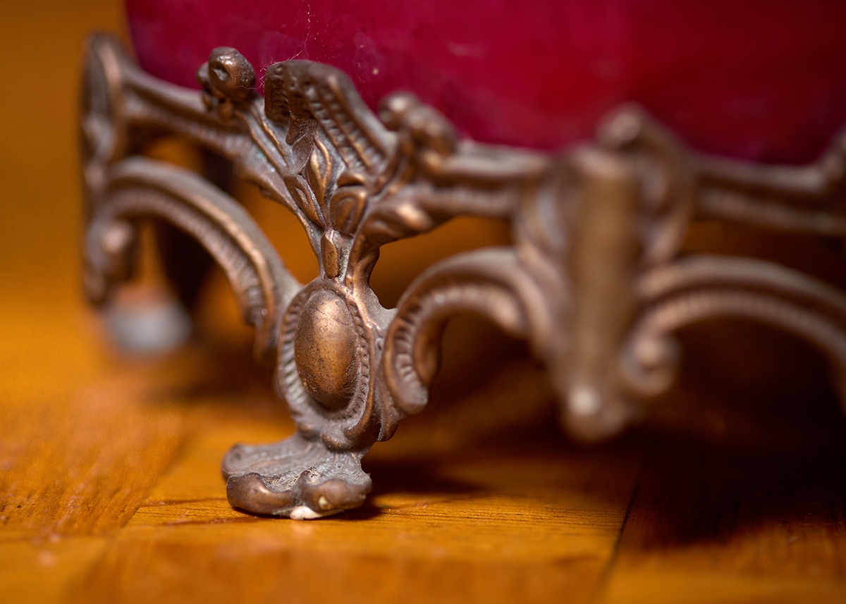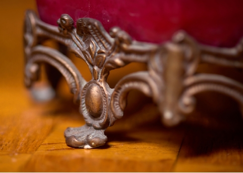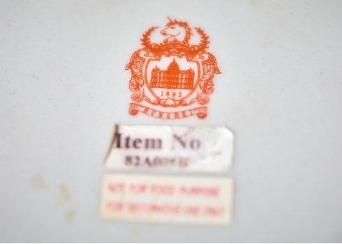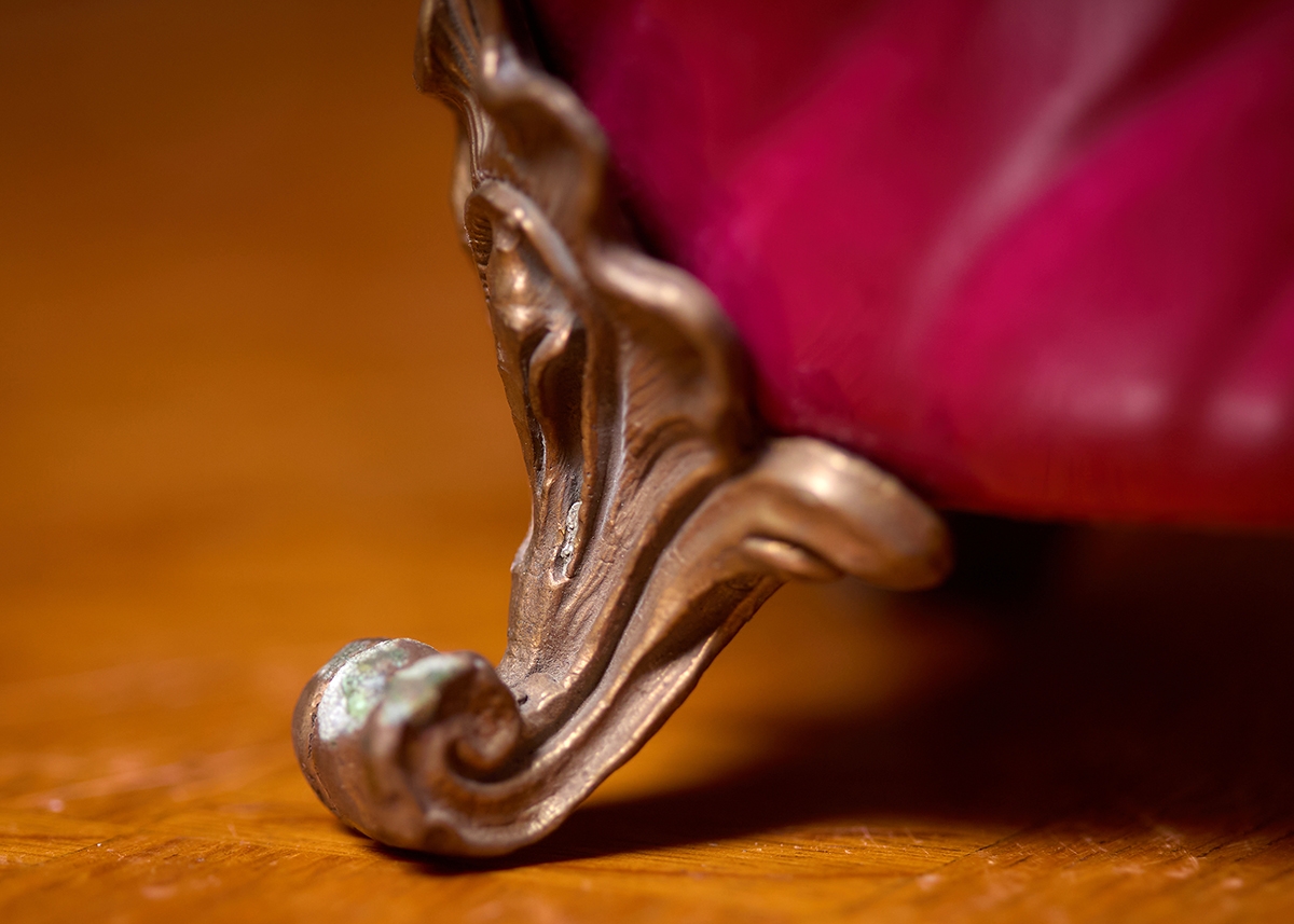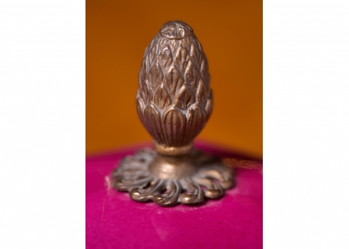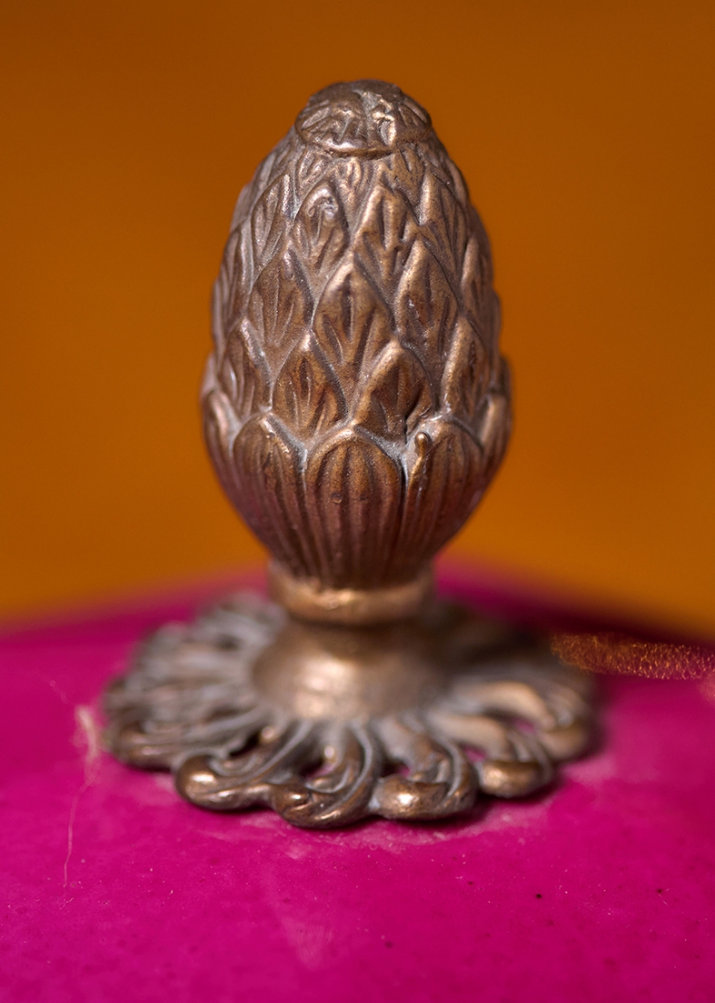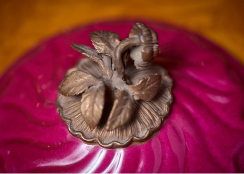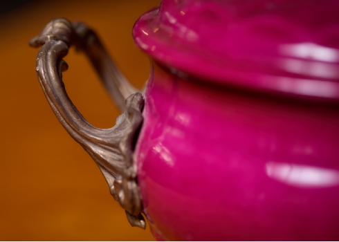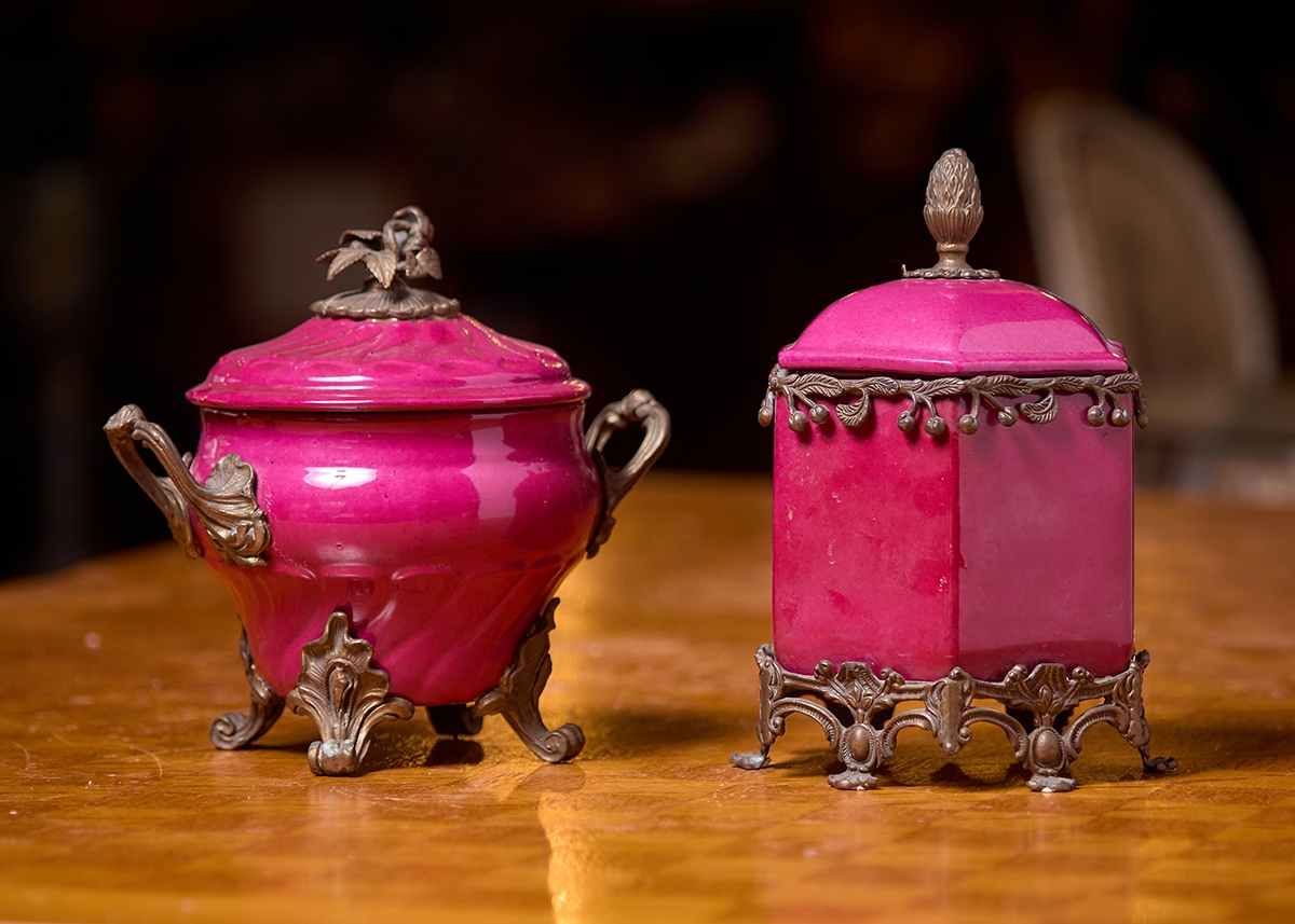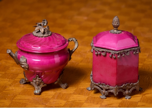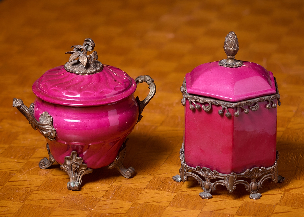 זוג כלי נוי עשויים חרסינה מעוטרים באמייל בגוון סגול והתקני מתכת, חתום