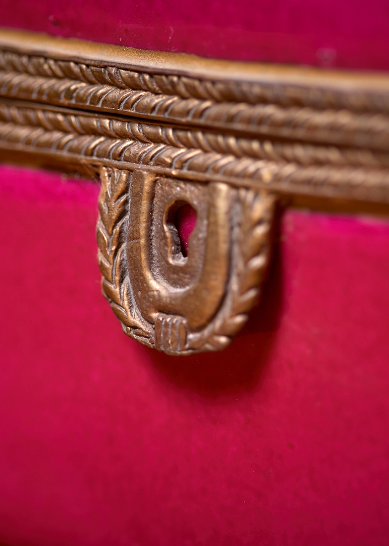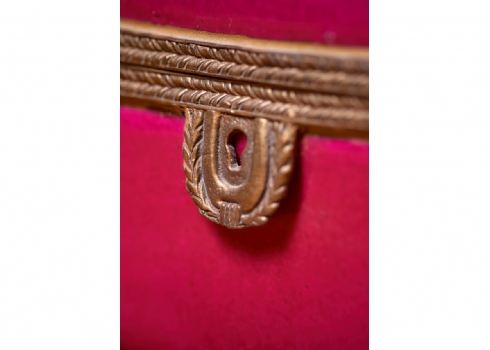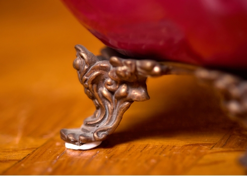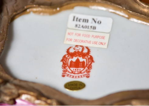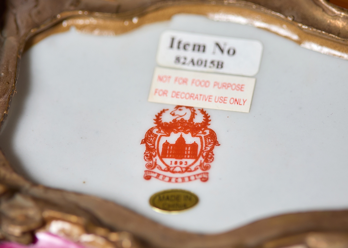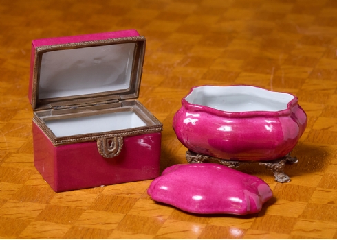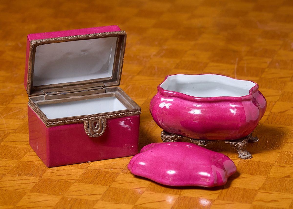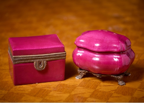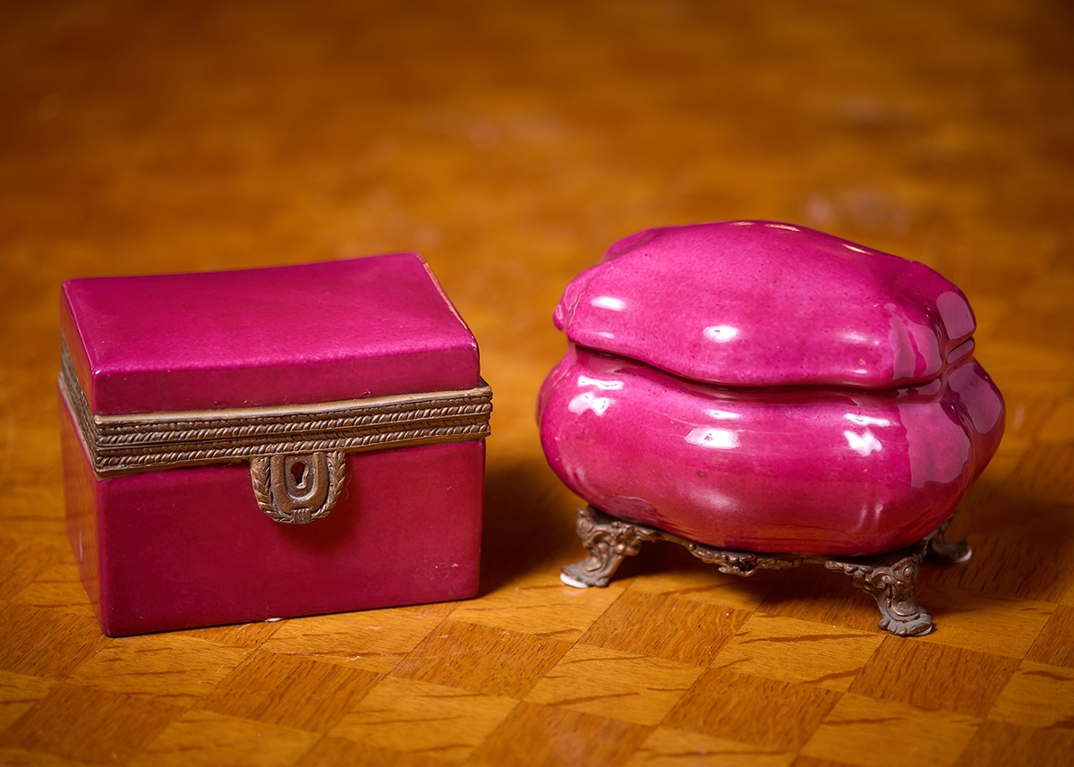 זוג כלי נוי עשויים חרסינה מעוטרים באמייל בגוון סגול והתקני מתכת, חתום