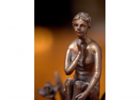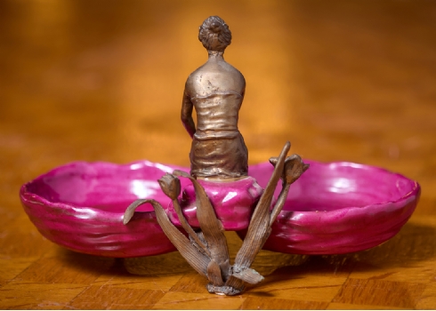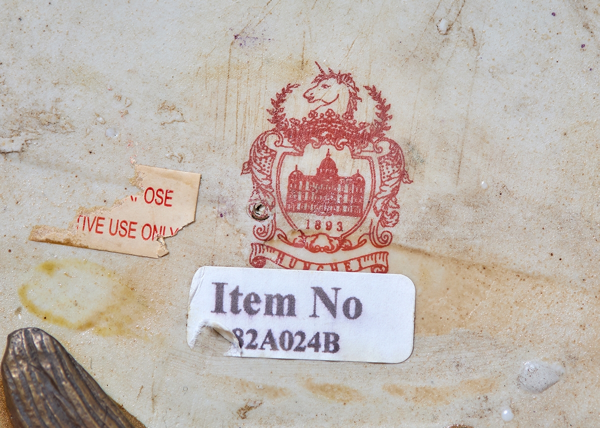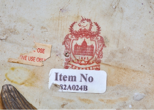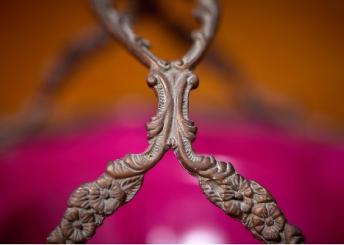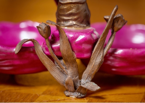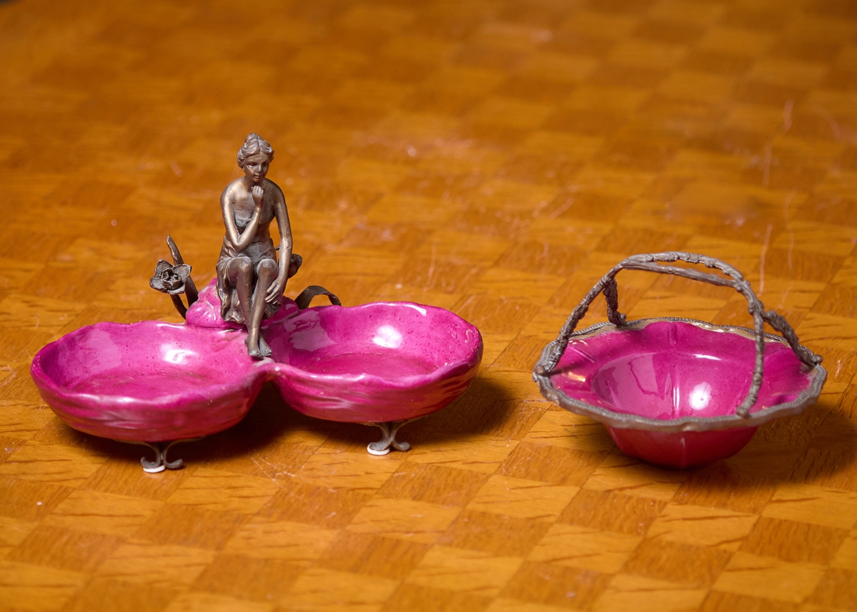 זוג כלי נוי עשויים חרסינה מעוטרים באמייל בגוון סגול והתקני מתכת, חתום