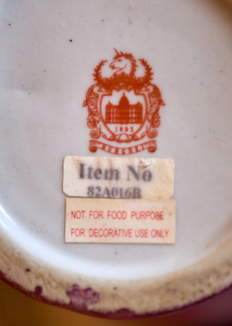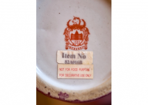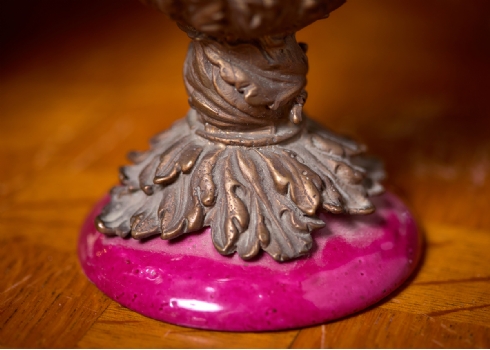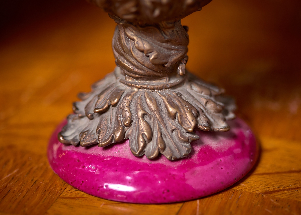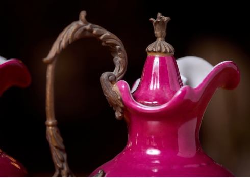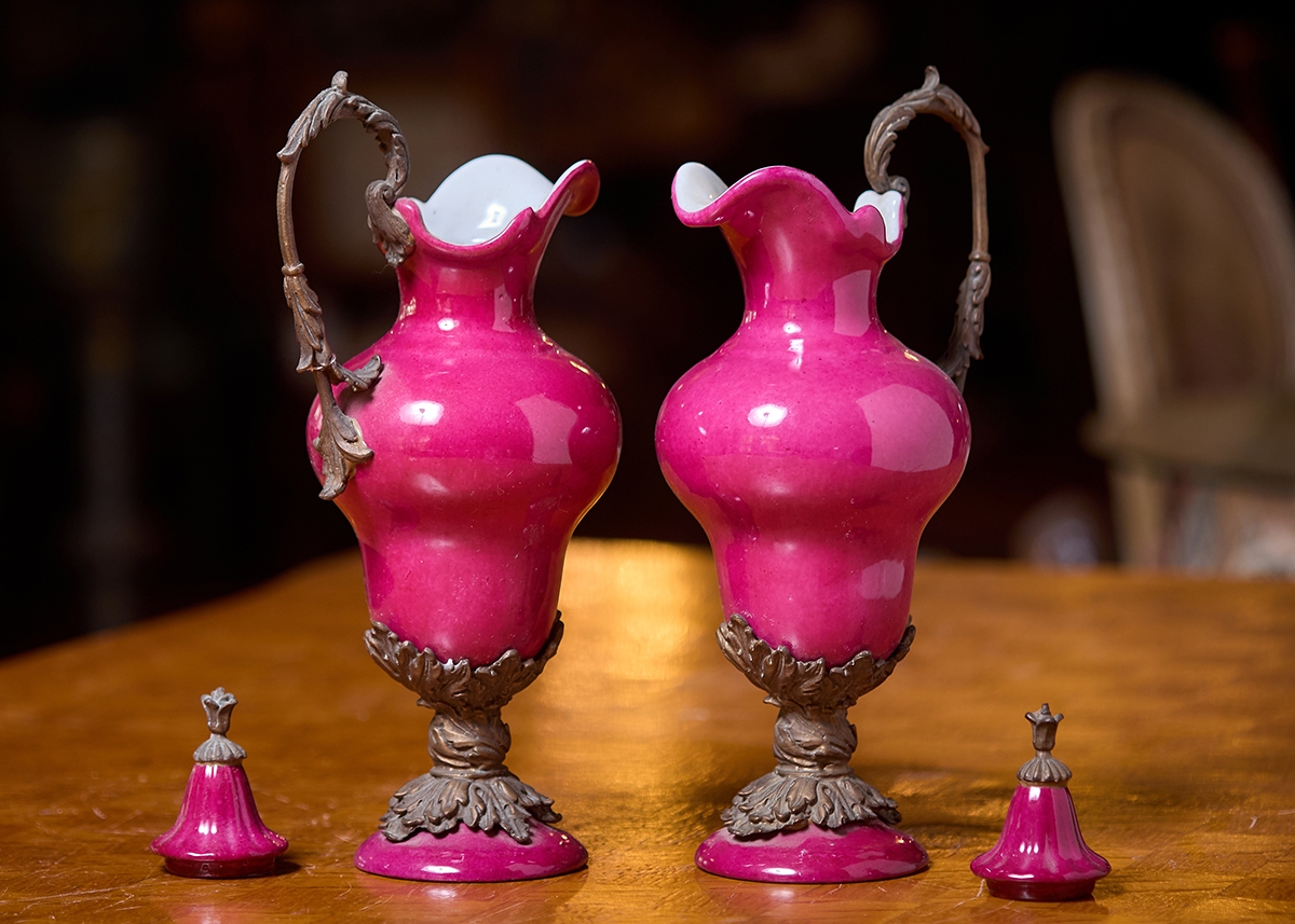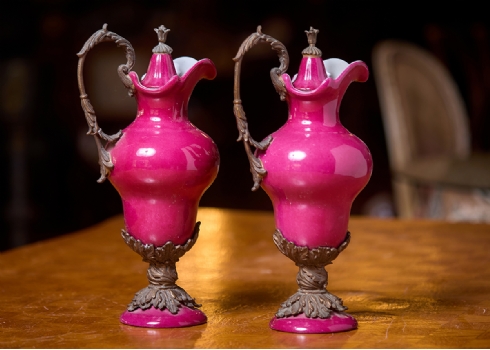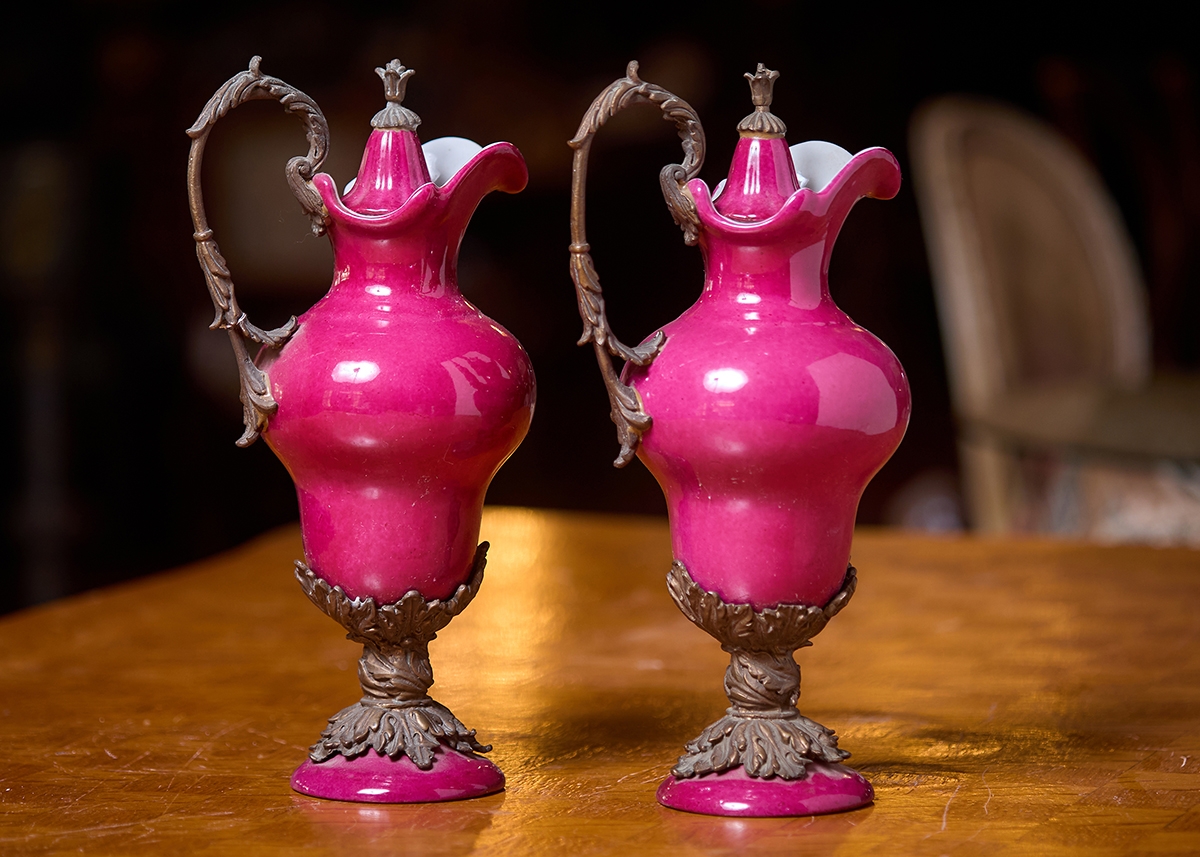 זוג כלי נוי עשויים חרסינה מעוטרים באמייל בגוון סגול והתקני מתכת, חתום