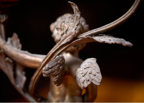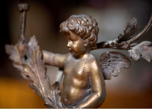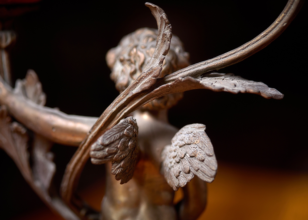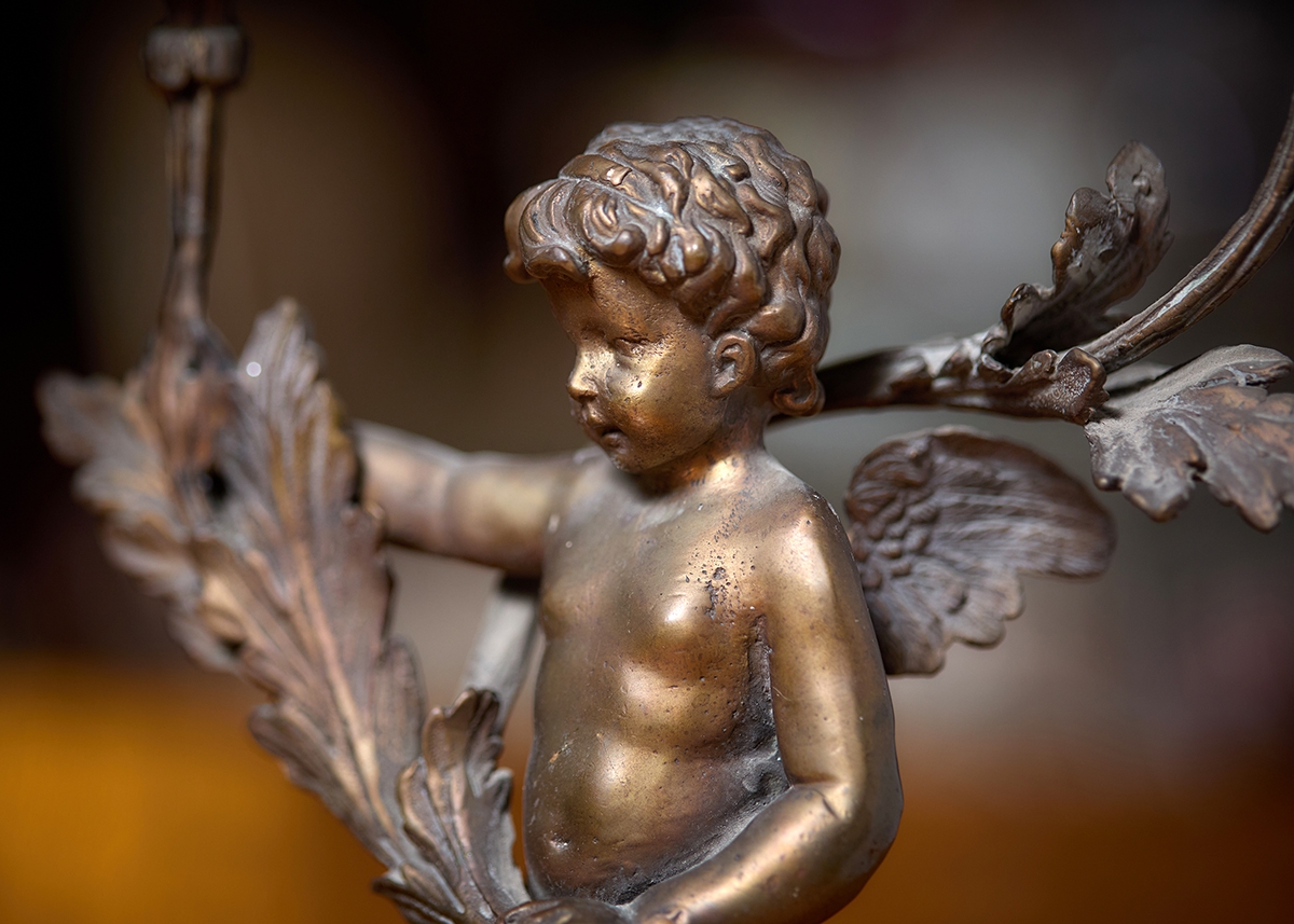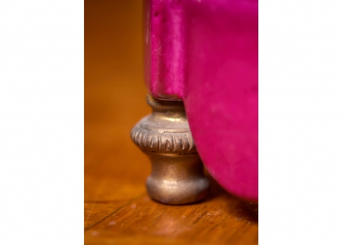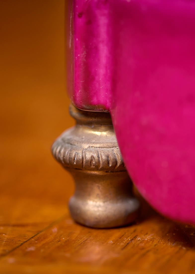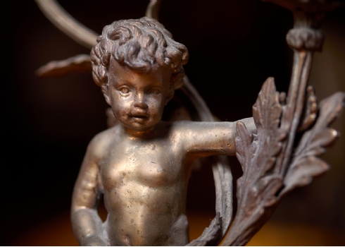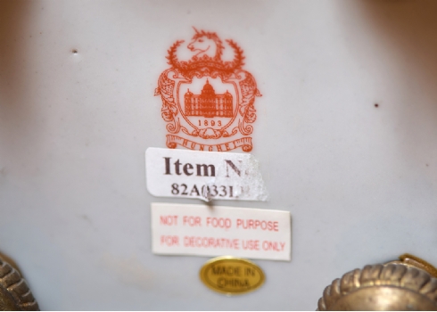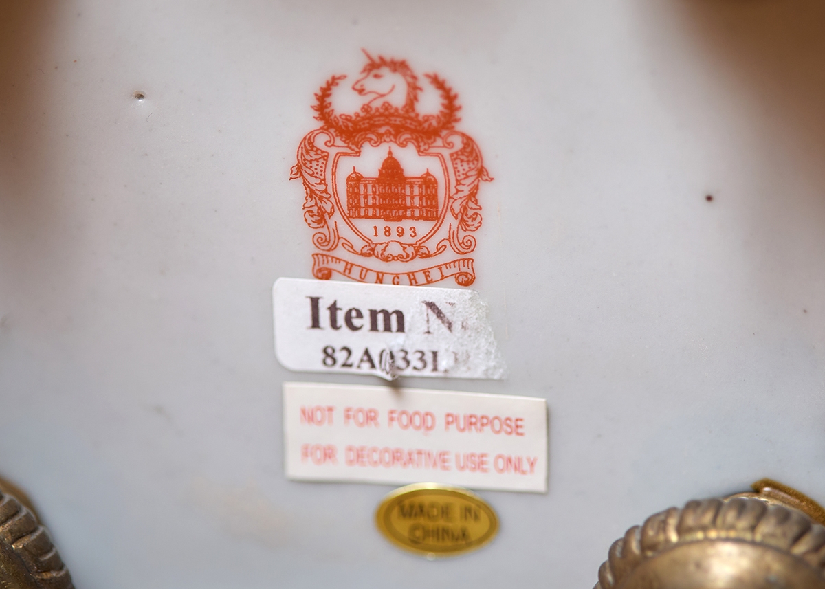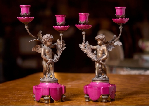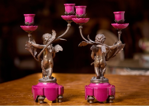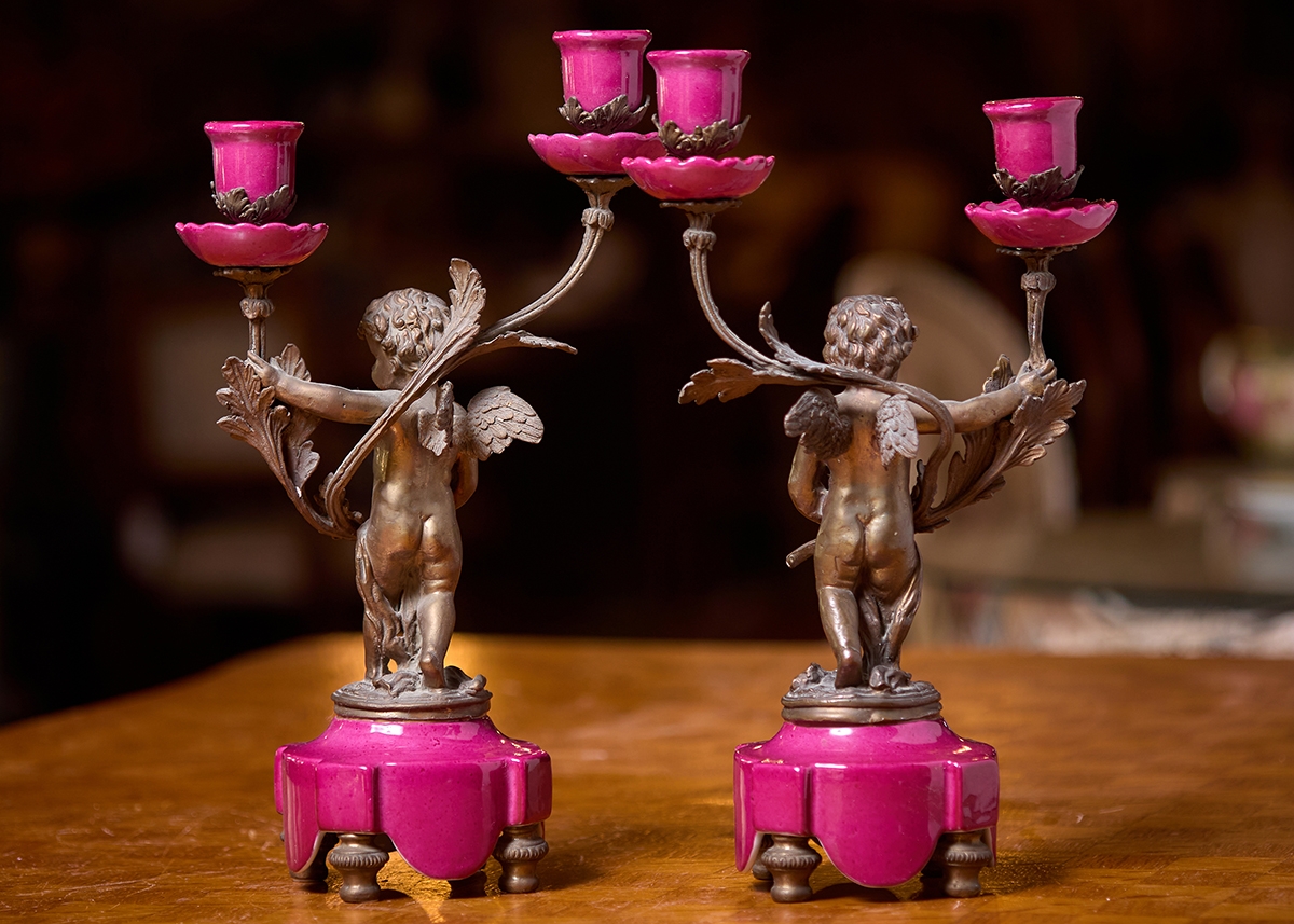 זוג פמוטים עשויים חרסינה מעוטרים באמייל בגוון סגול והתקני מתכת, חתום