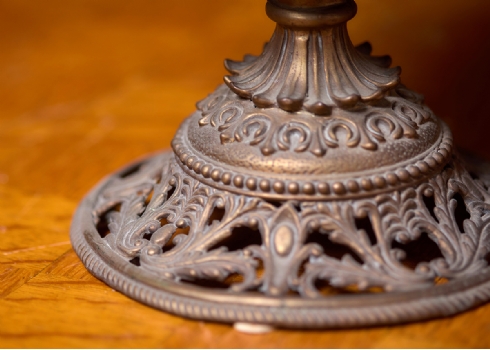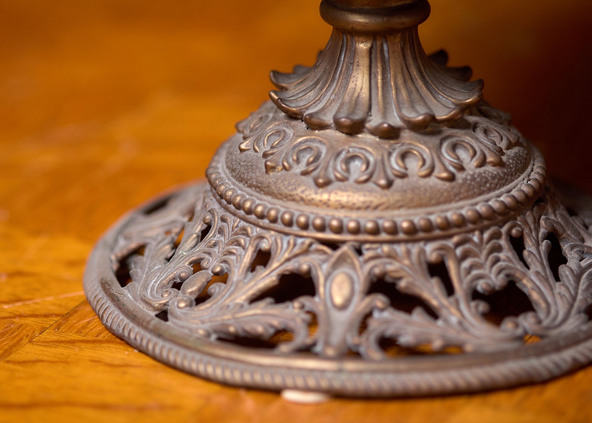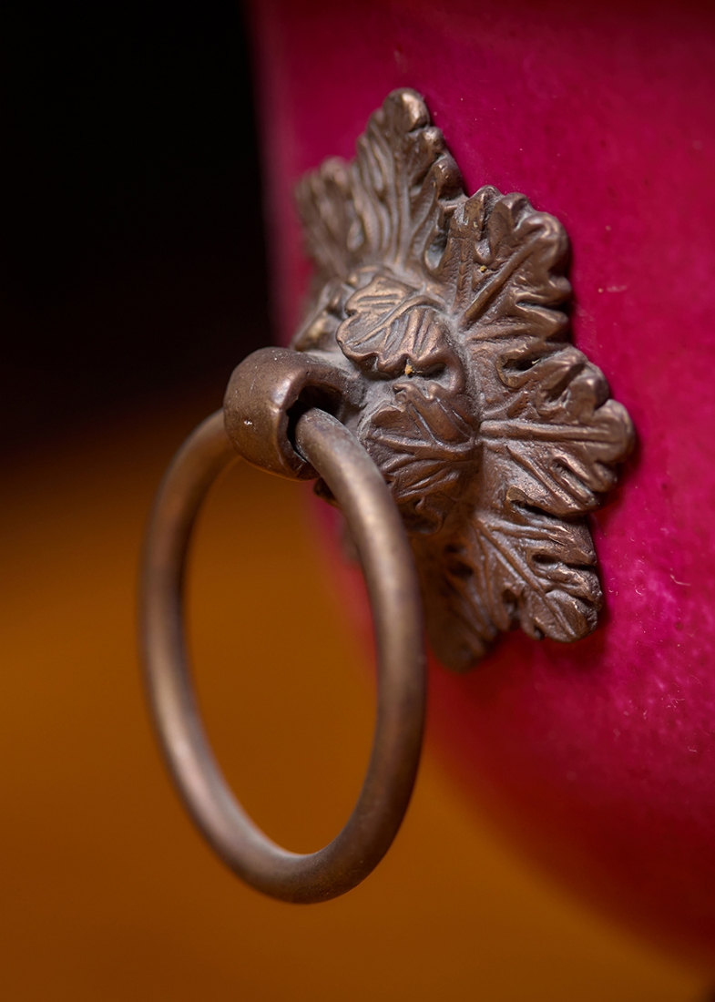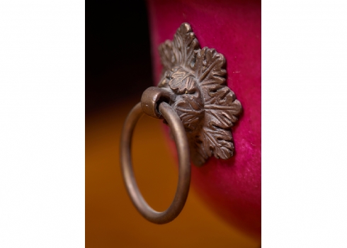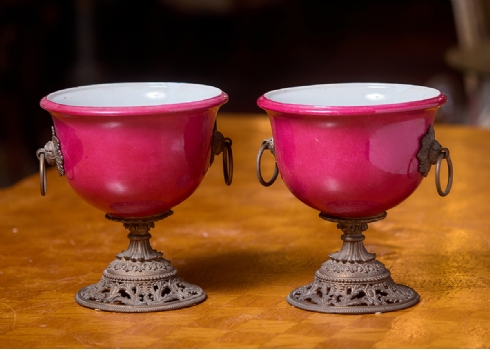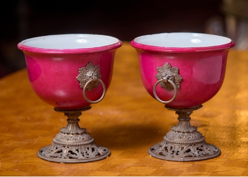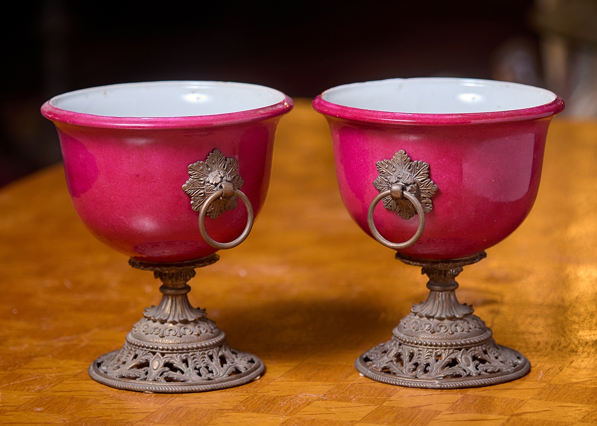 זוג כלי נוי עשויים חרסינה מעוטרים באמייל בגוון סגול והתקני מתכת, חתום