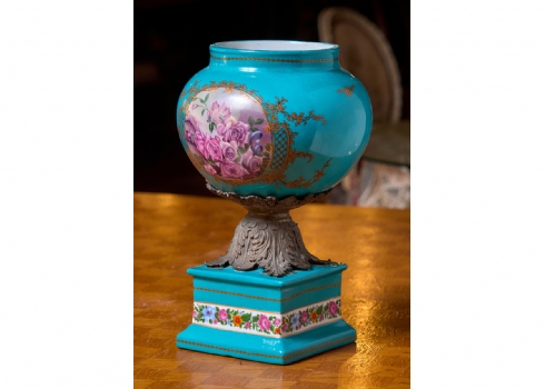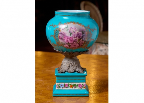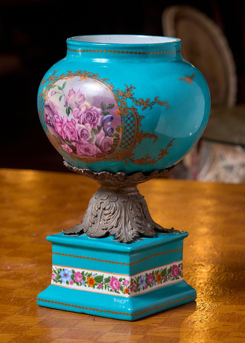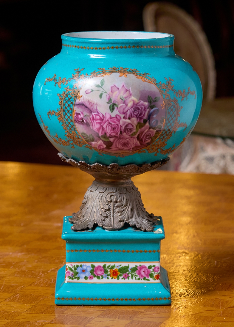 כד חרס גדול מעוטר בהדפס שושנים על רקע בגוון טורקיז