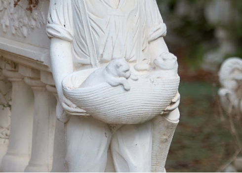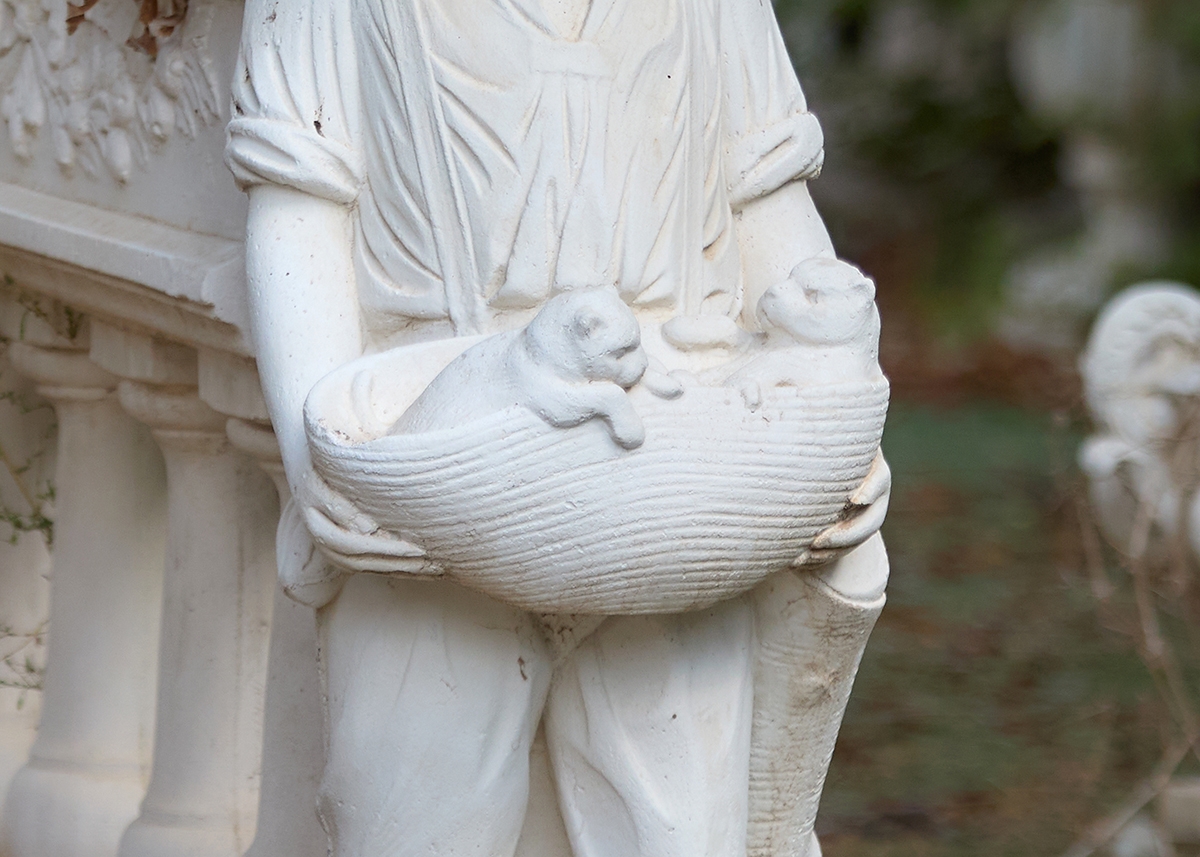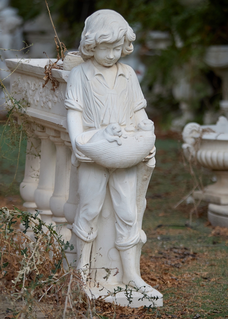 פסל גינה בדמות נער נושא גורי חתולים בסלסלת נצרים