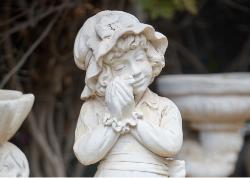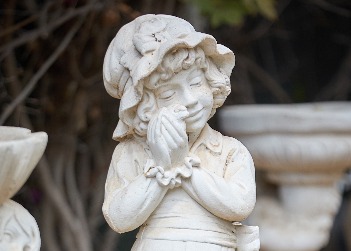 פסל גינה בדמות ילדה מחזיקה אפרוח לצד תרנגולת