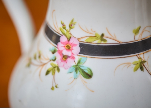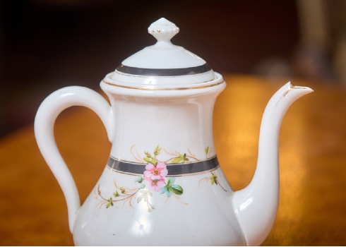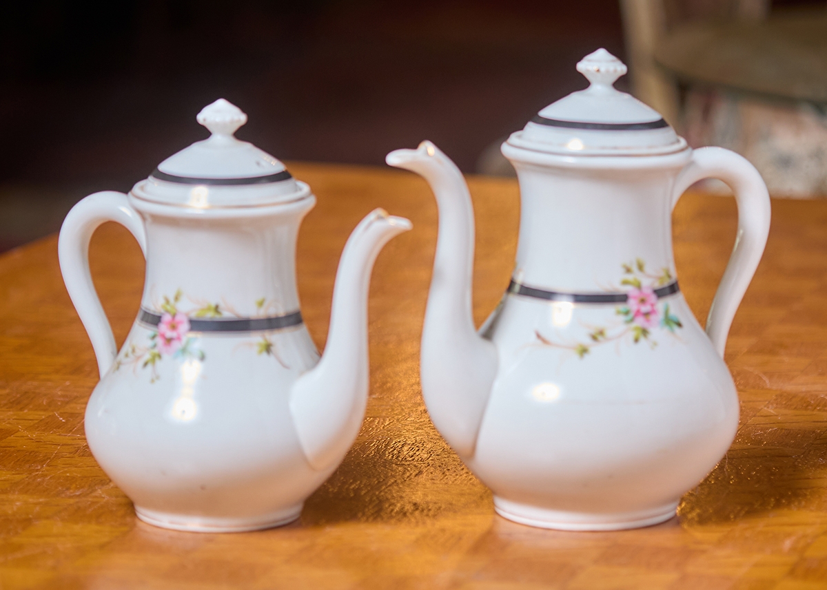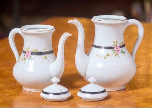 זוג קומקומי פורצלן צרפתים עתיקים מעוטרים ציורי יד באמייל ובזהב, לא חתומים