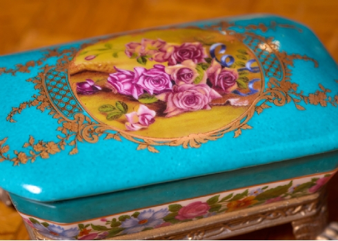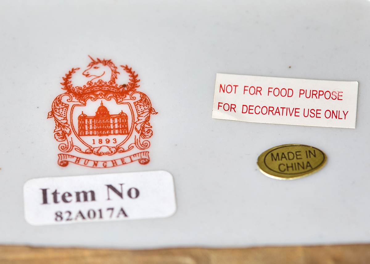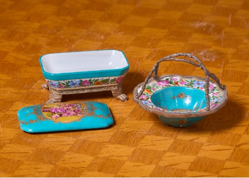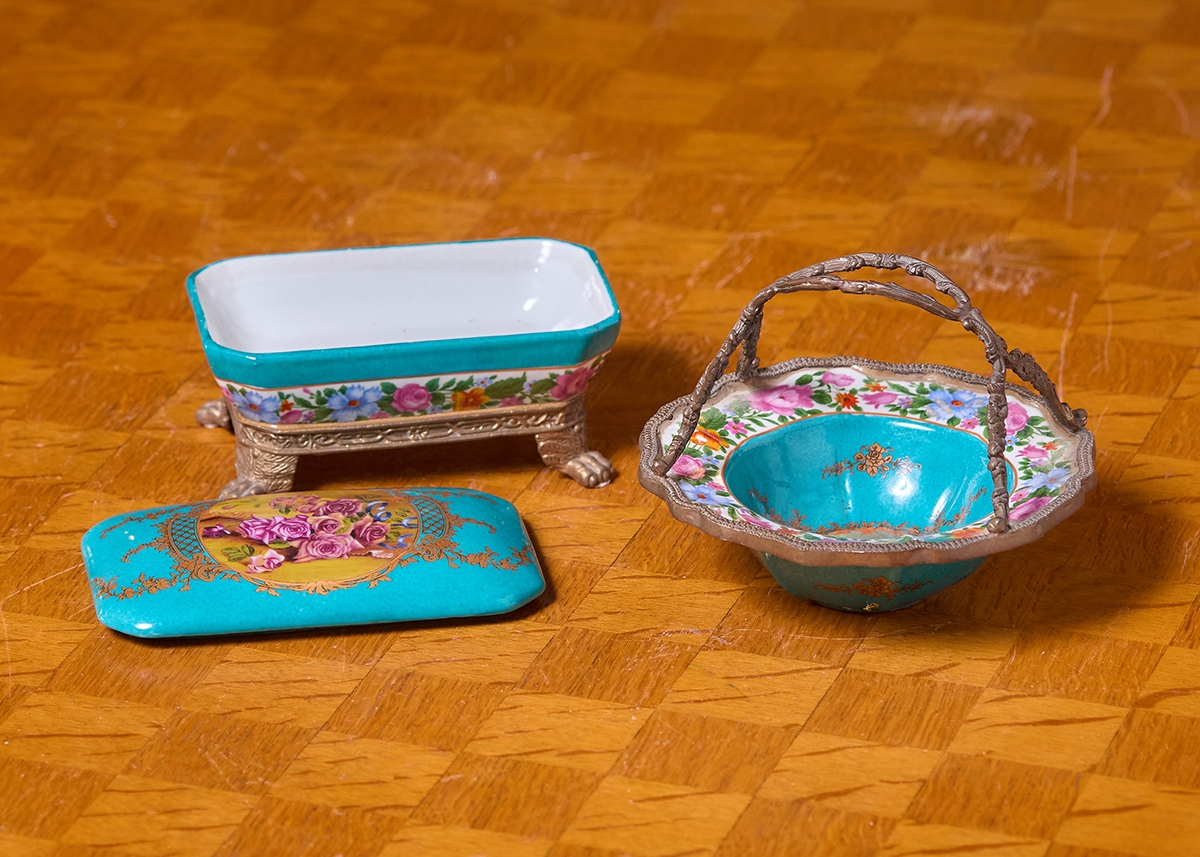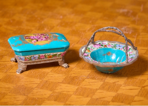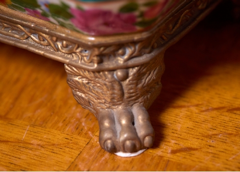 שני כלי נוי עשויים חרס מעוטרים בהדפס של שושני פורחות וזהב