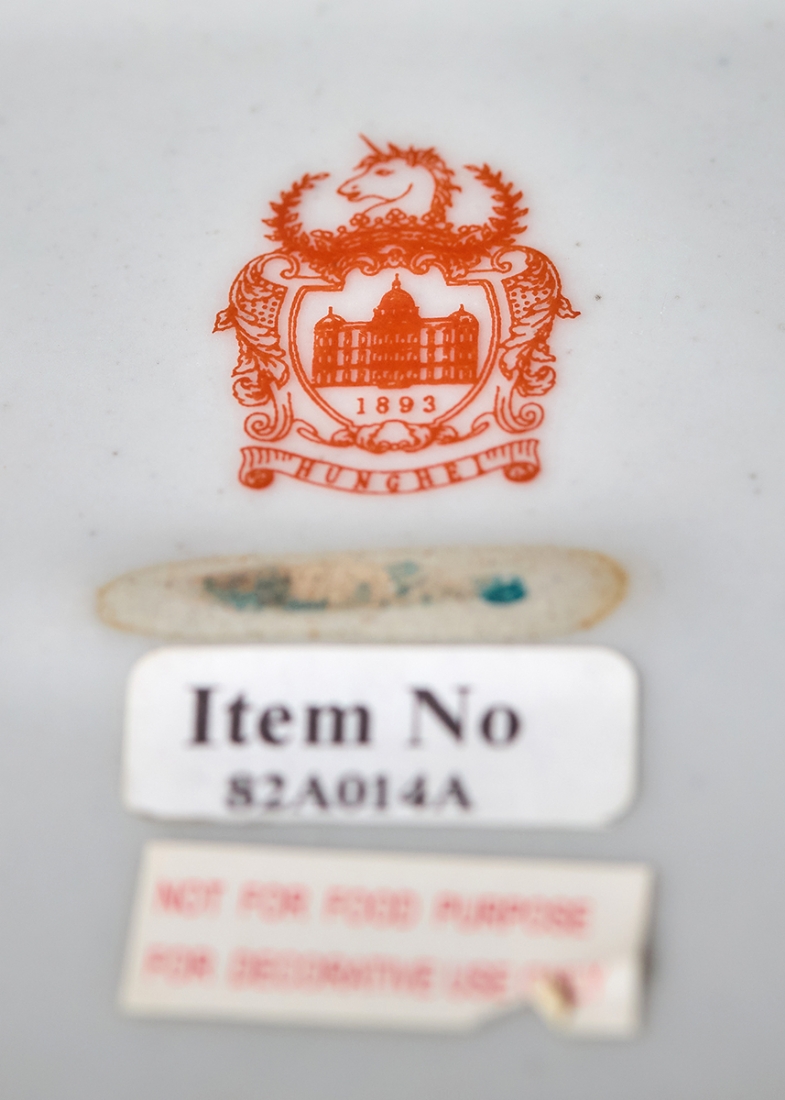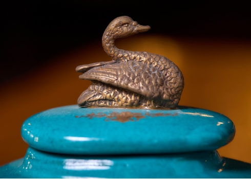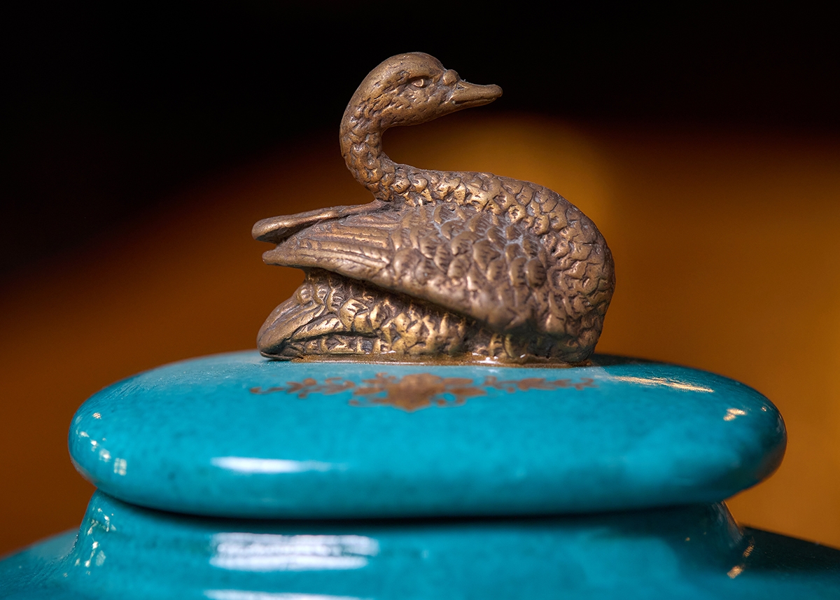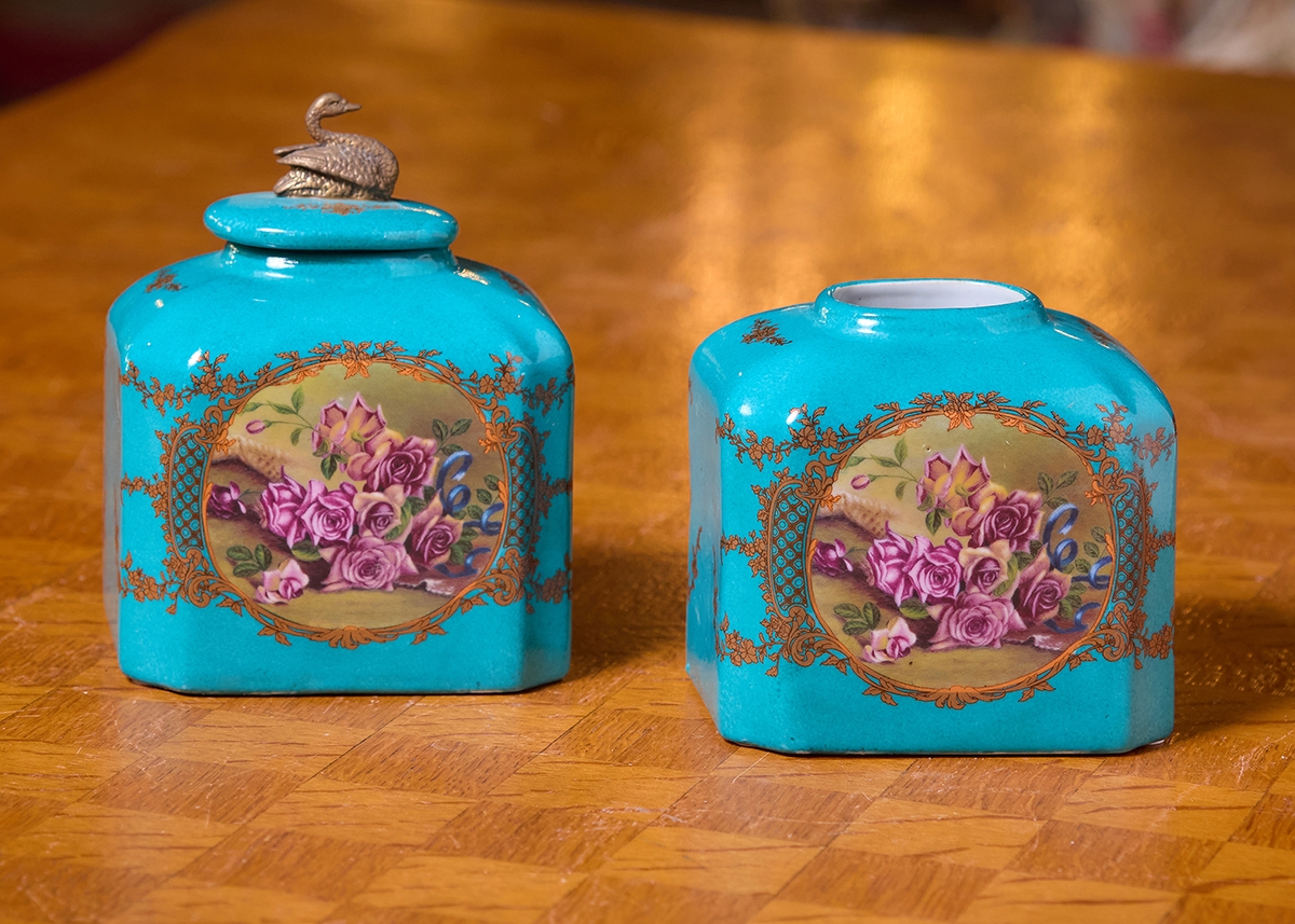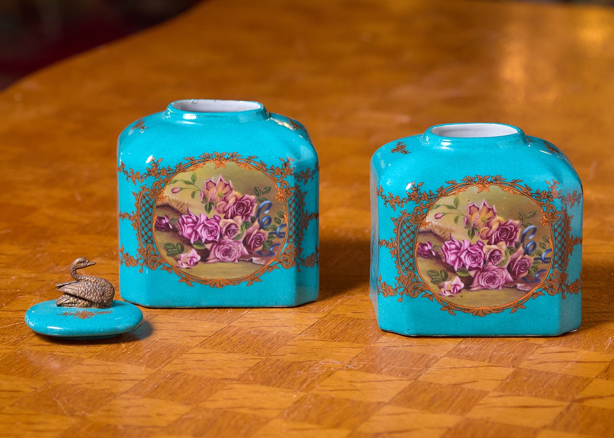 שני כלי נוי עשויים חרס מעוטרים בהדפס של שושני פורחות וזהב