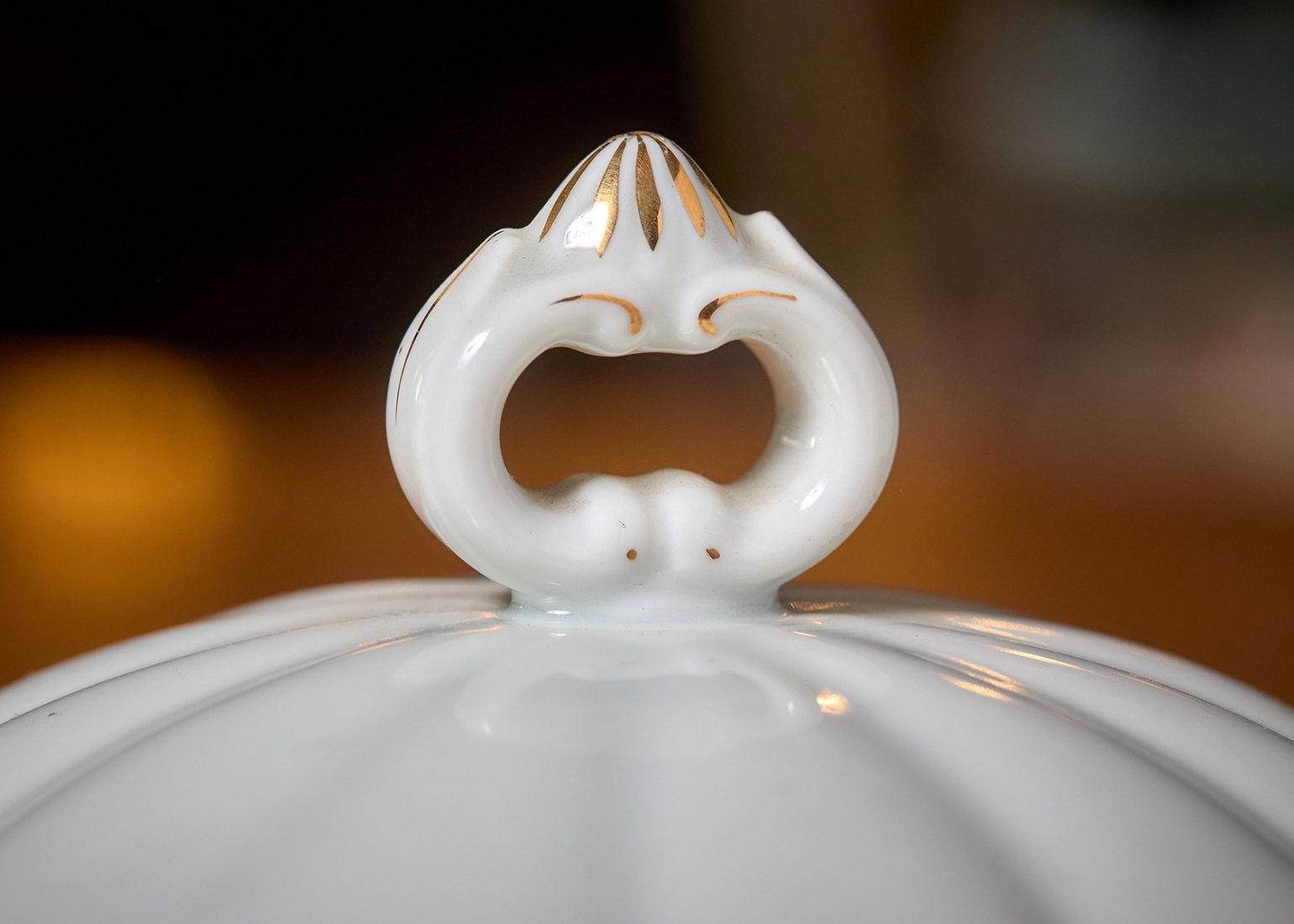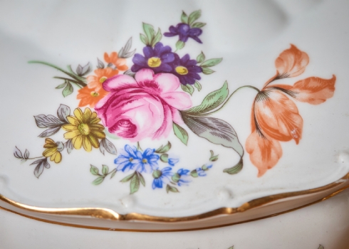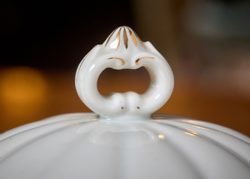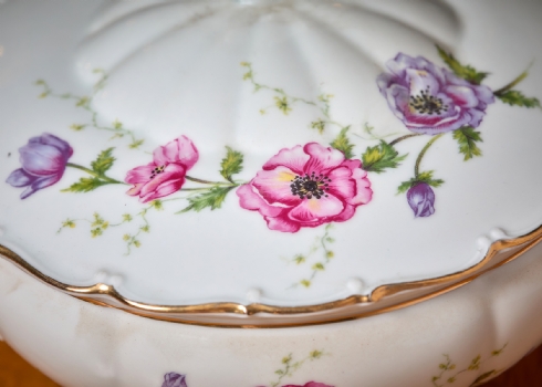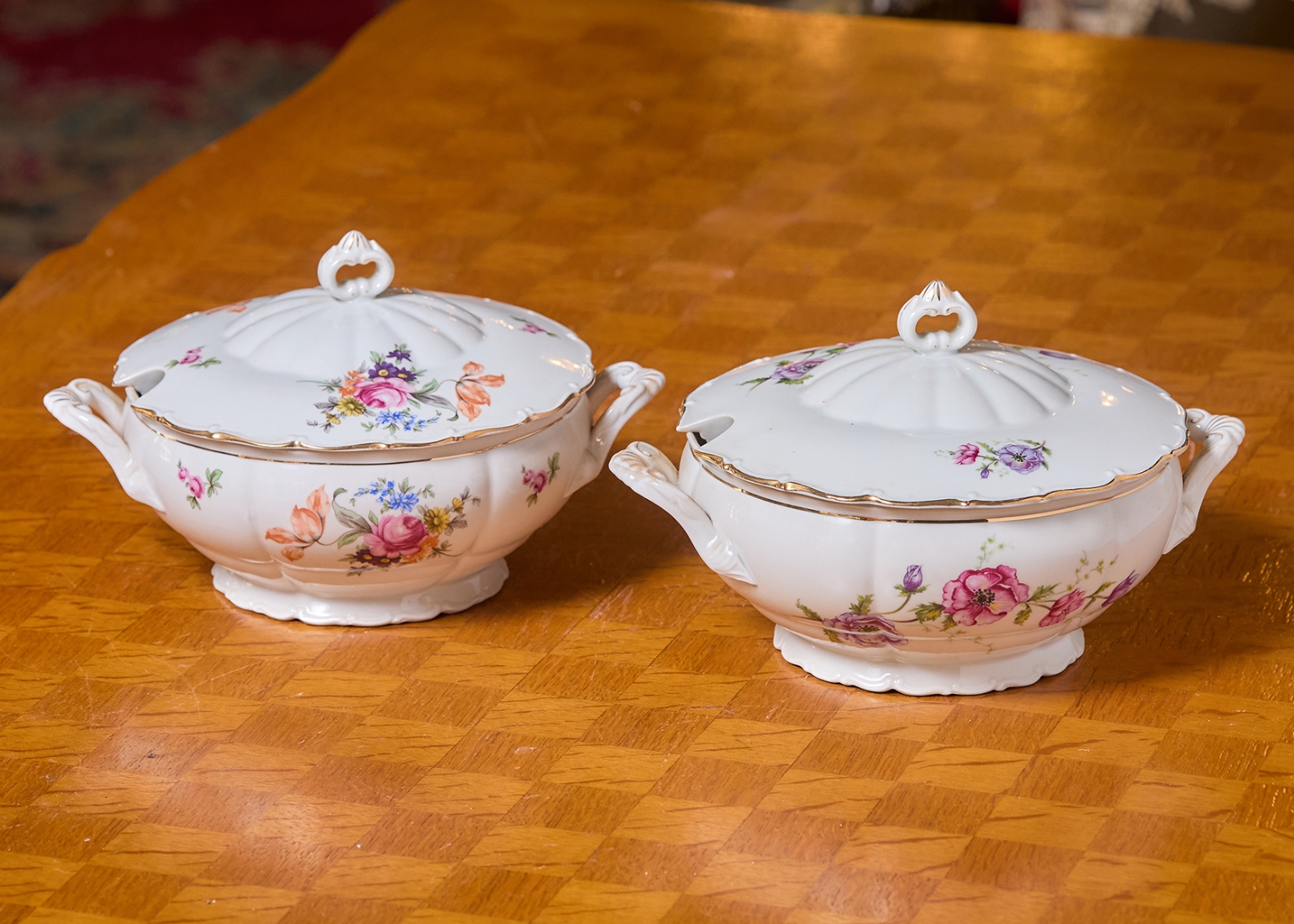 זוג מרקיות פורצלן עם מכסים תואמים מעוטרים פסים פרחוניים ובזהב