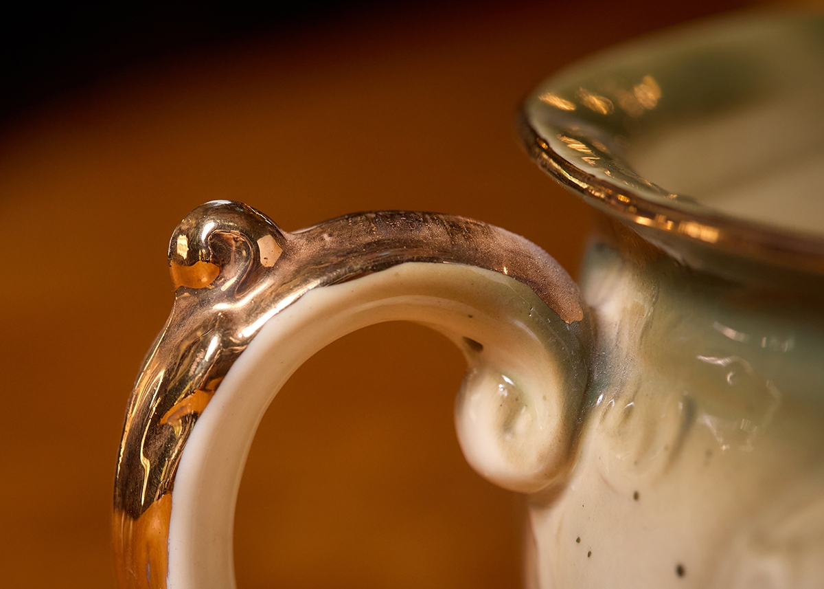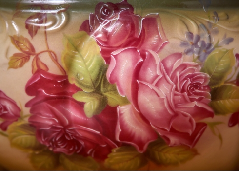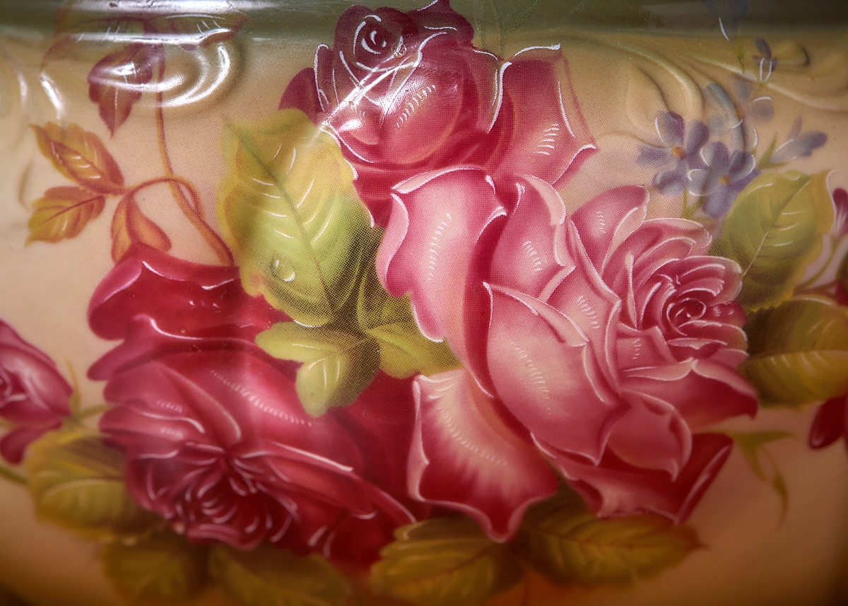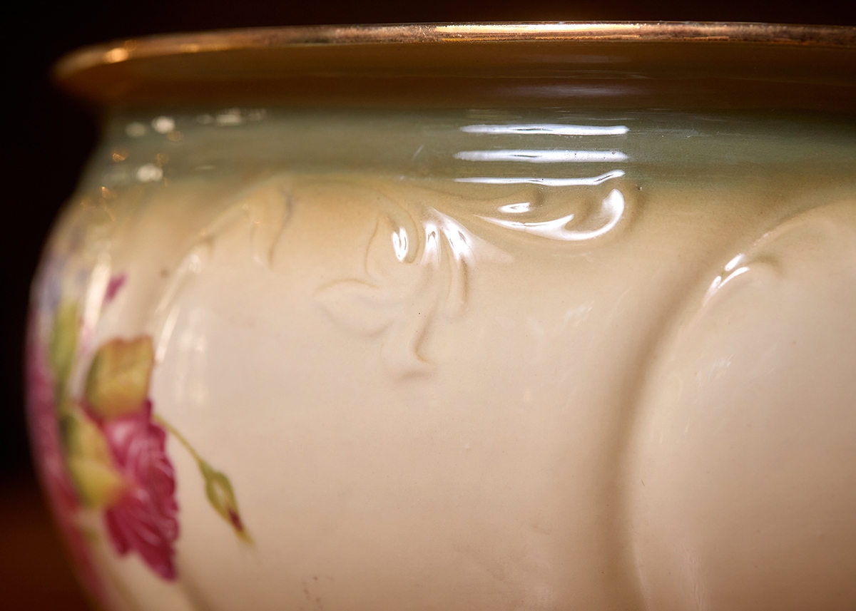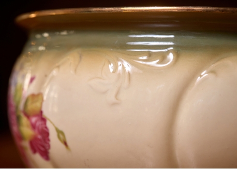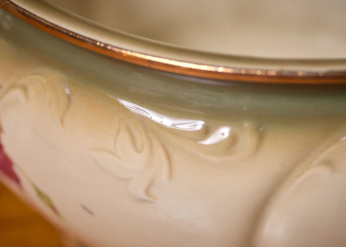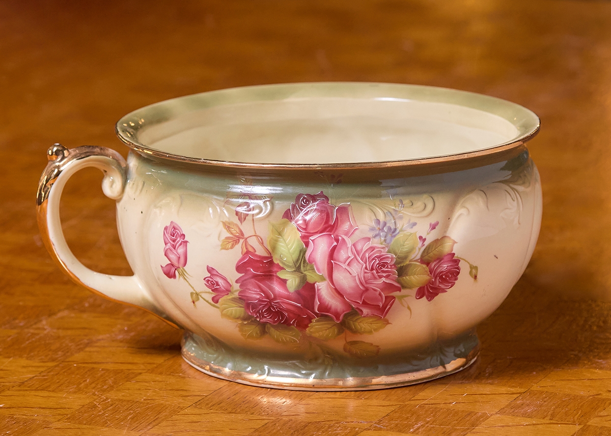 סיר לילה בסגנון עתיק עשוי חרס מעוטר בהדפס שושנים פורחות