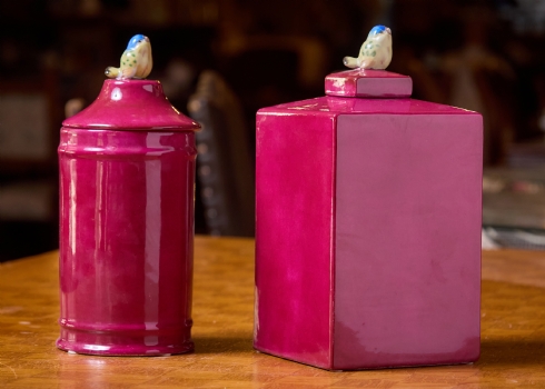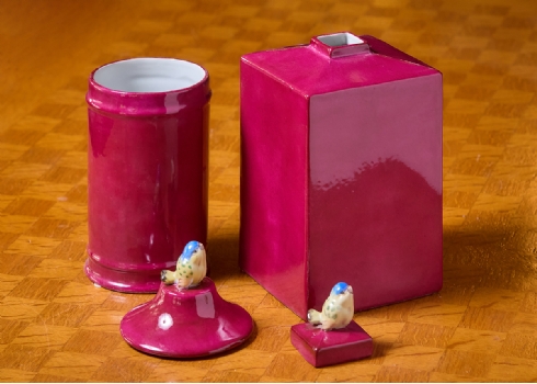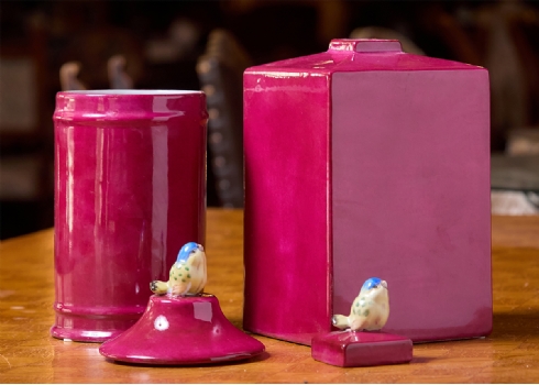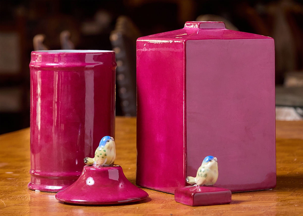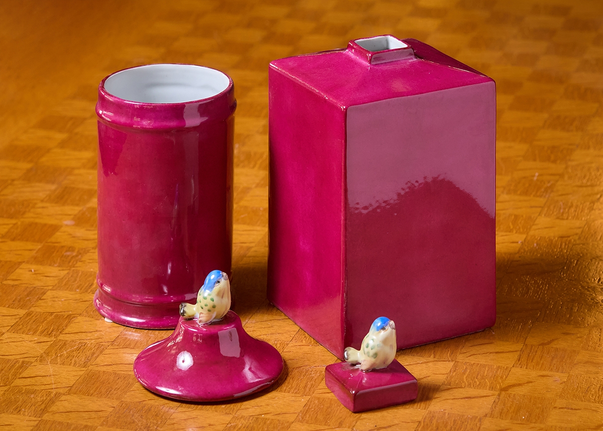 ידיות המכסים מפוסלות בדמות ציפורים, חתומיםרוחב בהתאמה 13,16 ס"מגובה בהתאמה 31,33 ס"מ