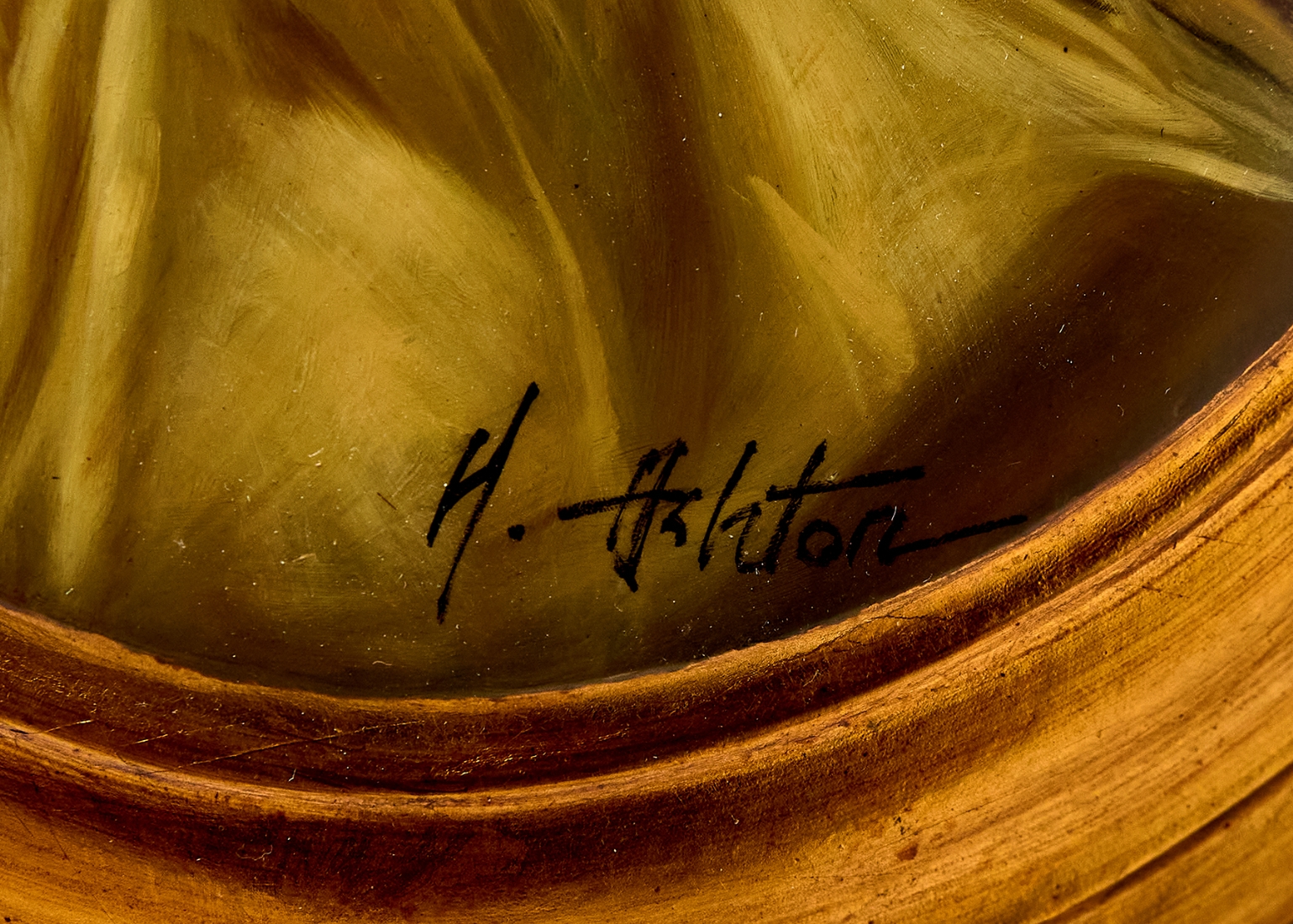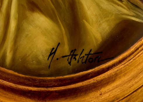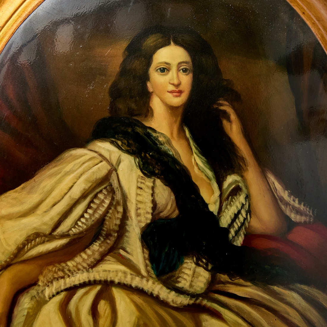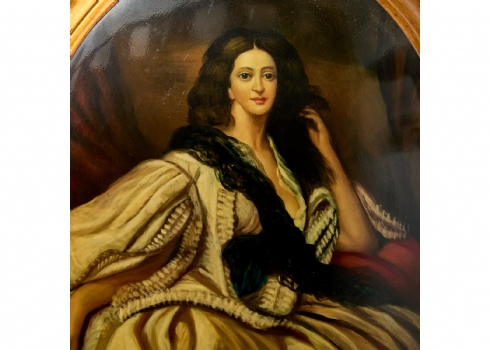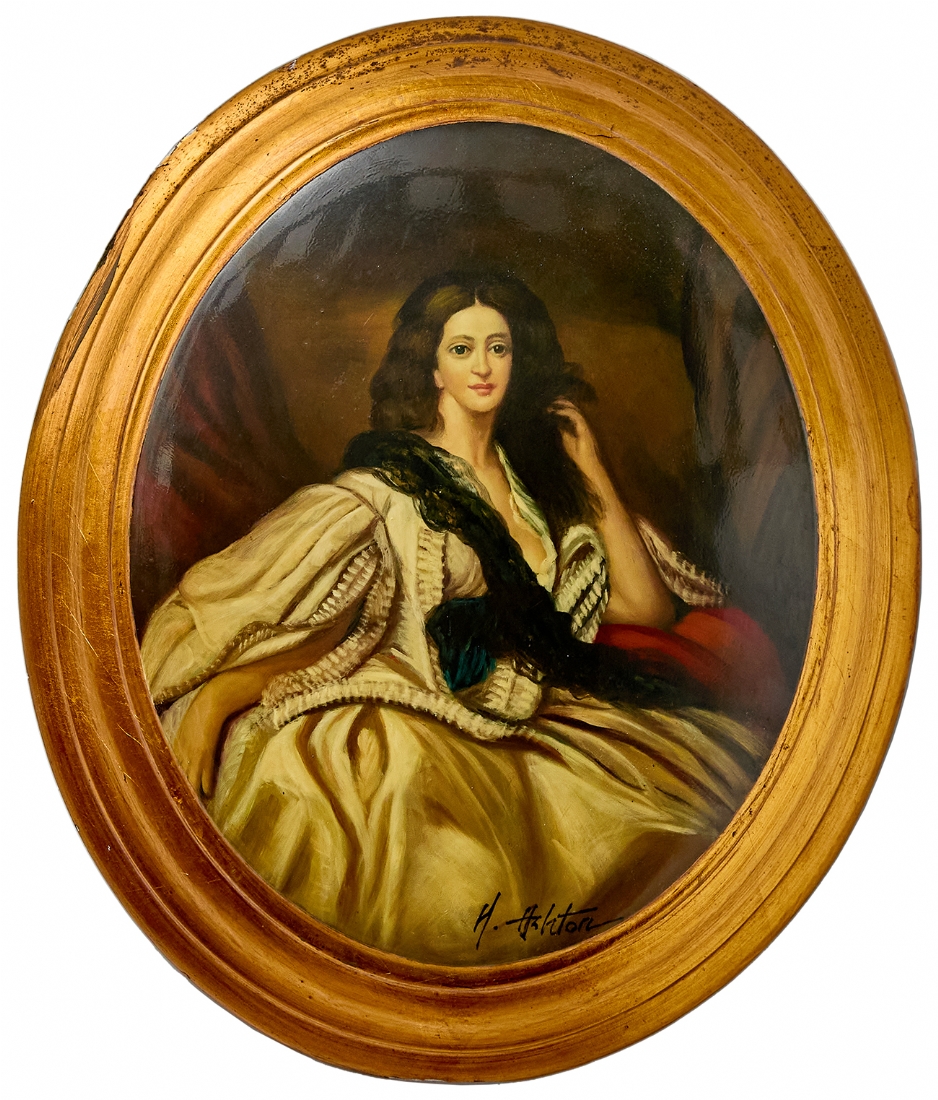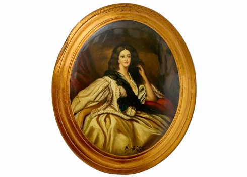 'אצילה בשמלה לבנה לצד כרית אדומה', ציור אובלי על עץ קמור, חתום