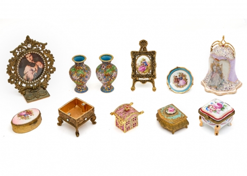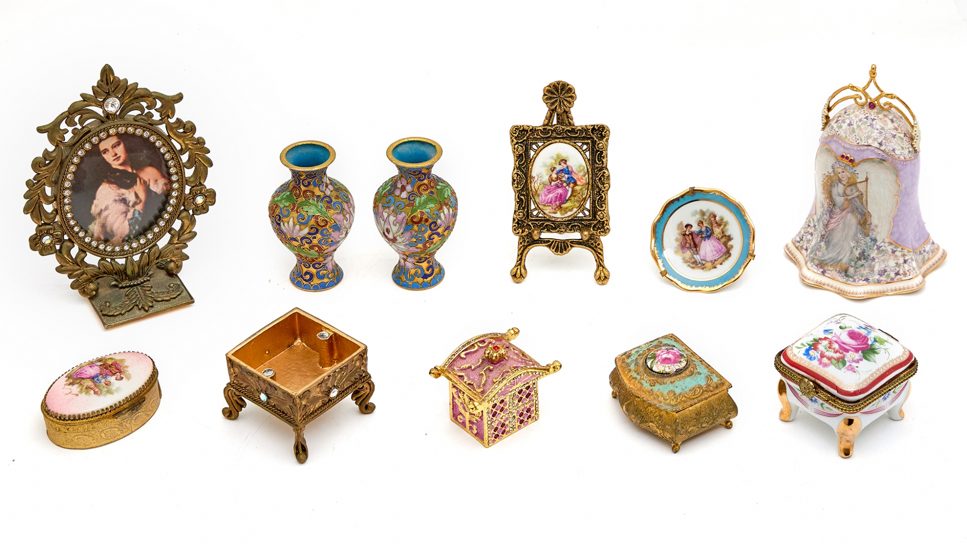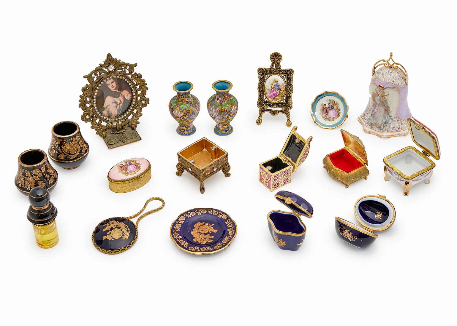 16 חפצי נוי קטנים מיניאטורים עשויים חומרים שונים, מתכת אמייל פורצלן ועוד