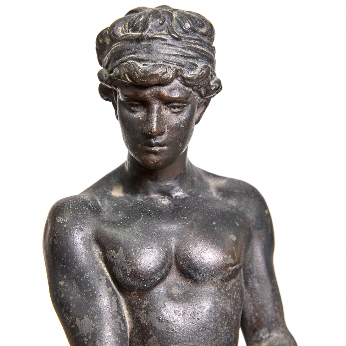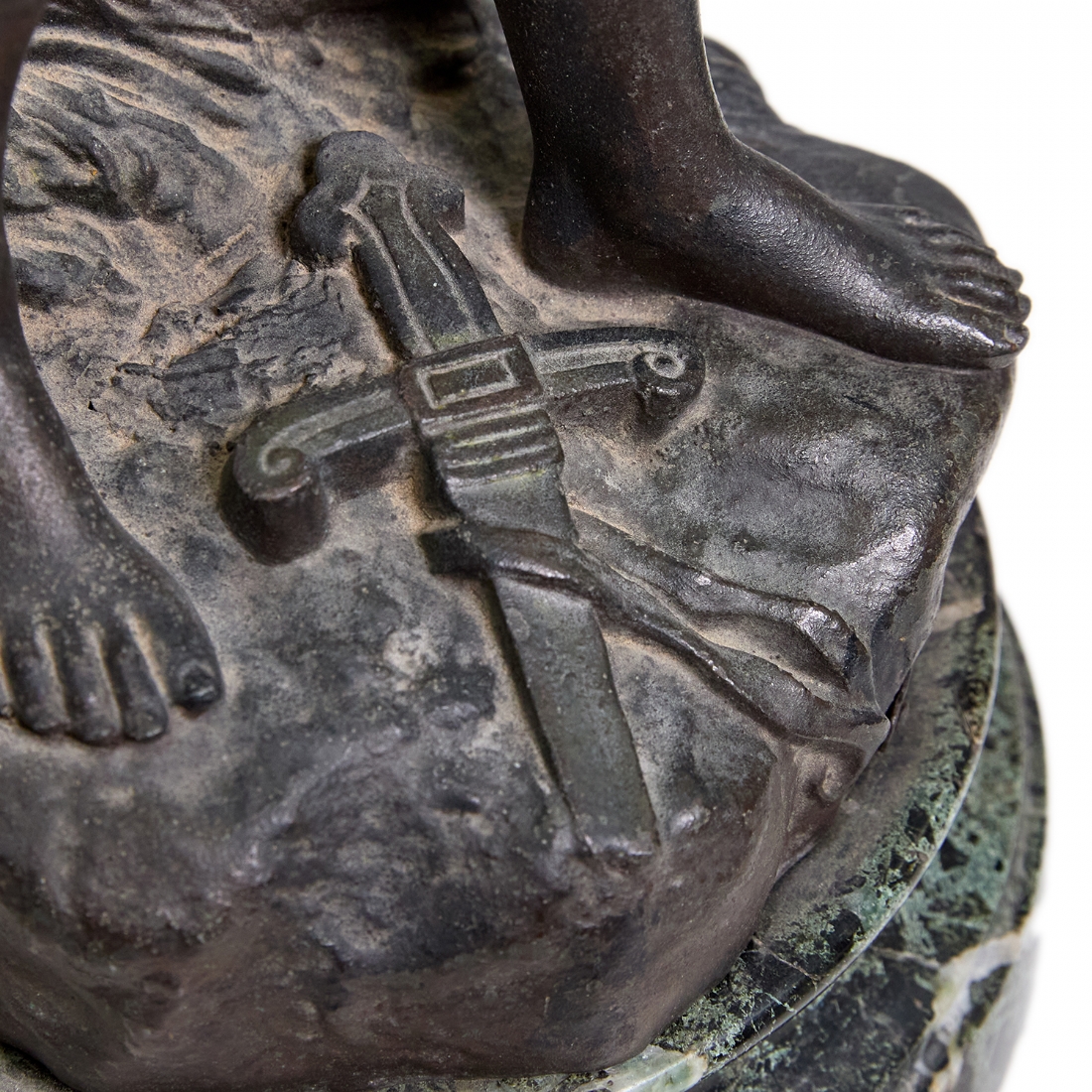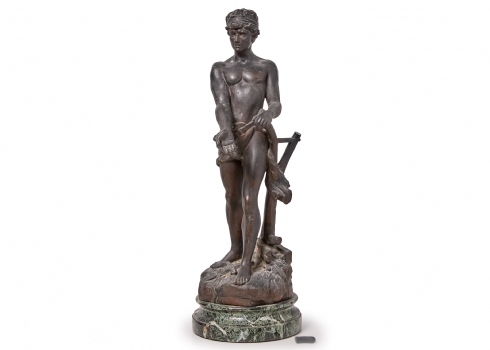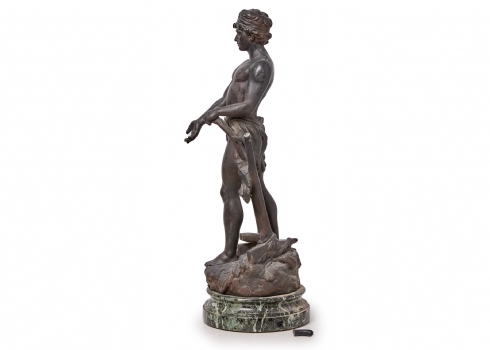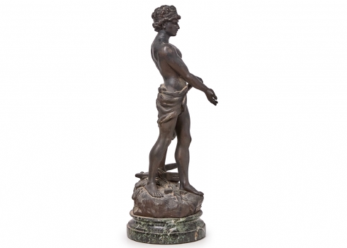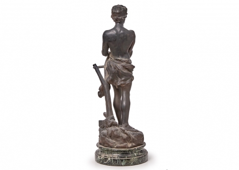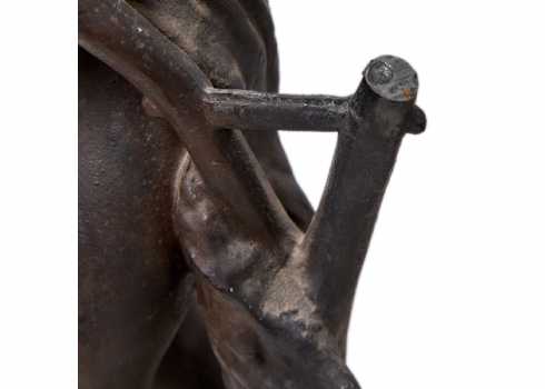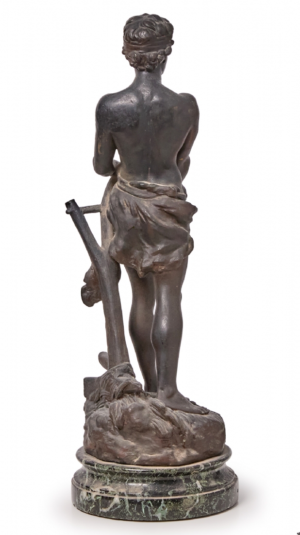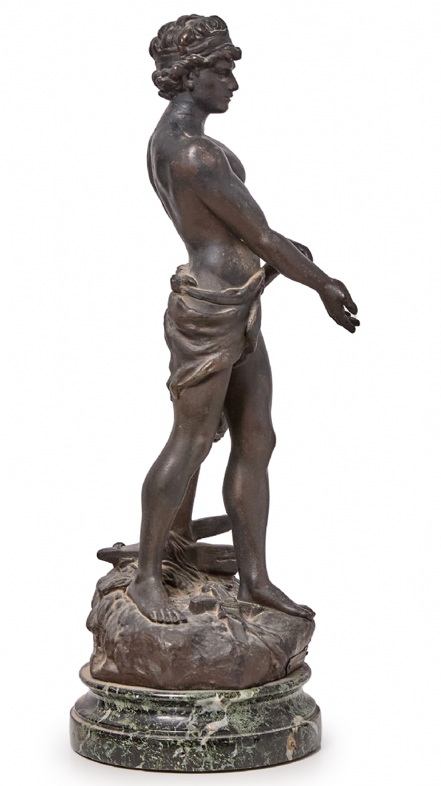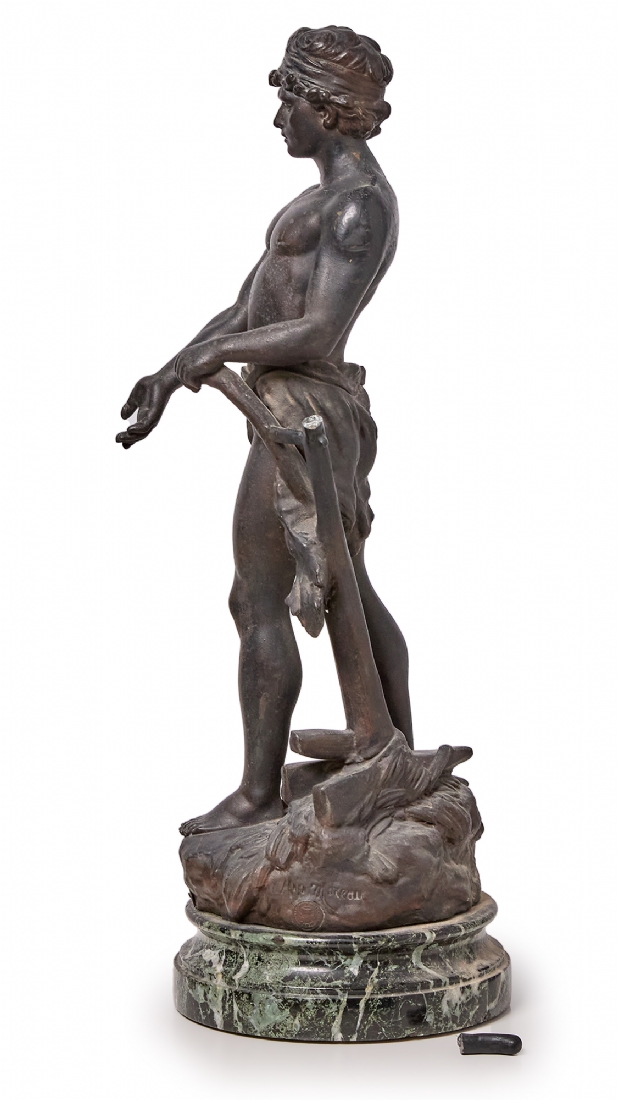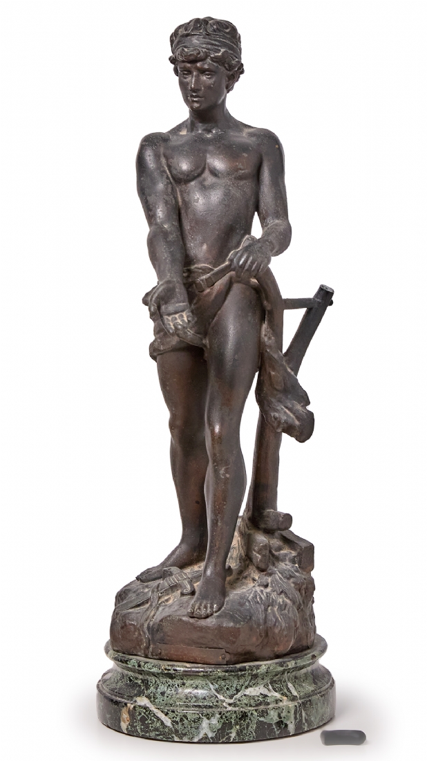 פסל מתכת צרפתי בדמות גברית עם מחרשה וחרב מונחת על הקרקע