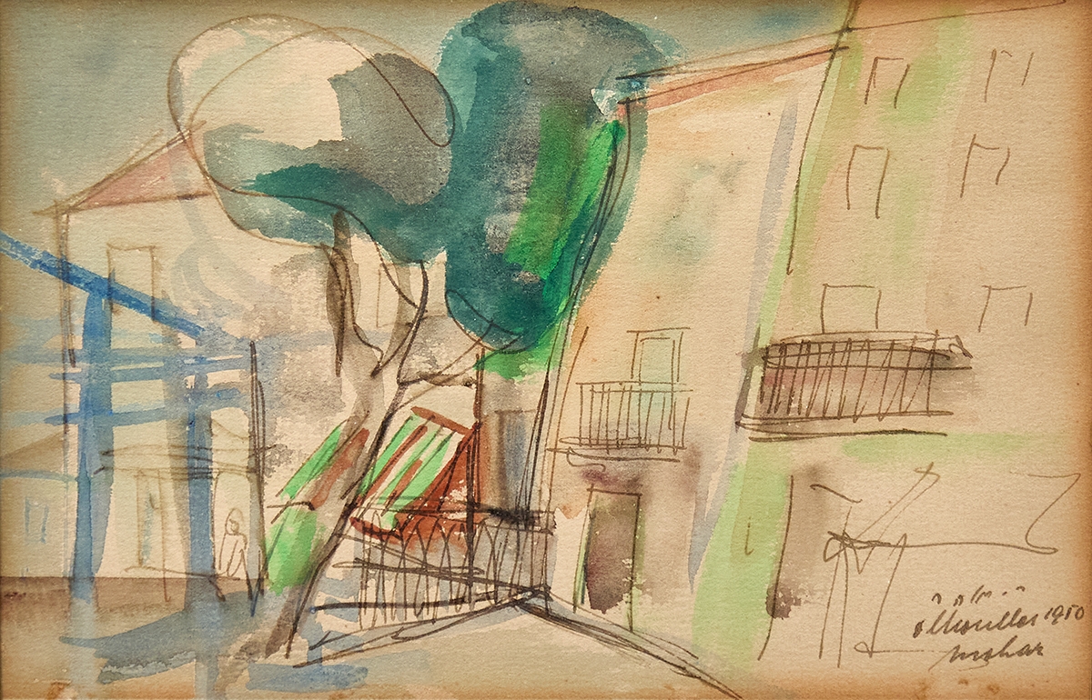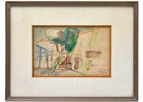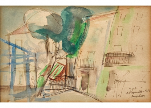 רפאל מוהר (Raphael Mohar) – 'עץ ליד גדר' – רישום ואקוורל על נייר