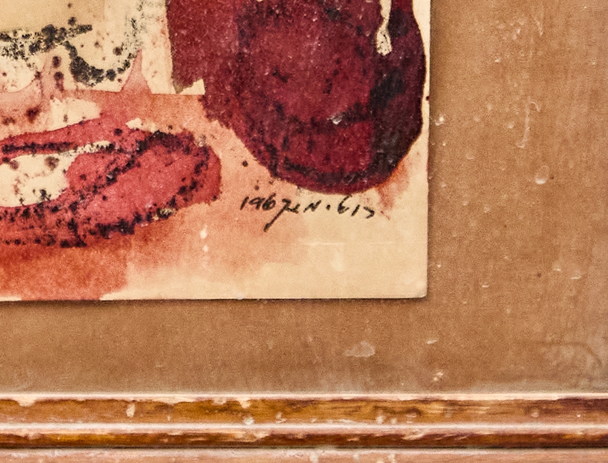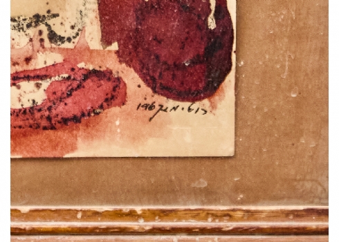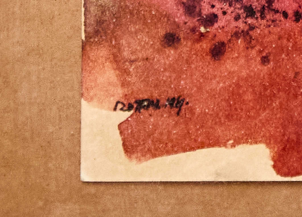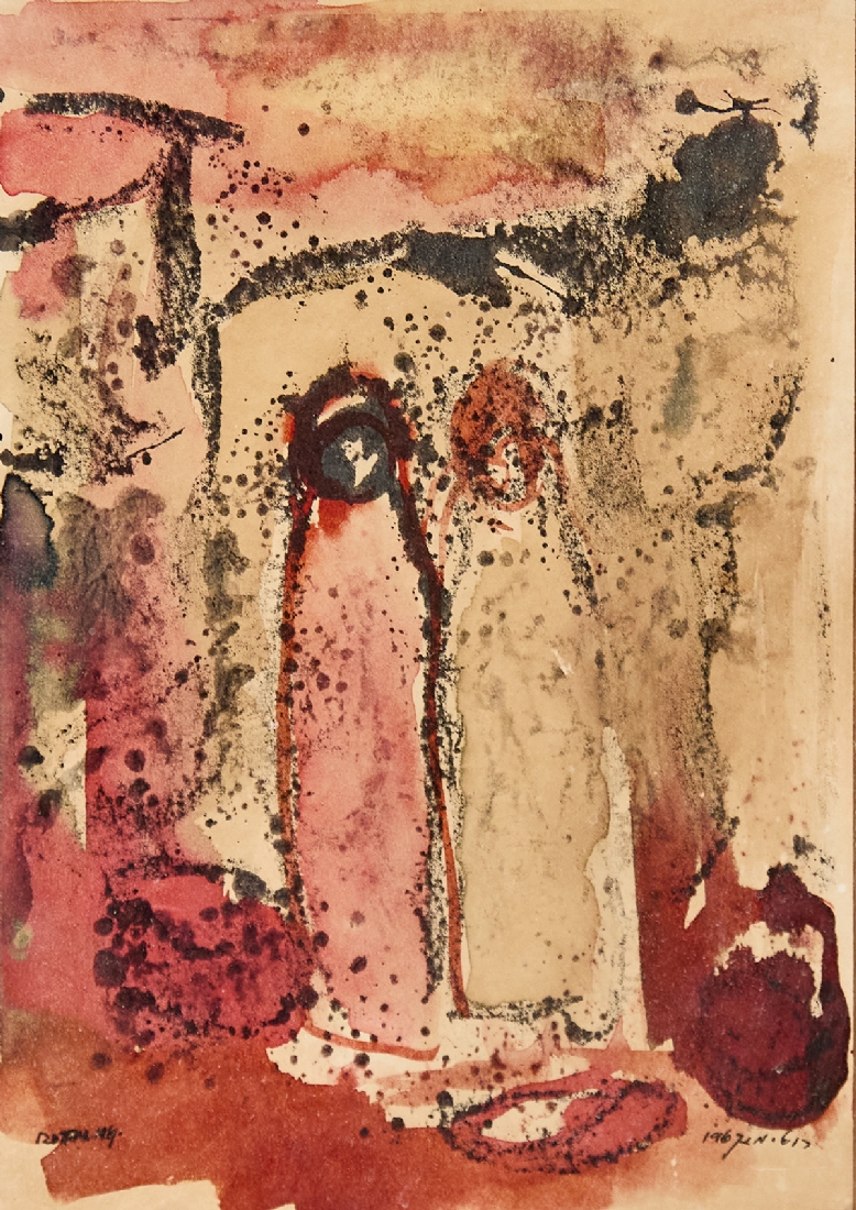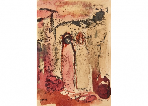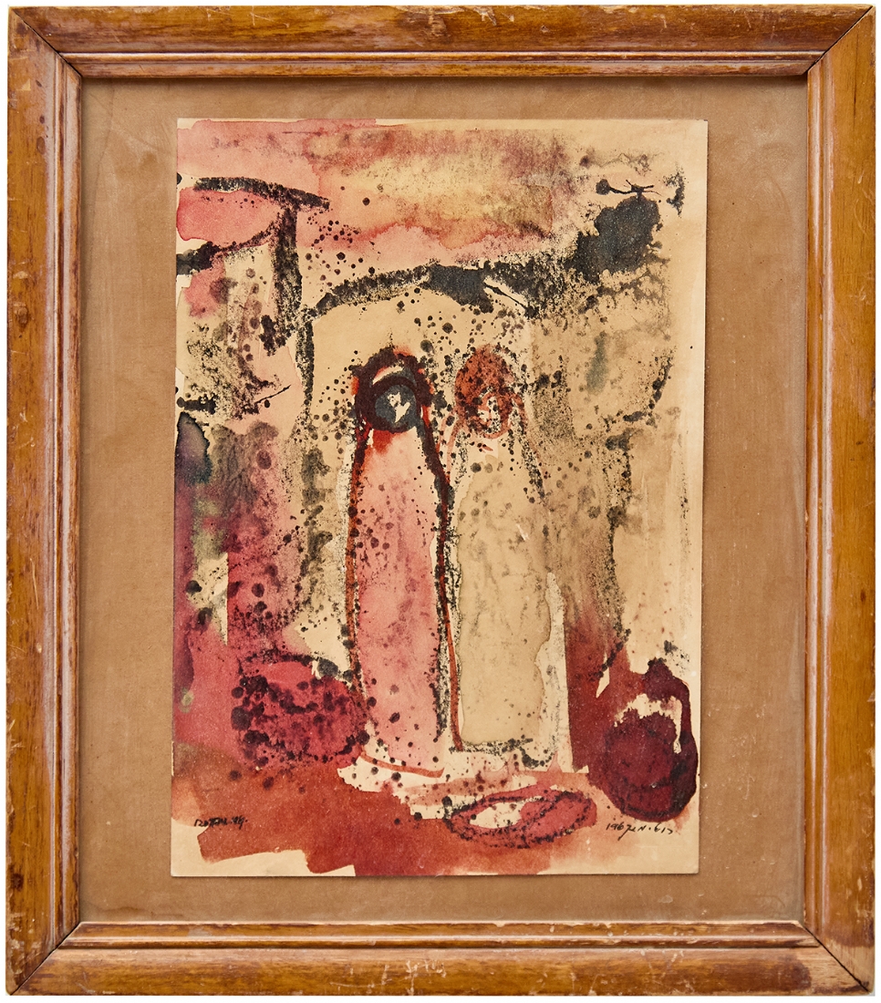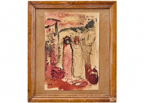 2 דמויות בפתח בית אקוורל על נייר, חתום ומתוארך 1967