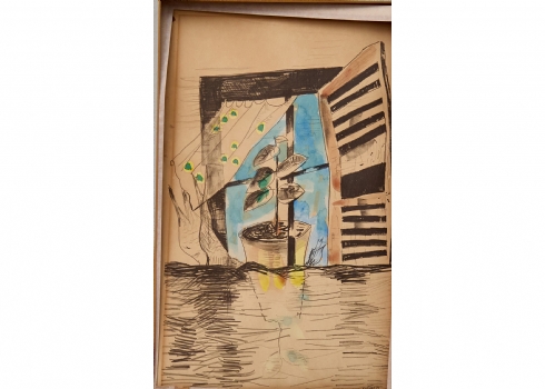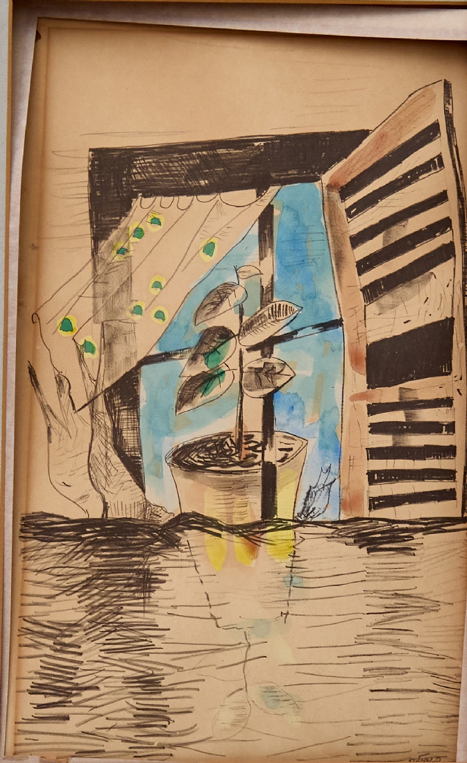 דוד משולם (David Meshulam) – 'עציץ על אדן חלון עם וילון מנוקד'